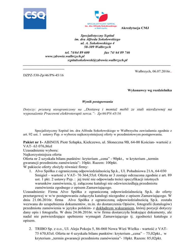 Akredytacja CMJ Specjalistyczny Szpital im. dra Alfreda Sokołowskiego ul. A. Sokołowskiego 4 58-309 Wałbrzych tel. 74/64 89 600 fax 74/ 64 89 746 www.zdrowie.walbrzych.pl [email protected] __________________________________________________________________________________ _______________________ Wałbrzych, 06.07.2016r.. DZPZ-530-Zp/46/PN-45/16 Wykonawcy wg rozdzielnika Wynik postępowania Dotyczy: przetarg nieograniczony na ,,Dostawę i montaŜ mebli ze stali nierdzewnej na wyposaŜenie Pracowni elektroterapii serca.”- Zp/46/PN-45/16 Specjalistyczny Szpital im. dra Alfreda Sokołowskiego w Wałbrzychu zawiadamia zgodnie z art. 92 ust. 1 ustawy Pzp. o wyborze najkorzystniejszej oferty w przedmiotowym postępowaniu. Pakiet nr 1- ABINOX Piotr Szłapka, Kiełczewo, ul. Słoneczna 9B, 64-00 Kościan- wartość z VAT- 63 076,86zł Uzasadnienie wyboru: Najkorzystniejsza oferta Oferta nr 2 uzyskała bilans punktów: kryterium ,,cena” - 90pkt., w kryterium ,,termin gwarancji przedmiotu zamówienia”- 10pkt. Razem: 100pkt. W pakiecie oferty złoŜyły równieŜ firmy: 1. Alvo Spółka z ograniczoną odpowiedzialnością Sp.k., Ul. Południowa 21A, 64-030 Smigiel – wartość z VAT- 76 364,55zł. Oferta nr 3 zostaje odrzucona zgodnie z art. 89 ust. 1 pkt. 2 ustawy Pzp. : jej treść nie odpowiada treści specyfikacji istotnych warunków zamówienia, tj. załączone katalogi nie odzwierciedlają przedmiotu zamówienia zgodnego z opisem Zamawiającego. Uzasadnienie: Firma Alvo Spółka z ograniczoną odpowiedzialnością Sp.k. do oferty przetargowej w w/w postępowaniu załączyła katalogi niezgodne z opisem Zamawiającego. W dniu 21.06.2016r. firma Alvo Spółka z ograniczoną odpowiedzialnością Sp.k. została wezwana do uzupełnienia dokumentów, m.in. do dostarczenia Opisów, fotografii (katalogów) przedmiotu zamówienia w języku polskim- z dokładnym wskazaniem, której pozycji dotyczy dany opis i fotografia. W dniu 24.06.2016r. w/w firma dostarczyła brakujące dokumenty, ale nadal nie potwierdzające spełnienie wymagań Zamawiającego tj. zgodności katalogu z opisem. 2. TRIBO Sp. z o.o., Ul. Aleja Pokoju 5, 86-060 Nowa Wieś Wielka - wartość z VAT75 670,83zł. Oferta nr 4 uzyskała bilans punktów: kryterium ,,cena” – 75,02pkt., w kryterium ,,termin gwarancji przedmiotu zamówienia”- 10pkt. Razem: 85,02pkt. Pakiet nr 2 – INOXMED Monika Pawłowska, Oś. Konstytucji 3 Maja 21/8, 64-000 Kościan– wartość z VAT- 4 644,48zł Uzasadnienie wyboru: Najkorzystniejsza oferta. Oferta nr 1 uzyskała bilans punktów: kryterium ,,cena” - 90pkt., w kryterium ,,termin gwarancji przedmiotu zamówienia”- 10pkt. Razem: 100pkt. W pakiecie oferty złoŜyły równieŜ firmy: 1. ABINOX Piotr Szłapka, Kiełczewo, ul. Słoneczna 9B, 64-00 Kościan- wartość z VAT- 5 040,00zł. Oferta nr 2 uzyskała bilans punktów: kryterium ,,cena” – 82,94pkt., w kryterium ,,termin gwarancji przedmiotu zamówienia”- 10pkt. Razem: 92,94pkt. 2. Alvo Spółka z ograniczoną odpowiedzialnością Sp.k., Ul. Południowa 21A, 64-030 Smigiel – wartość z VAT- 5 621,10zł. Oferta nr 3 zostaje odrzucona zgodnie z art. 89 ust. 1 pkt. 2 ustawy Pzp. : jej treść nie odpowiada treści specyfikacji istotnych warunków zamówienia, tj. załączone katalogi nie odzwierciedlają przedmiotu zamówienia zgodnego z opisem Zamawiającego (brak 1 x podajnik na szczotki; 1 x dozownik płynu dezynfekcyjnego). Uzasadnienie: Firma Alvo Spółka z ograniczoną odpowiedzialnością Sp.k. do oferty przetargowej w w/w postępowaniu załączyła katalogi niezgodne z opisem Zamawiającego. W dniu 21.06.2016r. firma Alvo Spółka z ograniczoną odpowiedzialnością Sp.k. została wezwana do uzupełnienia dokumentów, m.in. do dostarczenia Opisów, fotografii (katalogów) przedmiotu zamówienia w języku polskim- z dokładnym wskazaniem, której pozycji dotyczy dany opis i fotografia. W dniu 24.06.2016r. w/w firma dostarczyła brakujące dokumenty, ale nadal nie potwierdzające spełnienie wymagań Zamawiającego tj. zgodności katalogu z opisem. Pakiet nr 3 – INOXMED Monika Pawłowska, Oś. Konstytucji 3 Maja 21/8, 64-000 Kościan– wartość z VAT- 11 198,52zł Uzasadnienie wyboru: Najkorzystniejsza oferta. Oferta nr 1 uzyskała bilans punktów: kryterium ,,cena” - 90pkt., w kryterium ,,termin gwarancji przedmiotu zamówienia”- 10pkt. Razem: 100pkt. W pakiecie oferty złoŜyły równieŜ firmy: 1. ABINOX Piotr Szłapka, Kiełczewo, ul. Słoneczna 9B, 64-00 Kościan- wartość z VAT- 13 694,41zł. Oferta nr 2 uzyskała bilans punktów: kryterium ,,cena” – 73,60pkt., w kryterium ,,termin gwarancji przedmiotu zamówienia”- 10pkt. Razem: 83,60pkt. 2. Alvo Spółka z ograniczoną odpowiedzialnością Sp.k., Ul. Południowa 21A, 64-030 Smigiel – wartość z VAT- 13 564,80zł. Oferta nr 3 zostaje odrzucona zgodnie z art. 89 ust. 1 pkt. 2 ustawy Pzp. : jej treść nie odpowiada treści specyfikacji istotnych warunków zamówienia, tj. załączone katalogi nie odzwierciedlają przedmiotu zamówienia zgodnego z opisem Zamawiającego. Uzasadnienie: Firma Alvo Spółka z ograniczoną odpowiedzialnością Sp.k. do oferty przetargowej w w/w postępowaniu załączyła katalogi niezgodne z opisem Zamawiającego. W dniu 21.06.2016r. firma Alvo Spółka z ograniczoną odpowiedzialnością Sp.k. została wezwana do uzupełnienia dokumentów, m.in. do dostarczenia Opisów, fotografii (katalogów) przedmiotu zamówienia w języku polskim- z dokładnym wskazaniem, której pozycji dotyczy dany opis i fotografia. W dniu 24.06.2016r. w/w firma dostarczyła brakujące dokumenty, ale nadal nie potwierdzające spełnienie wymagań Zamawiającego tj. zgodności katalogu z opisem. Pakiet nr 4 – INOXMED Monika Pawłowska, Oś. Konstytucji 3 Maja 21/8, 64-000 Kościan– wartość z VAT- 8 595,24zł Uzasadnienie wyboru: Najkorzystniejsza oferta. Oferta nr 1 uzyskała bilans punktów: kryterium ,,cena” - 90pkt., w kryterium ,,termin gw