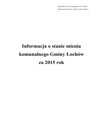Załącznik Nr 2 do Zarządzenia Nr 14/2016 Burmistrza Łochowa z dnia 25 marca 2016 r. Informacja o stanie mienia komunalnego Gminy Łochów za 2015 rok Informacja o stanie mienia komunalnego zawiera dane dotyczące ilości i wartości majątku komunalnego Gminy Łochów. Zestawienie zbiorcze zostało sporządzone na podstawie informacji złożonych przez jednostki organizacyjne i zakład budżetowy, tj.: - Urząd Miejski w Łochowie; - Samorządowy Zakład Gospodarki Komunalnej w Łochowie; - Zespół Obsługi Szkół Samorządowych w Łochowie; - Miejski i Gminny Ośrodek Kultury w Łochowie; - Bibliotekę Publiczną w Łochowie; - Miejsko-Gminny Ośrodek Pomocy Społecznej w Łochowie; - Samorządowy Dom Pomocy Społecznej „Pogodnej Starości” w Ostrówku. Informacje na temat wartości mienia mają charakter księgowy i w związku z tym mogą znacznie odbiegać od swych wartości rynkowych. Wartość majątku Gminy z podziałem na poszczególne składniki mienia komunalnego obrazują dołączone do niniejszej informacji załączniki. W wymienionych załącznikach przedstawiono zmiany wartości w okresie od 01.01.2015 roku do 31.12.2015 roku. Składnikami mienia komunalnego są: grunty, budynki, budowle i urządzenia techniczne, środki transportu, maszyny, urządzenia i pozostałe wyposażenie oraz wartość inwestycji rozpoczętych. „Grunty” – zostały podzielone na działki rolne, leśne, zabudowane i zurbanizowane oraz pozostałe. Powierzchnia działek rolnych na koniec 2015 roku wynosiła ponad 209 ha, a ich wartość szacuje się na kwotę 1.942 tys. zł. Gruntów leśnych zaewidencjonowano około 9 ha o wartości 300 tys. zł. Działki zabudowane i zurbanizowane zajmują powierzchnię ponad 335 ha, natomiast ich wartość ewidencyjna wynosi 4.853 tys. zł. Pozostałe grunty zajmują powierzchnie 3,5 ha o wartości ewidencyjnej równej 135 tys. zł. Łączna wartość ewidencyjna wszystkich gruntów wynosi 7.230 tys. zł. Dokładna wycena każdej działki następuje bezpośrednio przed przygotowaniem do sprzedaży w formie Strona | 1 przetargu. W 2015 roku stan gruntów rolnych zwiększył się o 0,2664 ha, gruntów leśnych zwiększył się o 0,0091 ha, gruntów zabudowanych i zurbanizowanych zwiększył się w stosunku do roku poprzedniego o 1,8708 ha. Stan gruntów pozostałych pozostał na poziomie z roku poprzedniego. W 2015 roku przyjęto głównie przez zakup 2,1463 gruntów na terenie gminy. Z ewidencji gruntów zdjęto 0,9044 ha gruntów rolnych, 0,5253 ha gruntów zabudowanych i zurbanizowanych. Dokonano przekształcenia prawa użytkowania wieczystego w prawo własności gruntów o pow. 0,1929 ha stanowiących działki zabudowane. W 2015 roku sprzedano łącznie 1,6226 ha gruntów na terenie Gminy Łochów. Samorządowy Zakład Gospodarki Komunalnej w Łochowie przekazał na rzecz Gminy Łochów działkę, na której mieści się Stacja Uzdatniania Wody w Łosiewicach o powierzchni 0,66 ha i dokonał korekty podwójnego zapisu działki o powierzchni 0,315 ha. Z tytułu dzierżawy i użytkowania wieczystego działek otrzymano dochody w wysokości 163 tys. zł. Z tytułu sprzedaży oraz przekształcenia prawa użytkowania wieczystego w prawo własności działek będących własnością Gminy Łochów otrzymano dochody w wysokości 379 tys. zł. Koszty wyceny oraz sporządzenia operatów szacunkowych nieruchomości przeznaczonych do sprzedaży wyniosły w 2015 roku 10 tys. zł. W grupie „Budynki” wykazane zostały budynki: Urzędu Miejskiego, szkół, świetlic wiejskich i remiz strażackich, Dom Kultury, Dom Pomocy Społecznej, Ośrodek Julin, szalet miejski, budynki i lokale mieszkalne oraz budynki gospodarcze i letniskowe, blok mieszkalny w Łopiance jak również budynek mieszkalny przy ulicy Nowowiejskiej w Łochowie. W 2015 roku wartość mienia komunalnego Gminy Łochów w dziale „Budynki” została zmieniona przez: - sprzedaż lokalu mieszkalnego w Ostrówku przy ul. XXX-lecia PRL 16 o wartości księgowej 49 133,15 zł; Strona | 2 - termomodernizację budynku Samorządowego Domu Pomocy Społecznej „Pogodnej Starości” w Ostrówku o wartości 74 759,46 zł. W ramach termomodernizacji zamontowano na budynku kolektory słoneczne. - dokonano termomodernizacji budynku Szkoły Podstawowej w Łosiewicach o wartości 232 721,10 zł, szkoły w Julinie o wartości 747 690,49 zł, szkoły w Ogrodnikach na kwotę 386 847,97 zł, na stan szkół przekazano wartość modernizacji wentylacji w Szkole Podstawowej nr 3 w Łochowie w wysokości 65 815,40 zł, termomodernizacji budynku Zespołu Szkół w Gwizdałach 741 944,67 zł, termomodernizacji budynku Zespołu Szkół w miejscowości Kamionna 352 559,44 zł, zwiększono wartość budynku Gimnazjum w Łochowie o 9 313,31 zł oraz Sali sportowej przy Szkole Podstawowej nr 3 w Łochowie o 31 745,98 zł; - dokonano budowy natrysków i osadnika ścieków do budynku Szkoły Podstawowej w Kalinowcu o wartości 5 911,18 zł; - rozbudowano i zmodernizowano budynek świetlicy wiejskiej o powierzchni 144,10 m² w miejscowości Łazy. Wartość projektu to 745 835,22 zł; - dokonano termomodernizacji budynku Miejskiego i Gminnego Domu Kultury w Łochowie o wartości 866 150,41 zł; - zmodernizowano kotłownię przy budynku Urzędu Miejskiego poprzez zakup i montaż pieca grzewczego o wartości 32 914,59 zł; - Samorządowy Dom Pomocy Społecznej „Pogodnej Starości” w Ostrówku dokonał rozbiórki budynku garażowego o wartości 2 637,60 zł pod budowę suszarni. Wpływy do budżetu z tytułu najmu lokali mieszkalnych i użytkowych wyniosły w 2015 roku 269 tys. złotych. Wpływy z tytułu najmu świetlicy w Samorządowym Domu Pomocy Społecznej „Pogodnej Starości” w Ostrówku wyniosły 6,5 tys. zł. W pozycji ”budowle i urządzenia techniczne” znajdują się : - drogi gminne i ulice; Strona | 3 - sieci wodociągowe zasilane z dwóch stacji uzdatniania wody, tj. Ostrówek i Łosiewice oraz stacja w Łoc