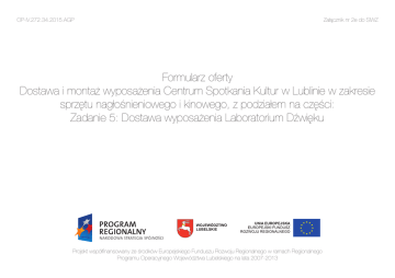 OP-IV.272.34.2015.AGP Załącznik nr 2e do SIWZ Formularz oferty Dostawa i montaż wyposażenia Centrum Spotkania Kultur w Lublinie w zakresie sprzętu nagłośnieniowego i kinowego, z podziałem na części: Zadanie 5: Dostawa wyposażenia Laboratorium Dźwięku Projekt współfinansowany ze środków Europejskiego Funduszu Rozwoju Regionalnego w ramach Regionalnego Programu Operacyjnego Województwa Lubelskiego na lata 2007-2013 pieczęć wykonawcy/ wykonawców wspólnie ubiegających się o udzielenie zamówienia FORMULARZ OFERTY Dane wykonawcy/wykonawców wspólnie ubiegających się o udzielenie zamówienia 1: Nazwa: Adres: Numer telefonu/fax: E- mail: Nip: Regon: Składając ofertę w przetargu nieograniczonym na: Dostawa i montaż wyposażenia Centrum Spotkania Kultur w Lublinie w zakresie sprzętu nagłośnieniowego i kinowego, z podziałem na części: my/ja niżej podpisani/a, działając w imieniu Wykonawcy niniejszym oferujemy wykonanie zamówienia: Zadanie 5: Dostawa wyposażenia Laboratorium Dźwięku za cenę łączną: brutto ………………………………………...…………………………………………………zł, słownie (…………………………………………………..…………………………………….zł) Udzielam gwarancji jakości na zaoferowane przez nas urządzenia stanowiące przedmiot zamówienia na okres ....2 miesięcy (nie krótszy niż 24 miesiące) od daty podpisania przez Zamawiającego protokołu odbioru urządzeń. 1 2 W przypadku Wykonawców wspólnie ubiegających się o udzielenie zamówienia należy podać wszystkich wykonawców; Wykonawca w celu otrzymania dodatkowych punktów w kryterium Gwarancja podaje w ofercie okres gwarancji na okres dłuższy niż 24 miesiące. OP-IV.272.34.2015.AGP Załącznik nr 2e do SIWZ – Formularz ofertowy dla zadania 5 Strona 2 z 22 Działając w imieniu Wykonawcy/Wykonawców wspólnie ubiegających się o udzielenie niniejszego zamówienia oświadczam/y, że: 1. Zaoferowana cena uwzględnia wszelkie koszty związane z realizacją zamówienia w tym w szczególności koszty dostarczenia Przedmiotu Zamówienia do siedziby Zamawiającego, koszty transportu, posadowienia montażu, instalacji, podłączenia do istniejącej sieci elektrycznej, koszt wydania wszelkich wymaganych przez Zamawiającego dokumentów, koszt przeglądu zerowego a także koszty przeprowadzenia instruktażu z zakresu obsługi dostarczonych urządzeń dla minimum sześciu osób wskazanych przez Zamawiającego. Oświadczam, że akceptujemy postanowienia zawarte w projekcie umowy i zobowiązujemy się w przypadku wyboru naszej oferty do zawarcia umowy na warunkach określonych w specyfikacji istotnych warunków zamówienia (projekt umowy), w miejscu i terminie wyznaczonym przez Zamawiającego. 2. Oświadczam, iż zapoznaliśmy się ze specyfikacją istotnych warunków zamówienia i nie wnosimy do niej zastrzeżeń. 3. Oświadczam, iż akceptuję przekazany przez Zamawiającego szczegółowy opis przedmiotu zamówienia (Załącznik nr 1e do SIWZ) oraz wzór umowy (Załącznik nr 3 do SIWZ). 4. Oświadczam, iż w przypadku wyboru naszej oferty zobowiązujemy się do zawarcia umowy na warunkach określonych w specyfikacji istotnych warunków zamówienia. Niniejsza oferta zawiera na stronach nr od ____ do ____ informacje stanowiące tajemnicę przedsiębiorstwa w rozumieniu przepisów o zwalczaniu nieuczciwej konkurencji. W myśl art. 8 ust. 3 ustawy konieczne jest aby Wykonawca nie później niż w terminie składania ofert w danym postępowaniu zastrzegł, że konkretne informacje stanowią tajemnicę przedsiębiorstwa oraz nie mogą zostać udostępnione jak również wykazał, iż informacje te rzeczywiście stanowią tajemnicę przedsiębiorstwa. Nie wykazanie, iż informacje zastrzeżone stanowią tajemnicę przedsiębiorstwa skutkować będzie ujawnieniem tych informacji. W przypadku zwrotu wadium wniesionego w pieniądzu, należy zwrócić je na podany numer konta: Miejscowość, data podpis osoby upoważnionej do reprezentowania Wykonawcy Załącznikami do niniejszej oferty są (wymagane jest dołączenie): • kart katalogowych lub materiałowych lub innych dokumentów potwierdzających zgodność oferowanych urządzeń z wymogami zawartymi w OPZ OP-IV.272.34.2015.AGP Załącznik nr 2e do SIWZ – Formularz ofertowy dla zadania 5 Strona 3 z 22 System komputerowej rejestracji dźwięku oparty o kartę z procesorami DSP i interfejs wejść/wyjść w standardzie MADI nazwa, typ, model Ilość wymagana sztuk: 1 parametry wymagane: oprogramowanie DAW umożliwiające miksowanie 768/384/192 kanałów audio w częstotliwości próbkowania 48/96/192 kHz obsługujące maksymalnie 192 wejścia latencja nie wyższa niż 1 ms 256 ścieżek audio odtwarzanych/nagrywanych jednocześnie minimum 256 ścieżek dla instrumentów wirtualnych minimum 512 ścieżek MIDI 1 minimum 512 ścieżek aux minimum 256 szyn bus minimum 64 ścieżki video 64bitowy silnik miksujący automatyczna kompensacja opóźnień do wartości co najmniej 16000 sampli kompatybilny z systemem Mac OS X i Windows 7 jedna karta DSP ze złączem PCIe wyposażona w minimum 18 procesorów T1 350MHz oraz wejście i wyjście sygnału umożliwiające przesłanie minimum 64 kanałów audio przy częstotliwości próbkowania 44,1 kHz lub o parametrach równoważnych lub lepszych, Interfejs audio wyposażony w minimum 2 złącza MADI (oba) w standardzie optycznym i elektrycznym możliwość synchronizacji do źródeł zegara: AES/EBU, WordClock możliwość konwersji częstotliwości sygnału przychodzącego do częstotliwości w jakiej pracuje sesja nagraniowa możliwość pracy w trybie full channel (64 kanały) i VariSpeed (56 kanałów) OP-IV.272.34.2015.AGP Załącznik nr 2e do SIWZ – Formularz ofertowy dla zadania 5 Strona 4 z 22 Komputer typu all-in-one zintegrowany z monitorem z dodatkowym interfejsem umożliwiającym podłączenie jednej karty PCIe przez