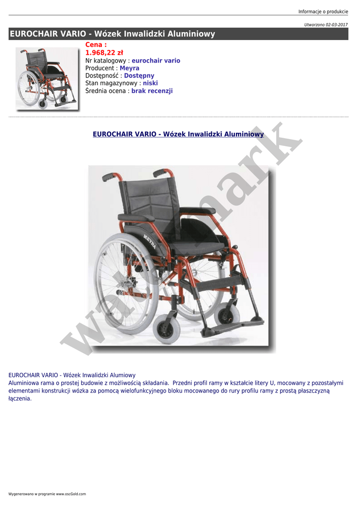 Informacje o produkcie Utworzono 02-03-2017 EUROCHAIR VARIO - Wózek Inwalidzki Aluminiowy Cena : 1.968,22 zł Nr katalogowy : eurochair vario Producent : Meyra Dostępność : Dostępny Stan magazynowy : niski Średnia ocena : brak recenzji w at er m ar k EUROCHAIR VARIO - Wózek Inwalidzki Aluminiowy EUROCHAIR VARIO - Wózek Inwalidzki Alumiowy Aluminiowa rama o prostej budowie z możliwością składania. Przedni profil ramy w kształcie litery U, mocowany z pozostałymi elementami konstrukcji wózka za pomocą wielofunkcyjnego bloku mocowanego do rury profilu ramy z prostą płaszczyzną łączenia. Wygenerowano w programie www.oscGold.com at er m ar k Wielofunkcyjny blok tworzy połączenie ramy siedziska, rury oparcia i wariobloku. Możliwość regulacji wariobloku w 4 ustawieniach pionowych oraz 2 ustawieniach poziomych, łącznie 8 pozycji kombinacji ustawienia. w Wysokość siedziska między 42 - 51,5cm. Szerokość siedziska do 53 cm. Zdejmowane i blokowane podłokietniki i podnóżki. Podłokietniki występują w różnym kształcie i rozmiarze. Boczki wykonane z tworzywa sztucznego. Informacje o produkcie at er m ar k Oparcie i siedzenie obite tekstylnym materiałem w kolorze czarnym . Napęd przez ciąg chwytny lub przez osobę towarzyszącą. Hamulce dociskowe w standardzie. Ergonomiczna regulacja wysokości pasów oparcia i pasów głębokości siedziska bez zamiany części. Głowica widelca koła przedniego z dwustopniową regulacją wysokości oraz regulacją kątową 0°, 2°, 4°. w Widelec z potrójną możliwością ustawienia wysokości koła przedniego Ogumienie kół pneumatyczne, poliuretanowe, pełne gumowe, miękkie pełne i pompowane(dętkowe) Kolory ramy - szaro-srebrny - niebieski morski - bordowy Możliwość indywidualnej adaptacji wózka. Dane techniczne: Wygenerowano w programie www.oscGold.com er m ar k Spis plików do pobrania at 1. Formularz zamówień 2. Katalog produktu w 3. Instrukcja obsługi wózka Chcesz zadać pytań odnośnie tego produkty naciśnij przycisk (proszę o podanie linku lub nazwy produktu) Tagi: Eurochair Vario, Wózki Aktywne, Wózek Aktywny, Wózek Inwalidzki Aktywny, Meyra