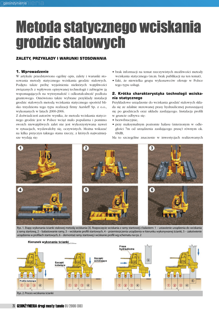geoinżynieria geoinżynieria Metoda statycznego wciskania grodzic stalowych ZALETY, PRZYKŁADY I WARUNKI STOSOWANIA 1. Wprowadzenie W artykule przedstawiono ogólny opis, zalety i warunki stosowania metody statycznego wciskania grodzic stalowych. Podjęto także próbę wyjaśnienia niektórych wątpliwości związanych z wpływem opisywanej technologii i zabiegów ją wspomagających na wytrzymałość i odkształcalność podłoża gruntowego. Omówiono także wybrane przykłady instalacji grodzic stalowych metodą wciskania statycznego spośród blisko trzydziestu tego typu realizacji firmy Aarsleff Sp. z o.o., wykonanych w latach 2000-2006. Z doświadczeń autorów wynika, że metoda wciskania statycznego grodzic jest w Polsce wciąż mało popularna i pomimo swoich niewątpliwych zalet nie jest wykorzystywana nawet w sytuacjach, wydawałoby się, oczywistych. Można wskazać na kilka przyczyn takiego stanu rzeczy, z których najważniejsze wydają się: • brak informacji na temat rzeczywistych możliwości metody wciskania statycznego (m.in. brak publikacji na ten temat), • fakt, że niewielka grupa wykonawców oferuje w Polsce tego typu usługi. 2. Krótka charakterystyka technologii wciskania statycznego Przykładowe urządzenie do wciskania grodzić stalowych składa się ze zdalnie sterowanej prasy hydraulicznej poruszającej się po grodzicach oraz układu zasilającego. Instalacja profili w gruncie odbywa się: • bezwibracyjnie, • przy maksymalnym poziomie hałasu (mierzonym w odległości 7m od urządzenia zasilającego prasę) równym ok. 69dB, Ma to szczególne znaczenie w inwestycjach realizowanych Rys. 1. Etapy wykonania ścianki stalowej metodą wciskania [3]. Rozpoczęcie wciskania z ramy startowej z balastem: 1 – ustawienie urządzenia do wciskania z ramą startową, 2 – balastowanie ramy, 3 – wciskanie profili startowych, 4 – przemieszczenia urządzenia w kierunku wykonywanej ścianki, 5 – zakotwienie urządzenia w profilach startowych, 6 – demontaż ramy startowej i wciskanie profili wg schematu na rys. 2 Rys. 2. Proces wciskania ścianki 26 GEOINŻYNIERIA drogi mosty tunele 01/2006 (08) geoinżynieria geoinżynieria w zwartej zabudowie miejskiej lub w pobliżu wrażliwej infrastruktury podziemnej. Układ zasilający znajduje się zwykle w odległości od kilku do kilkudziesięciu metrów od miejsca instalacji grodzicy i połączony jest z prasą przewodami hydraulicznymi i elektrycznymi. Poniżej na rysunkach pokazano rozpoczęcie wciskania grodzic przy użyciu ramy startowej (rys. 1), proces wciskania ścianki stalowej (rys. 2) oraz mechanizm przemieszczania urządzenia po wcześniej wciśniętych profilach (rys. 3). Prasę mocuje się do przygotowanej wcześniej, specjalnej ramy startowej (rys. 1) lub wbitych inną metodą trzech grodzic stalowych. Ciężar ramy zwiększony ciężarem balastu i ciężarem samego urządzenia lub siły tarcia stanowią przeciwwagę dla realizowanej siły wciskającej. Po zainstalowaniu trzech startowych profili stalowych urządzenie „uniezależnia się” od otaczających warunków terenowych (słabe podłoże, woda) i wciska kolejne profile (rys. 2), wykorzystując nośność na wyciąganie wcześniej wciśniętych profili. Urządzenie samo przemieszcza się po wykonanym fragmencie ścianki (rys. 3). Przydatne do projektowania parametry techniczne najszerzej wykorzystywanego do tej pory w Polsce urządzenia do wciskania grodzic stalowych podano w tab. 1. Urządzenie to ma możliwość samodzielnego wykonania naroży ścianki poprzez wciśniecie czterech profili poprzecznie do dotychczasowego kierunku wciskania (dwóch z lewej i dwóch z prawej strony ścianki). Przestawianie urządzenia na nowy kierunek wciskania odbywa się w takim przypadku przy użyciu dźwigu. Istnieje możliwość wykonania naroży w kształcie łuku bez konieczności wykorzystywania dźwigu. Minimalny promień łuku zależy od rodzaju wciskanego profilu oraz typu wykorzystywanego urządzenia. 3. Uwagi dotyczące wybranych zagadnień projektowych i technologicznych Na podstawie dyskusji z projektantami autorzy artykułu stwierdzili, że wokół technologii zabezpieczania wykopów przy użyciu stalowych ścianek szczelnych narosło wiele, z reguły nieuzasadnionych, wątpliwości wartych przedyskutowania w kontekście użycia metody wciskania statycznego. W zasadzie niesłuszne jest przekonanie o konieczności uwzględniania wpływu podpłukiwania na parametry wytrzymałościowe gruntu (kąt tarcia i spójność), co może prowadzić do zmniejszenia nośności ściany. Pogląd ten zdaniem autorów wynika z niezrozumienia mechanizmu wzbudzania parcia. Naruszenie struktury gruntu w trakcie podpłukiwania ma charakter całkowicie lokalny i dotyczy przylegającego do ściany obszaru o niewielkiej grubości, podczas gdy parcie czynne lub bierne wzbudzane jest poprzez ścięcie gruntu w pasie o znacznej szerokości (w tzw. klinie odłamu). Przytoczona wątpliwość może dotyczyć jedynie gruntów spoistych i ścian za- bezpieczenia wykopu z narzuconymi ostrymi ograniczeniami w zakresie przemieszczeń. Stan parcia rozpatrywany za ścianą ma wówczas charakter pośredni pomiędzy parciem czynnym i spoczynkowym. Lokalne pogorszenie parametrów gruntu za ścianą mogłoby teoretycznie wpływać na tę część oddziaływań, która wiąże się z parciem spoczynkowym, lecz zdaniem autorów jest to zagadnienie czysto teoretyczne, które w praktyce projektowej można i należy pominąć. Uzasadniona jest natomiast obawa, że wciskanie ściany szczelnej z podpłukiwaniem w grunty pęczniejące wywoła jej dodatkowe obciążenia. W Polsce zjawisko to dotyczy głównie iłów plioceńskich. Ryzyko pęcznienia nie oznacza, że wystąpi ono we wszystkich przypadkach napotkania gruntów pęczniejących, niemniej należy taką możliwość przeanalizować na etapie projektowania. W praktyce niebezpieczeństwo wzbudzenia pęcznienia dotyczy głównie wyst