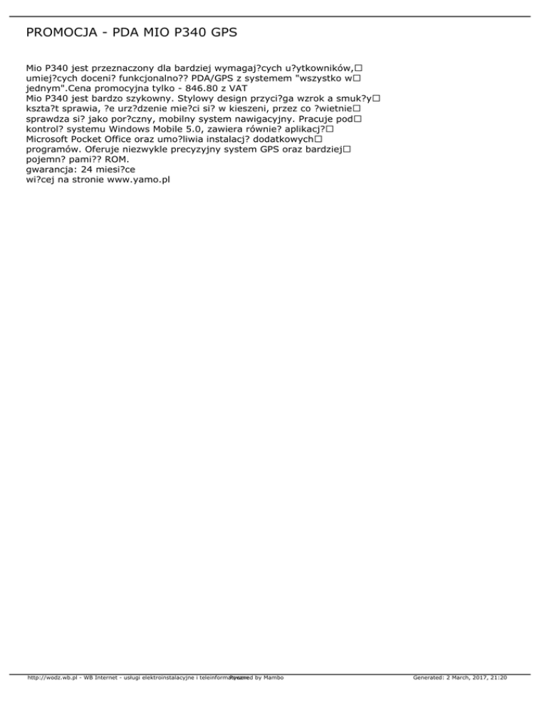PROMOCJA - PDA MIO P340 GPS Mio P340 jest przeznaczony dla bardziej wymagaj?cych u?ytkowników, umiej?cych doceni? funkcjonalno?? PDA/GPS z systemem "wszystko w jednym".Cena promocyjna tylko - 846.80 z VAT Mio P340 jest bardzo szykowny. Stylowy design przyci?ga wzrok a smuk?y kszta?t sprawia, ?e urz?dzenie mie?ci si? w kieszeni, przez co ?wietnie sprawdza si? jako por?czny, mobilny system nawigacyjny. Pracuje pod kontrol? systemu Windows Mobile 5.0, zawiera równie? aplikacj? Microsoft Pocket Office oraz umo?liwia instalacj? dodatkowych programów. Oferuje niezwykle precyzyjny system GPS oraz bardziej pojemn? pami?? ROM. gwarancja: 24 miesi?ce wi?cej na stronie www.yamo.pl http://wodz.wb.pl - WB Internet - usługi elektroinstalacyjne i teleinformatyczne Powered by Mambo Generated: 2 March, 2017, 21:20