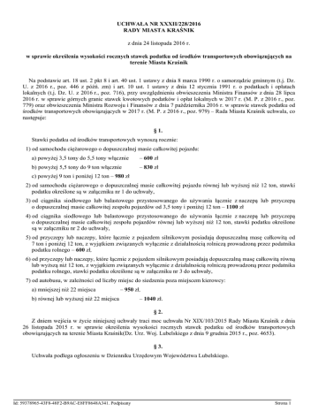 UCHWAŁA NR XXXII/228/2016 RADY MIASTA KRAŚNIK z dnia 24 listopada 2016 r. w sprawie określenia wysokości rocznych stawek podatku od środków transportowych obowiązujących na terenie Miasta Kraśnik Na podstawie art. 18 ust. 2 pkt 8 i art. 40 ust. 1 ustawy z dnia 8 marca 1990 r. o samorządzie gminnym (t.j. Dz. U. z 2016 r., poz. 446 z późń. zm) i art. 10 ust. 1 ustawy z dnia 12 stycznia 1991 r. o podatkach i opłatach lokalnych (t.j. Dz. U. z 2016 r., poz. 716), przy uwzględnieniu obwieszczenia Ministra Finansów z dnia 28 lipca 2016 r. w sprawie górnych granic stawek kwotowych podatków i opłat lokalnych w 2017 r. (M. P. z 2016 r., poz. 779) oraz obwieszczenia Ministra Rozwoju i Finansów z dnia 7 października 2016 r. w sprawie stawek podatku od środków transportowych obowiązujących w 2017 r. (M. P. z 2016 r., poz. 979) – Rada Miasta Kraśnik uchwala, co następuje: § 1. Stawki podatku od środków transportowych wynoszą rocznie: 1) od samochodu ciężarowego o dopuszczalnej masie całkowitej pojazdu: a) powyżej 3,5 tony do 5,5 tony włącznie – 600 zł b) powyżej 5,5 tony do 9 ton włącznie – 830 zł c) powyżej 9 ton i poniżej 12 ton – 980 zł 2) od samochodu ciężarowego o dopuszczalnej masie całkowitej pojazdu równej lub wyższej niż 12 ton, stawki podatku określone są w załączniku nr 1 do uchwały, 3) od ciągnika siodłowego lub balastowego przystosowanego do używania łącznie z naczepą lub przyczepą o dopuszczalnej masie całkowitej zespołu pojazdów od 3,5 tony i poniżej 12 ton – 1100 zł 4) od ciągnika siodłowego lub balastowego przystosowanego do używania łącznie z naczepą lub przyczepą o dopuszczalnej masie całkowitej zespołu pojazdów równej lub wyższej niż 12 ton, stawki podatku określone są w załączniku nr 2 do uchwały, 5) od przyczepy lub naczepy, które łącznie z pojazdem silnikowym posiadają dopuszczalną masę całkowitą od 7 ton i poniżej 12 ton, z wyjątkiem związanych wyłącznie z działalnością rolniczą prowadzoną przez podatnika podatku rolnego – 600 zł, 6) od przyczepy lub naczepy, które łącznie z pojazdem silnikowym posiadają dopuszczalną masę całkowitą równą lub wyższą niż 12 ton, z wyjątkiem związanych wyłącznie z działalnością rolniczą prowadzoną przez podatnika podatku rolnego, stawki podatku określone są w załączniku nr 3 do uchwały, 7) od autobusu, w zależności od liczby miejsc do siedzenia poza miejscem kierowcy: a) mniejszej niż 22 miejsca – 950 zł, b) równej lub wyższej niż 22 miejsca – 1040 zł. § 2. Z dniem wejścia w życie niniejszej uchwały traci moc uchwała Nr XIX/103/2015 Rady Miasta Kraśnik z dnia 26 listopada 2015 r. w sprawie określenia wysokości rocznych stawek podatku od środków transportowych obowiązujących na terenie Miasta Kraśnik(Dz. Urz. Woj. Lubelskiego z dnia 9 grudnia 2015 r., poz. 4653). § 3. Uchwała podlega ogłoszeniu w Dzienniku Urzędowym Województwa Lubelskiego. Id: 59378965-43F8-48F2-B9AC-E8FF8648A341. Podpisany Strona 1 § 4. Wykonanie uchwały powierza się Burmistrzowi Miasta Kraśnik. § 5. Uchwała wchodzi w życie po upływie 14 dni od dnia ogłoszenia, nie wcześniej jednak niż z dniem 1 stycznia 2017 roku. Przewodniczący Rady Miasta Kraśnik Jan Albiniak Id: 59378965-43F8-48F2-B9AC-E8FF8648A341. Podpisany Strona 2 Załącznik nr 1 Stawki podatku od samochodów ciężarowych o dopuszczalnej masie całkowitej równej lub wyższej niż 12 ton Dopuszczalna masa całkowita w tonach nie mniej niż mniej niż Stawka podatku dla Stawka podatku dla samochodów z samochodów z Liczba zawieszeniem innymi systemami osi pneumatycznym zawieszenia osi lub zawieszeniem jezdnych (w zł) jezdnych uznanym za równoważne (w zł) Dwie osie 12 13 1200 1210 13 14 1210 1220 14 15 1220 1250 1250 1500 15 Trzy osie 12 17 1320 1330 17 19 1330 1340 19 21 1340 1360 21 23 1360 1370 23 25 1370 1800 1500 1800 25 Cztery osie i więcej 12 25 1800 1700 25 27 1820 1740 27 29 1840 1880 29 31 1880 2700 1880 2700 31 Id: 59378965-43F8-48F2-B9AC-E8FF8648A341. Podpisany Strona 3 Załącznik nr 2 Stawki podatku od ciągników siodłowych i balastowych przystosowanych do używania łącznie z naczepą lub przyczepą o dopuszczalnej masie całkowitej zespołu pojazdów równej lub wyższej niż 12 ton Dopuszczalna masa całkowita zespołu pojazdów: ciągnik siodłowy + naczepa; ciągnik balastowy + przyczepa (w tonach) nie mniej niż Stawka podatku dla Stawka podatku dla ciągników z ciągników z innymi Liczba zawieszeniem systemami osi pneumatycznym zawieszenia osi lub uznanym za jezdnych (w zł) jezdnych równoważne (w zł) mniej niż Dwie 12 18 1300 1350 18 25 1350 1400 25 31 1400 1450 1700 2280 1800 1950 1950 2800 31 Trzy osie i więcej 12 40 40 Id: 59378965-43F8-48F2-B9AC-E8FF8648A341. Podpisany Strona 4 Załącznik nr 3 Stawki podatku od przyczep i naczep, które łącznie z pojazdem silnikowym posiadają dopuszczalną masę całkowitą równą lub wyższą niż 12 ton Dopuszczalna masa całkowita zespołu pojazdów: przyczepa (naczepa + pojazd silnikowy) (w tonach) nie mniej niż Stawka podatku dla Stawka podatku dla przyczep i naczep przyczep Liczba z zawieszeniem i naczep z innymi osi pneumatycznym systemami lub uznanym za zawieszenia osi jezdnych równoważne (w zł) jezdnych (w zł) mniej niż Jedna oś 12 18 550 660 18 25 660 670 670 770 25 Dwie osie 12 28 640 700 28 33 830 1060 33 38 1060 1510 1500 1920 950 1160 1160 1500 38 Trzy osie i więcej 12 38 38 Id: 59378965-43F8-48F2-B9AC-E8FF8648A341. Podpisany Strona 5