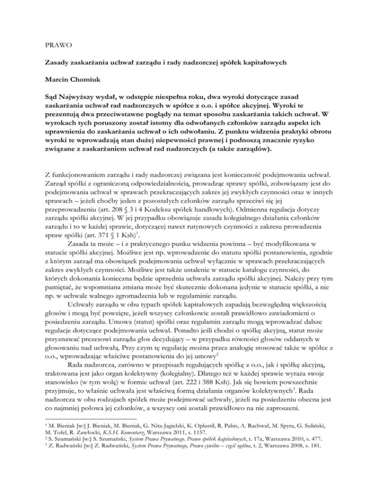 PRAWO Zasady zaskarżania uchwał zarządu i rady nadzorczej spółek kapitałowych Marcin Chomiuk Sąd Najwyższy wydał, w odstępie niespełna roku, dwa wyroki dotyczące zasad zaskarżania uchwał rad nadzorczych w spółce z o.o. i spółce akcyjnej. Wyroki te prezentują dwa przeciwstawne poglądy na temat sposobu zaskarżania takich uchwał. W wyrokach tych poruszony został istotny dla odwołanych członków zarządu aspekt ich uprawnienia do zaskarżania uchwał o ich odwołaniu. Z punktu widzenia praktyki obrotu wyroki te wprowadzają stan dużej niepewności prawnej i podnoszą znacznie ryzyko związane z zaskarżaniem uchwał rad nadzorczych (a także zarządów). Z funkcjonowaniem zarządu i rady nadzorczej związana jest konieczność podejmowania uchwał. Zarząd spółki z ograniczoną odpowiedzialnością, prowadząc sprawy spółki, zobowiązany jest do podejmowania uchwał w sprawach przekraczających zakres jej zwykłych czynności oraz w innych sprawach – jeżeli choćby jeden z pozostałych członków zarządu sprzeciwi się jej przeprowadzeniu (art. 208 § 3 i 4 Kodeksu spółek handlowych). Odmienna regulacja dotyczy zarządu spółki akcyjnej. W jej przypadku obowiązuje zasada kolegialnego działania członków zarządu i to w każdej sprawie, dotyczącej nawet rutynowych czynności z zakresu prowadzenia spraw spółki (art. 371 § 1 Ksh)1. Zasada ta może – i z praktycznego punku widzenia powinna – być modyfikowana w statucie spółki akcyjnej. Możliwe jest np. wprowadzenie do statutu spółki postanowienia, zgodnie z którym zarząd ma obowiązek podejmowania uchwał wyłącznie w sprawach przekraczających zakres zwykłych czynności. Możliwe jest także ustalenie w statucie katalogu czynności, do których dokonania konieczna będzie uprzednia uchwała zarządu spółki akcyjnej. Należy przy tym pamiętać, że wspomniana zmiana może być skutecznie dokonana jedynie w statucie spółki, a nie np. w uchwale walnego zgromadzenia lub w regulaminie zarządu. Uchwały zarządu w obu typach spółek kapitałowych zapadają bezwzględną większością głosów i mogą być powzięte, jeżeli wszyscy członkowie zostali prawidłowo zawiadomieni o posiedzeniu zarządu. Umowa (statut) spółki oraz regulamin zarządu mogą wprowadzać dalsze regulacje dotyczące podejmowania uchwał. Ponadto jeśli chodzi o spółkę akcyjną, statut może przyznawać prezesowi zarządu głos decydujący – w przypadku równości głosów oddanych w głosowaniu nad uchwałą. Przy czym tę regulację można przez analogię stosować także w spółce z o.o., wprowadzając właściwe postanowienia do jej umowy2 Rada nadzorcza, zarówno w przepisach regulujących spółkę z o.o., jak i spółkę akcyjną, traktowana jest jako organ kolektywny (kolegialny). Dlatego też w każdej sprawie wyraża swoje stanowisko (w tym wolę) w formie uchwał (art. 222 i 388 Ksh). Jak się bowiem powszechnie przyjmuje, to właśnie uchwała jest właściwą formą działania organów kolektywnych3. Rada nadzorcza w obu rodzajach spółek może podejmować uchwały, jeżeli na posiedzeniu obecna jest co najmniej połowa jej członków, a wszyscy oni zostali prawidłowo na nie zaproszeni. M. Bieniak [w:] J. Bieniak, M. Bieniak, G. Nita-Jagielski, K. Oplustil, R. Pabis, A. Rachwał, M. Spyra, G. Suliński, M. Tofel, R. Zawłocki, K.S.H. Komentarz, Warszawa 2011, s. 1157. 2 S. Szumański [w:] S. Szumański, System Prawa Prywatnego. Prawo spółek kapitałowych, t. 17a, Warszawa 2010, s. 477. 3 Z. Radwański [w:] Z. Radwański, System Prawa Prywatnego, Prawo cywilne – część ogólna, t. 2, Warszawa 2008, s. 181. 1 Uchwały rady nadzorczej spółki akcyjnej zapadają bezwzględną większością głosów. Statut może przewidywać, że w przypadku równości głosów rozstrzyga głos przewodniczącego rady nadzorczej. W statucie mogą zostać wprowadzone surowsze wymagania dotyczące kworum, jak i inna (surowsza albo łagodniejsza) większość głosów wymaganych do podjęcia każdego rodzaju uchwał albo uchwał o określonym przedmiocie. W przepisach Ksh brak jest natomiast szczególnej regulacji dotyczącej większości głosów wymaganej do podjęcia uchwały przez radę nadzorczą spółki z o.o. Należy zatem przyjąć ogólną zasadę, że do podjęcia uchwały wystarczająca będzie zwykła większość głosów4. Przy czym, jak już wyżej wspomniano, na posiedzeniu obecna musi być co najmniej połowa jej członków (art. 222 § 1 Ksh). Uchwały zarządu dotyczą zazwyczaj ważnych kwestii z zakresu prowadzenia spraw spółki. Także uchwały rady nadzorczej, szczególnie w spółce akcyjnej, mogą obejmować niezwykle istotne dla spółki oświadczenia – np. o powołaniu lub odwołaniu oraz zawieszaniu członków zarządu, a także o delegowaniu członków rady nadzorczej do czasowego wykonywania czynności członków zarządu. W przypadku wadliwości takiej uchwały powstaje wątpliwość co do prawidłowości powołania lub odwołania członka zarządu, co może z kolei paraliżować działanie spółki. Dlatego też niezwykle ważnym zagadnieniem jest sposób zaskarżania uchwał obu organów. W przyszłości problem ten w obrocie z udziałem spółek kapitałowych może być jeszcze częstszy, bowiem od rad nadzorczych oczekuje się większego zaangażowania w sprawy spółki, niż jedynie wypełniania obowiązków wynikających z przepisów Ksh. Chodzi przede wszystkim o zaangażowanie rady w budowanie strategii i wizerunku spółki, a także pomoc w sytuacjach kryzysowych5. Również światowe trendy corporate governance wskazują na oczekiwanie ze strony managementu na włączanie się organów nadzoru w procesy zarządzania strategicznego6. Spowoduje to wzrost liczby uchwał podejmowanych przez rady nadzorcze, a zatem i większe prawdopodobieństwo ich kwestionowania na drodze sądowej. Uchylenie uchwały czy stwierdzenie nieważności? Kodeks spółek handlowych zawiera
