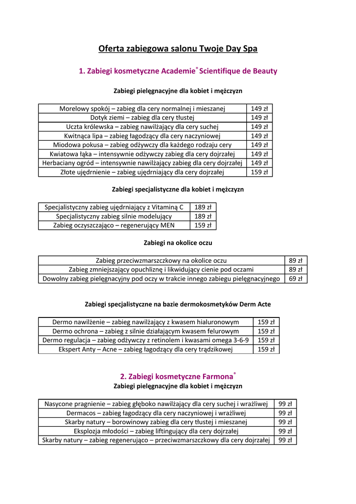 Oferta zabiegowa salonu Twoje Day Spa 1. Zabiegi kosmetyczne Academie® Scientifique de Beauty Zabiegi pielęgnacyjne dla kobiet i mężczyzn Morelowy spokój – zabieg dla cery normalnej i mieszanej Dotyk ziemi – zabieg dla cery tłustej Uczta królewska – zabieg nawilżający dla cery suchej Kwitnąca lipa – zabieg łagodzący dla cery naczyniowej Miodowa pokusa – zabieg odżywczy dla każdego rodzaju cery Kwiatowa łąka – intensywnie odżywczy zabieg dla cery dojrzałej Herbaciany ogród – intensywnie nawilżający zabieg dla cery dojrzałej Złote ujędrnienie – zabieg ujędrniający dla cery dojrzałej 149 zł 149 zł 149 zł 149 zł 149 zł 149 zł 149 zł 159 zł Zabiegi specjalistyczne dla kobiet i mężczyzn Specjalistyczny zabieg ujędrniający z Vitaminą C Specjalistyczny zabieg silnie modelujący Zabieg oczyszczająco – regenerujący MEN 189 zł 189 zł 159 zł Zabiegi na okolice oczu Zabieg przeciwzmarszczkowy na okolice oczu Zabieg zmniejszający opuchliznę i likwidujący cienie pod oczami Dowolny zabieg pielęgnacyjny pod oczy w trakcie innego zabiegu pielęgnacyjnego 89 zł 89 zł 69 zł Zabiegi specjalistyczne na bazie dermokosmetyków Derm Acte Dermo nawilżenie – zabieg nawilżający z kwasem hialuronowym Dermo ochrona – zabieg z silnie działającym kwasem felurowym Dermo regulacja – zabieg odżywczy z retinolem i kwasami omega 3-6-9 Ekspert Anty – Acne – zabieg łagodzący dla cery trądzikowej 159 zł 159 zł 159 zł 159 zł 2. Zabiegi kosmetyczne Farmona® Zabiegi pielęgnacyjne dla kobiet i mężczyzn Nasycone pragnienie – zabieg głęboko nawilżający dla cery suchej i wrażliwej Dermacos – zabieg łagodzący dla cery naczyniowej i wrażliwej Skarby natury – borowinowy zabieg dla cery tłustej i mieszanej Eksplozja młodości – zabieg liftingujący dla cery dojrzałej Skarby natury – zabieg regenerująco – przeciwzmarszczkowy dla cery dojrzałej 99 zł 99 zł 99 zł 99 zł 99 zł Zabiegi na okolice oczu Nowe spojrzenie - zabieg pod oczy usuwający oznaki zmęczenia Nowe spojrzenie podczas dowolnego zabiegu pielęgnacyjnego na twarz 59 zł 39 zł 3. Kosmetyka lecznicza twarzy Oczyszczanie twarzy podstawowe z maską glinkową Oczyszczanie twarzy podstawowe + serum + maska algowa Oczyszczanie twarzy podstawowe + pielęgnacja szyi i dekoltu Oczyszczanie pleców z maską glinkową 119 zł 139 zł 159 zł 99 zł Peeling kawitacyjny + serum + maska kremowa (twarz) Peeling kawitacyjny + serum + maska algowa (twarz) Peeling kawitacyjny + serum + maska kremowa (twarz, szyja, dekolt) Peeling kawitacyjny + serum + maska algowa (twarz, szyja, dekolt) Peeling kawitacyjny do każdego zabiegu pielęgnacyjnego Seria 3 zabiegów Mikrodermabrazja + serum + maska kremowa (twarz) Mikrodermabrazja + serum + maska algowa (twarz) Mikrodermabrazja + serum + maska kremowa (twarz, szyja, dekolt) Mikrodermabrazja + serum + maska algowa (twarz, szyja, dekolt) Mikrodermabrazja do każdego zabiegu pielęgnacyjnego Mikrodermabrazja pleców z maską kremową Seria 3 zabiegów 89 zł 109 zł 119 zł 149 zł 20 zł 15% taniej 89 zł 109 zł 119 zł 149 zł 20 zł 129 zł 15% taniej Ultradźwięki (sonoforeza) + serum + maska kremowa (twarz) Ultradźwięki (sonoforeza) + serum + maska algowa (twarz) Ultradźwięki (sonoforeza) + serum + maska kremowa (twarz, szyja, dekolt) Ultradźwięki (sonoforeza) + serum + maska algowa (twarz, szyja, dekolt) Ultradźwięki (sonoforeza) do każdego zabiegu pielęgnacyjnego Seria 3 zabiegów 89 zł 109 zł 119 zł 149 zł 20 zł 15% taniej 4. Kosmetyka specjalistyczna twarzy Peelingi chemiczne INNO PEEL Antiaging peel – peeling kwasami dla cery dojrzałej Skin Recovery – peeling kwasami dla cery tłustej i trądzikowej Whitening peel – specjalistyczny zabieg wybielający Lactobio C – peeling kwasami dla cery suchej, dojrzałej, z trądzikiem różowatym Mandelage – peeling kwasem migdałowy dla każdego rodzaju cery Azelane - peeling kwasami azelainowym i salicylowym dla cery trądzikowej, z bliznami potrądzikowymi 219 zł 219 zł 219 zł 219 zł 149 zł 259 zł Zabieg z zastosowaniem terapeutycznych masek PCA Skin NOWOŚĆ PCA Skin specjalistyczny zabieg kwasami dla każdego rodzaju cery NOWOŚĆ 129 zł 259 zł Mezoterapia mikroigłowa INNO ROLLER Depitach – kuracja rozjaśniająca przebarwienia Hyal – kuracja intensywnie nawilżająca z kwasem hialuronowym Snap 6-7-8 – kuracja liftingująca dla cery dojrzałej Recovery – kuracja łagodząca trądzik i blizny potrądzikowej Vitamin Complex – kuracja odżywcza dla każdego rodzaju cery Vitamin C – kuracja łagodząca trądzik różowaty i uszczelniająca naczynka Firming – kuracja likwidująca rozstępy i przywracająca elastyczność skóry Tracer – kuracja likwidująca rozstępy i cellulit Restructurer – kuracja regenerująca i rewitalizująca skórę Cena zakupu indywidualnego ROLLER (wystarcza na całą serię zabiegów) Znieczulenie kremem EMLA Seria 6 zabiegów 149 zł 149 zł 149 zł 149 zł 149 zł 149 zł 209 zł 209 zł 209 zł 129 zł 60 – 100 zł 15% taniej Hydradermabrazja HydrafacialTM BTL Hydradermabrazja twarzy z maską kremową Hydradermabrazja twarzy z maską algową Hydradermabrazja twarzy, szyi i dekoltu z maską kremową Hydradermabrazja twarzy, szyi i dekoltu z maską algową Hydradermabrazja twarzy z kwasem glikolowo – salicylowym z maską kremową Hydradermabrazja twarzy z kwasem glikolowo – salicylowym z maską algową Seria 6 zabiegów 119 zł 149 zł 169 zł 199 zł 209 zł 239 zł 15% taniej NNM Lipo KontourTM BTL NNM Lipo Kontour – terapia przeciwzmarszczkowa twarzy NNM Lipo Kontour – terapia przeciwzmarszczkowa twarzy, szyi i dekoltu NNM Lipo Kontour - terapia liftingująca twarzy po 40. roku życia NNM Lipo Kontour - terapia liftingująca twarzy po 40. roku życia NNM Lipo Kontour – terapia rozpuszczania tkanki tłuszczowej (1 partia ciała) NNM Lipo Kontour – terapia antycellulitowa wybranej part
