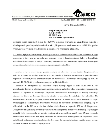 Iława, dnia 23.10.2009 r. Wójt Gminy Rypin u. Lipnowska 4 87-500 Rypin woj. kujawsko - pomorskie Dotyczy: pismo znak BGK z dnia 19.10.2009 r. odnośnie wezwania do uzupełnienia Raportu o oddziaływanie przedsięwzięcia na środowisko „Biogazownia rolnicza o mocy 1875 kWel, gmina Rypin, powiat rypiński, woj. kujawsko-pomorskie” o wymagane elementy. 1. Analiza wpływu planowanego przedsięwzięcia na zabudowania mieszkalne połoŜone w jego otoczeniu, a tym samym na zdrowie, warunki Ŝycia i bezpieczeństwa ludzi w kontekście uciąŜliwości związanych z emisją substancji odorowych oraz zagroŜenia wybuchem, biorąc pod uwagę kierunek wiatrów w stosunku do sąsiadujących budynków. Analizę wpływu planowanego przedsięwzięcia na zdrowie, warunki Ŝycia i bezpieczeństwa ludzi ze względu na emisję odorów oraz zagroŜenia wybuchem omówiono w przedłoŜonym Raporcie o oddziaływaniu przedsięwzięcia na środowisko. Informacje te znajdują się min. na stronach 45, 57-59, 64 przedłoŜonego raportu w Gminie Rypin. JednakŜe w nawiązaniu do wezwania Wójta Gminy Rypin z dnia 19.10.2009 r., do uzupełnienia Raportu o oddziaływaniu przedsięwzięcia na środowisko, uzupełniamy zagadnienia opisane w raporcie o informacje dotyczące uciąŜliwości związanych z emisją substancji odorowych, biorąc pod uwagę kierunek wiatrów w stosunku do sąsiadujących budynków. Na analizowanym terenie występują przewaŜające kierunki wiatrów zachodnich. Po analizie mapy ewidencyjnej z naniesionymi budynkami wynika, iŜ najbliŜsze zabudowania znajdują się w odległości około 710 m, a nie jak błędnie stwierdzono w raporcie 350 m od biogazowni. Odległość od najbliŜszej zabudowy oznaczono na załączonej mapie ewidencyjnej. Sąsiadujące budynki będą pozostawały po stronie zawietrznej przez większą część roku. Z tego względu zabudowania mieszkalne nie będą naraŜone na odczuwanie nieprzyjemnych zapachów, gdyŜ uciąŜliwość związana z emisją substancji odorowych dla sąsiedniej zabudowy, biorąc pod uwagę kierunek wiatrów, nie będzie występowała. NaleŜy równieŜ dodać, jak juŜ omówiono w przedłoŜonym raporcie, iŜ zastosowano w planowanej biogazowni rozwiązania zabezpieczające przed przedostawaniem się odorów do środowiska. Wszystkie procesy technologiczne w biogazowni będą przebiegały w układzie zamkniętym uniemoŜliwiającym przedostanie się nieprzyjemnych substancji zapachowych do środowiska. RównieŜ hermetyczny transport surowców zapewni wyeliminowanie emisji przykrych zapachów do powietrza. Jak podano w raporcie zastosowane technologie składowania poszczególnych substratów organicznych uŜytych do produkcji biogazu wykluczają moŜliwość znaczących i odczuwalnych emisji zapachów. W otoczeniu planowanej biogazowni znajdują się grunty rolne oraz zabudowy zagrodowe, w których jako nawóz stosuje się głównie rozlewaną na polach surową gnojowicę emitującą odory. Biogazownia wpisuje się w ideę rolnictwa ekologicznego oraz jest przyjazna dla sąsiadującego z nią otoczenia, gdyŜ powstający po produkcji nawóz eliminuje problem odorów. Jak opisano na stronach 36-37 przedłoŜonego raportu odpad pofermentacyjny jest pozbawiony przykrego zapachu i stanowi alternatywę dla nawozów sztucznych. Zalety odpadu przefermentowanego wykorzystywanego jako cenny nawóz opisano min. na stronach 50-51 raportu. NaleŜy równieŜ dodać, Ŝe gnojowica po fermentacji beztlenowej jest biologicznie ustabilizowana i przy energetycznym wykorzystaniu biogazu pozwala zredukować uciąŜliwy dla otoczenia odór, jaki powstaje podczas rozlewania surowej gnojowicy na polu. W procesie fermentacji beztlenowej następuje przetworzenie gnojowicy w masę niezagniwalną, pozbawioną właściwości odorowych. NaleŜy równieŜ zaznaczyć, iŜ zagospodarowanie substratu pofermentacyjnego sprawia znacznie mniej problemów w porównaniu z odchodami świeŜymi, dzięki zmianie ich właściwości. W procesie fermentacji następuje zmniejszenie uciąŜliwości zapachowej, ograniczenie emisji amoniaku do atmosfery oraz lepszej przyswajalności składników przez rośliny. 2. Analiza wpływu planowanego przedsięwzięcia na istniejący układ komunikacyjny dróg gminnych w kontekście szacowanego natęŜenia ruchu pojazdów i emisji hałasu, dopuszczalnej nośności dróg gminnych, oraz przewidywanych tras dowozowych do biogazowni i wywozowych z biogazowni. Pojazdy dowoŜące i wywoŜące substraty z terenu biogazowni będą spełniały normy dotyczące emisji hałasu i spalin z silników, nie przekraczając obowiązujących dla nich norm technicznych. Na omawianym terenie przewaŜająca ilość dróg stanowi drogi kategorii gminnej o dopuszczalnej masie pojazdów 8 ton dopuszczonych do ruchu pojazdów kołowych. Planuje się dowoŜenie substratów do biogazowni pojazdami o masie nie przekraczającej 5 ton (ciągnik z 2 naczepami). Ze względu na dopuszczoną na drogach gminnych masę pojazdów 8 ton dopuszczonych do ruchu pojazdów kołowych korygujemy ilość pojazdów określonych w punkcie 1 karty informacyjnej przedsięwzięcia. Przewidywana ilość pojazdów dowoŜących substrat do biogazowni w okresie nienawoŜenia pól wynosi 20 szt./d. Natomiast w okresie nawoŜenia pól (kwiecień/maj i wrzesień/październik) zakładamy łącznie 67 szt./d pojazdów dowoŜących substrat i wywoŜących substrat przefermentowany. Powstałe odpady będą wywoŜone w hermetycznych zbiornikach i wykorzystywane jako dobrej jakości, bezwonny nawóz. Wykorzystanie takiego transportu nie wpłynie znacząco na pogorszenie warunków jezdnych na planowanej trasie dojazdów. Wywóz odpadu pofermentacyjnego w szczelnych, hermetycznych zbiornikach typu beczka nie będzie miał wpływu na zanieczyszczenie dróg transportu i pozwoli na zlikwidowanie uciąŜliwości zapachowych. Transport substratów nie wpłynie uciąŜliwie na Ŝycie mieszkańców, gdyŜ nie będzie b