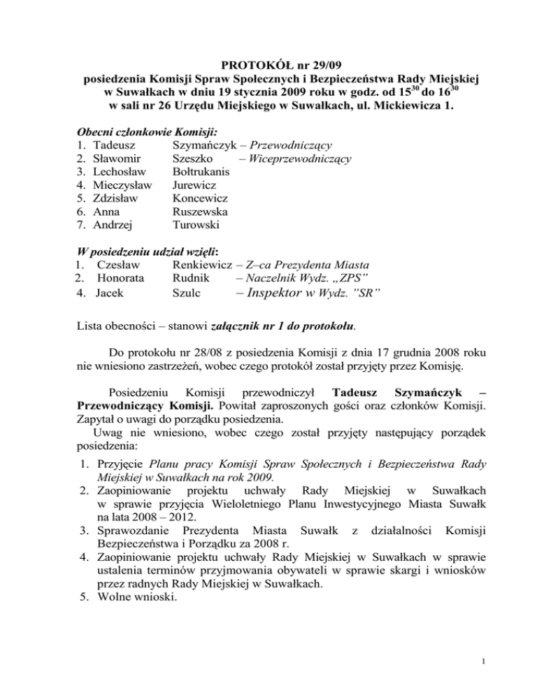 PROTOKÓŁ nr 29/09 posiedzenia Komisji Spraw Społecznych i Bezpieczeństwa Rady Miejskiej w Suwałkach w dniu 19 stycznia 2009 roku w godz. od 1530 do 1630 w sali nr 26 Urzędu Miejskiego w Suwałkach, ul. Mickiewicza 1. Obecni członkowie Komisji: 1. Tadeusz Szymańczyk – Przewodniczący 2. Sławomir Szeszko – Wiceprzewodniczący 3. Lechosław Bołtrukanis 4. Mieczysław Jurewicz 5. Zdzisław Koncewicz 6. Anna Ruszewska 7. Andrzej Turowski W posiedzeniu udział wzięli: 1. Czesław Renkiewicz – Z–ca Prezydenta Miasta 2. Honorata Rudnik – Naczelnik Wydz. „ZPS” 4. Jacek Szulc – Inspektor w Wydz. ”SR” Lista obecności – stanowi załącznik nr 1 do protokołu. Do protokołu nr 28/08 z posiedzenia Komisji z dnia 17 grudnia 2008 roku nie wniesiono zastrzeŜeń, wobec czego protokół został przyjęty przez Komisję. Posiedzeniu Komisji przewodniczył Tadeusz Szymańczyk – Przewodniczący Komisji. Powitał zaproszonych gości oraz członków Komisji. Zapytał o uwagi do porządku posiedzenia. Uwag nie wniesiono, wobec czego został przyjęty następujący porządek posiedzenia: 1. Przyjęcie Planu pracy Komisji Spraw Społecznych i Bezpieczeństwa Rady Miejskiej w Suwałkach na rok 2009. 2. Zaopiniowanie projektu uchwały Rady Miejskiej w Suwałkach w sprawie przyjęcia Wieloletniego Planu Inwestycyjnego Miasta Suwałk na lata 2008 – 2012. 3. Sprawozdanie Prezydenta Miasta Suwałk z działalności Komisji Bezpieczeństwa i Porządku za 2008 r. 4. Zaopiniowanie projektu uchwały Rady Miejskiej w Suwałkach w sprawie ustalenia terminów przyjmowania obywateli w sprawie skargi i wniosków przez radnych Rady Miejskiej w Suwałkach. 5. Wolne wnioski. 1 Ad pkt. 1 Przyjęcie Planu pracy Komisji Spraw Społecznych i Bezpieczeństwa Rady Miejskiej w Suwałkach na rok 2009. Projekt Planu pracy stanowi załącznik nr 2 do protokołu. Tadeusz Szymańczyk poinformował, Ŝe w marcu przedmiotem posiedzenia Komisji będzie równieŜ temat pn. Informacja dotycząca funkcjonowania Placówki Opiekuńczo – Wychowawczej w 2008 r. Mieczysław Jurewicz zaproponował, aby w Planie pracy w czerwcu znalazła się Informacja z działalności Zarządu Budynków Mieszkalnych za 2008 rok ze szczególnym uwzględnieniem realizacji zadań w zakresie zapewniania lokali socjalnych i zamiennych, a takŜe zaspokajania potrzeb mieszkaniowych gospodarstw o niskich dochodach. Członkowie Komisji nie mieli zastrzeŜeń do zgłoszonych propozycji i przyjęli Plan pracy Komisji Spraw Społecznych i Bezpieczeństwa w Suwałkach na rok 2009, który stanowi załącznik nr 3 do protokołu. Ad pkt. 2 Zaopiniowanie projektu uchwały Rady Miejskiej w Suwałkach w sprawie przyjęcia Wieloletniego Planu Inwestycyjnego Miasta Suwałk na lata 2008 – 2012. Projekt uchwały stanowi załącznik nr 4 do protokołu. Czesław Renkiewicz – został przedstawiony kolejny Wieloletni Plan Inwestycyjny, który zawiera wykaz zadań przewidzianych do wykonania. Po podsumowaniu zaplanowanych kwot na zadania moŜna stwierdzić, Ŝe ogólny koszt wykracza poza moŜliwości budŜetu miasta. Jednak wiele inwestycji zostało zapisanych, Ŝeby stworzyć szansę na rozpoczęcie realizacji zadania w przypadku, gdy okaŜe się, Ŝe jest moŜliwość zgłoszenia do programu i wystąpienia o środki unijne. Dodał, Ŝe w planie są zapisane środki finansowe, które zostaną pozyskane od inwestorów (m.in. TESCO). Tadeusz Szymańczyk określił, Ŝe dobór inwestycji ujmowanych w WPI jest w pewnym sensie pochodną moŜliwości budŜetu miejskiego. Nie wszystko moŜna ująć i demokracja ma to do siebie, Ŝe o tym doborze decyduje większość, tak teŜ tu się stało i ma do tego szacunek. Zakwestionował jednak, sformułowania uŜyte w uzasadnieniu do projektu przedmiotowej uchwały, mianowicie racjonalne i optymalne podejmowanie decyzji, efektywne wykorzystanie środków. W jego opinii jest to pewna niekonsekwencja, jeśli rozpoczyna się i inwestycję i przerywa się ją, a później znowu rozpoczyna, to nie jest to racjonalne prowadzenie inwestycji i wykorzystanie środków. Podał jako przykład rozłoŜenie w czasie realizacji Placu Europejskiego na trzy etapy, które wybiegają daleko w przyszłość i poŜądany efekt praktycznie się rozmywa, 2 podczas gdy Litwini w ramach zawartego porozumienia swoją inwestycję skończyli. Kolejnym przykładem było wykonanie jezdni na ulicy Szpitalnej czy Mieszka, a zapomniano o chodnikach. Zrobienie jezdni przyspieszyło ruch samochodowy i w konsekwencji wprowadziło utrudnienie poruszania się pieszym. Jest to pewien rodzaj niekonsekwencji. Powołując się na przytoczone argumenty powiedział iŜ wstrzymuje się od głosu. Czesław Renkiewicz przyznał rację przedmówcy, Ŝe deptak przy ulicy Szpitalnej jest potrzebny i to zadanie zostanie zrealizowane w ramach dostępnych środków, mimo tego, Ŝe nie jest ujęte w WPI. W nawiązaniu do Placu Europejskiego, wyjaśnił, iŜ z uwagi na wartość i koszty tej inwestycji są bardzo wysokie, dlatego realizacja została rozplanowana na trzy etapy. Poza tym naleŜy mieć na uwadze planowaną renowację parku im. Marii Konopnickiej i odnowienie umiejscowionego tam pomnika poetki. Członkowie komisji nie wnieśli uwag do przedłoŜonego materiału, wobec powyŜszego przystąpiono do głosowania. Głosowanie w sprawie zaopiniowania projektu uchwały: − za pozytywną opinią głosowało – 7 radnych, − przeciw – 0, − wstrzymało się od głosu – 0. Komisja Spraw Społecznych i Bezpieczeństwa Rady Miejskiej w Suwałkach na posiedzeniu w dniu 19 stycznia 2009 r. pozytywnie zaopiniowała projekt uchwały w sprawie przyjęcia Wieloletniego Planu Inwestycyjnego Miasta Suwałk na lata 2008 – 2012. Opinia Komisji stanowi załącznik nr 5 do protokołu. Ad pkt. 3 Sprawozdanie Prezydenta Miasta Suwałk z działalności Komisji Bezpieczeństwa i Porządku za 2008 r. Sprawozdanie stanowi załącznik nr 6 do protokołu. Członkowie komisji nie
