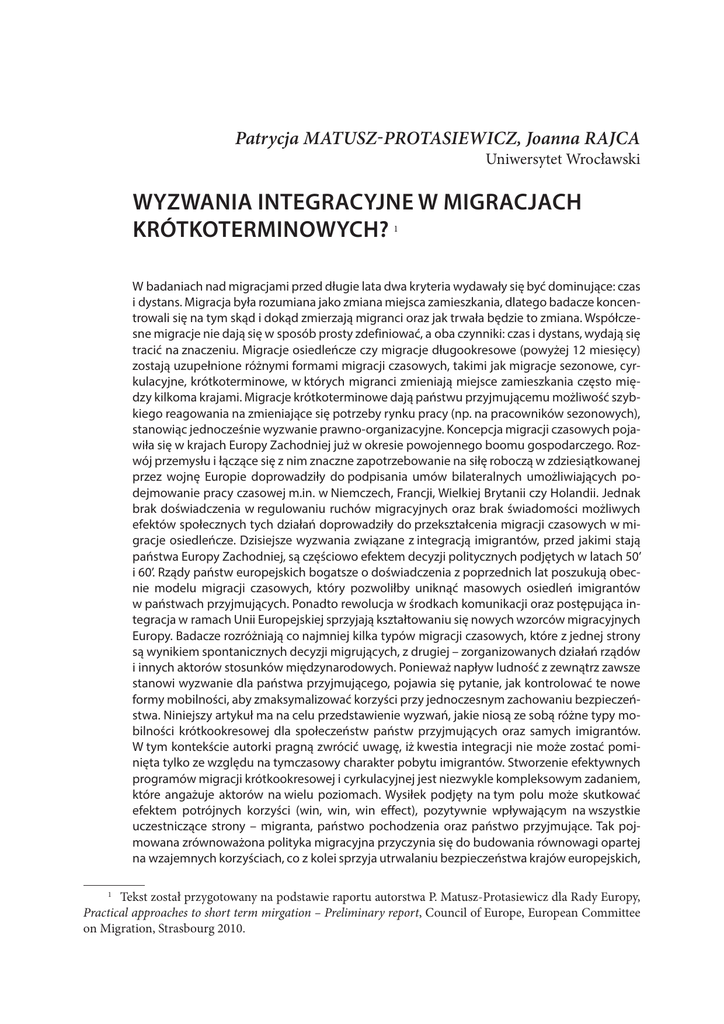 Patrycja MATUSZ-PROTASIEWICZ, Joanna RAJCA Uniwersytet Wrocławski WYZWANIA INTEGRACYJNE W MIGRACJACH KRÓTKOTERMINOWYCH? 1 W badaniach nad migracjami przed długie lata dwa kryteria wydawały się być dominujące: czas i dystans. Migracja była rozumiana jako zmiana miejsca zamieszkania, dlatego badacze koncentrowali się na tym skąd i dokąd zmierzają migranci oraz jak trwała będzie to zmiana. Współczesne migracje nie dają się w sposób prosty zdefiniować, a oba czynniki: czas i dystans, wydają się tracić na znaczeniu. Migracje osiedleńcze czy migracje długookresowe (powyżej 12 miesięcy) zostają uzupełnione różnymi formami migracji czasowych, takimi jak migracje sezonowe, cyrkulacyjne, krótkoterminowe, w których migranci zmieniają miejsce zamieszkania często między kilkoma krajami. Migracje krótkoterminowe dają państwu przyjmującemu możliwość szybkiego reagowania na zmieniające się potrzeby rynku pracy (np. na pracowników sezonowych), stanowiąc jednocześnie wyzwanie prawno-organizacyjne. Koncepcja migracji czasowych pojawiła się w krajach Europy Zachodniej już w okresie powojennego boomu gospodarczego. Rozwój przemysłu i łączące się z nim znaczne zapotrzebowanie na siłę roboczą w zdziesiątkowanej przez wojnę Europie doprowadziły do podpisania umów bilateralnych umożliwiających podejmowanie pracy czasowej m.in. w Niemczech, Francji, Wielkiej Brytanii czy Holandii. Jednak brak doświadczenia w regulowaniu ruchów migracyjnych oraz brak świadomości możliwych efektów społecznych tych działań doprowadziły do przekształcenia migracji czasowych w migracje osiedleńcze. Dzisiejsze wyzwania związane z integracją imigrantów, przed jakimi stają państwa Europy Zachodniej, są częściowo efektem decyzji politycznych podjętych w latach 50’ i 60’. Rządy państw europejskich bogatsze o doświadczenia z poprzednich lat poszukują obecnie modelu migracji czasowych, który pozwoliłby uniknąć masowych osiedleń imigrantów w państwach przyjmujących. Ponadto rewolucja w środkach komunikacji oraz postępująca integracja w ramach Unii Europejskiej sprzyjają kształtowaniu się nowych wzorców migracyjnych Europy. Badacze rozróżniają co najmniej kilka typów migracji czasowych, które z jednej strony są wynikiem spontanicznych decyzji migrujących, z drugiej – zorganizowanych działań rządów i innych aktorów stosunków międzynarodowych. Ponieważ napływ ludność z zewnątrz zawsze stanowi wyzwanie dla państwa przyjmującego, pojawia się pytanie, jak kontrolować te nowe formy mobilności, aby zmaksymalizować korzyści przy jednoczesnym zachowaniu bezpieczeństwa. Niniejszy artykuł ma na celu przedstawienie wyzwań, jakie niosą ze sobą różne typy mobilności krótkookresowej dla społeczeństw państw przyjmujących oraz samych imigrantów. W tym kontekście autorki pragną zwrócić uwagę, iż kwestia integracji nie może zostać pominięta tylko ze względu na tymczasowy charakter pobytu imigrantów. Stworzenie efektywnych programów migracji krótkookresowej i cyrkulacyjnej jest niezwykle kompleksowym zadaniem, które angażuje aktorów na wielu poziomach. Wysiłek podjęty na tym polu może skutkować efektem potrójnych korzyści (win, win, win effect), pozytywnie wpływającym na wszystkie uczestniczące strony – migranta, państwo pochodzenia oraz państwo przyjmujące. Tak pojmowana zrównoważona polityka migracyjna przyczynia się do budowania równowagi opartej na wzajemnych korzyściach, co z kolei sprzyja utrwalaniu bezpieczeństwa krajów europejskich, Tekst został przygotowany na podstawie raportu autorstwa P. Matusz-Protasiewicz dla Rady Europy, Practical approaches to short term mirgation – Preliminary report, Council of Europe, European Committee on Migration, Strasbourg 2010. 1 Materiały 201 zarówno wewnętrznego jak i międzynarodowego, co w dobie kryzysu społeczno-ekonomicznego wydaje się szczególnie pożądane. Słowa kluczowe: migracje czasowe, migracje krótkoterminowe, migracje cyrkulacyjne, polityka migracyjna UE, polityka integracyjna, bezpieczeństwo wewnętrzne i międzynarodowe 1. WSTĘP Międzynarodowa migracja wiąże się z przekraczaniem dwojakiego typu granic – terytorialnych oraz społecznych, które oddzielają od siebie narody i jednocześnie porządkują rzeczywistość międzynarodową. Zarządzanie migracjami jest wyrazem dążenia państwa do ochrony swoich granic – nie tylko w rozumieniu integralności terytorialnej, ale także spójności społecznej i kulturowej. W ten sposób badania nad migracjami wpisują się w szeroki nurt badań nad bezpieczeństwem i są powiązane z takimi zagadnieniami jak bezpieczeństwo ekonomiczne, społeczne czy kulturowe, dotycząc jednocześnie wielu poziomów interakcji – lokalnego, narodowego, regionalnego a nawet globalnego. Koncepcja migracji czasowych pojawiła się w krajach Europy Zachodniej już w okresie powojennego boomu gospodarczego. Rozwój przemysłu i łączące się z nim znaczne zapotrzebowanie na siłę roboczą w zdziesiątkowanej przez wojnę Europie doprowadziły do podpisania umów bilateralnych umożliwiających podejmowanie pracy czasowej m.in. w Niemczech, Francji, Wielkiej Brytanii, Belgii czy Holandii. Od lat 50’ kraje Europy Zachodniej rekrutowały pracowników, w pierwszym etapie z Włoch, Hiszpanii, Portugalii oraz byłej Jugosławii, a następnie z Maroka, Algierii, Tunezji i Turcji. W założeniu pobyt migrantów miał mieć charakter czasowy. Okazało się jednak, że większość imigrantów osiedlała się w krajach przyjmujących. Przykładem może być około jedna trzecia Turków przybyłych do Niemiec2. Ograniczenie migracji w obliczu kryzysu naftowego (1973) spowodowało jedynie intensyfikację procesu łączenia rodzin oraz wzrost nielegalnej migracji3. Brak doświadczenia w regulowaniu ruchów migracyjnych oraz brak świadomości możliwych efektów społecznych tych dzi