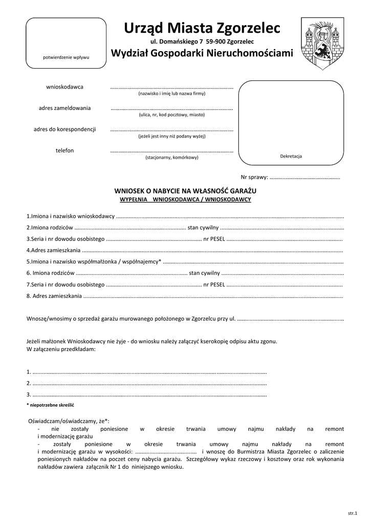 Urząd Miasta Zgorzelec ul. Domańskiego 7 59-900 Zgorzelec potwierdzenie wpływu wnioskodawca Wydział Gospodarki Nieruchomościami …………………………………………….……………………………. (nazwisko i imię lub nazwa firmy) adres zameldowania …………………………………………….…..………………………. (ulica, nr, kod pocztowy, miasto) adres do korespondencji ………………………………………………….………………………. (jeżeli jest inny niż podany wyżej) telefon ………………………………………………………..………………… Dekretacja (stacjonarny, komórkowy) Nr sprawy: ………..……………………………….. WNIOSEK O NABYCIE NA WŁASNOŚĆ GARAŻU WYPEŁNIA WNIOSKODAWCA / WNIOSKODAWCY 1.Imiona i nazwisko wnioskodawcy ................................................................................................................................................. 2.Imiona rodziców ....................................................................... stan cywilny ............................................................................... 3.Seria i nr dowodu osobistego ............................................................. nr PESEL .......................................................................... 4.Adres zamieszkania ...................................................................................................................................................................... 5.Imiona i nazwisko współmałżonka / współnajemcy* ................................................................................................................... 6. Imiona rodziców ....................................................................... stan cywilny .............................................................................. 7.Seria i nr dowodu osobistego ............................................................. nr PESEL .......................................................................... 8. Adres zamieszkania ..................................................................................................................................................................... Wnoszę/wnosimy o sprzedaż garażu murowanego położonego w Zgorzelcu przy ul. .................................................................... Jeżeli małżonek Wnioskodawcy nie żyje - do wniosku należy załączyć kserokopię odpisu aktu zgonu. W załączeniu przedkładam: 1. ..................................................................................................................................................... 2. ..................................................................................................................................................... 3. ..................................................................................................................................................... * niepotrzebne skreślić Oświadczam/oświadczamy, że*: nie zostały poniesione w okresie trwania umowy najmu nakłady na remont i modernizację garażu zostały poniesione w okresie trwania umowy najmu nakłady na remont i modernizację garażu w wysokości: ....................................... i wnoszę do Burmistrza Miasta Zgorzelec o zaliczenie poniesionych nakładów na poczet ceny nabycia garażu. Szczegółowy wykaz rzeczowy i kosztowy oraz rok wykonania nakładów zawiera załącznik Nr 1 do niniejszego wniosku. str.1 Pouczony / pouczeni za wprowadzanie w zgodne z prawdą. o odpowiedzialności karnej błąd oświadczam/oświadczamy, ............................................................................ czytelny podpis współmałżonka/współnajemcy* z że art. 233 Kodeksu karnego wszystkie powyższe dane są ........................................................ czytelny podpis wnioskodawcy *właściwe zakreślić UWAGI: 1. 2. 3. 4. 5. 6. Dane osobowe należy wypełniać zgodnie z dowodem osobistym. Sprzedaż garażu w drodze bezprzetargowej może nastąpić wyłącznie na rzecz jego najemcy lub najemców, którzy mają zawartą umowę z Administracja Domów Mieszkalnych w Zgorzelcu przy ul. Traugutta 77a na dzierżawę gruntu i najem garażu nieprzerwanie przez okres 3 lat. Wniosek z wypełnionymi danymi Wnioskodawcy/Wnioskodawców jak w treści, wypełniony i potwierdzony przez Administrację Domów Mieszkalnych w Zgorzelcu ul. Traugutta 77a należy złożyć w Punkcie Obsługi Interesanta Urzędu Miasta Zgorzelec ul. Domańskiego 7. O zakwalifikowaniu garażu do sprzedaży Wnioskodawca/Wnioskodawcy zostaną poinformowani pismem. W piśmie podany zostanie również wysokość kosztów związanych z przygotowaniem nieruchomości do zbycia (wyceny garażu) oraz numer konta Urzędu Miasta Zgorzelec, na który należy je wpłacić. Z chwilą wpływu wskazanej kwoty na konto Urzędu Miasta Zgorzelec rozpoczęta zostanie procedura związana z przygotowaniem lokalu do sprzedaży w drodze bezprzetargowej. W przypadku poniesienia przez Wnioskodawcę nakładów na remont i modernizację lokalu ich wartość zostanie określona przez Rzeczoznawcę Majątkowego, zgodnie z przepisami ustawy o gospodarce nieruchomościami. Sprawa załatwiania w trybie cywilno-prawnym, nie obowiązują przepisy Kodeksu Postępowania Administracyjnego. Czas przygotowania nieruchomości do zbycia od momentu podjęcia pierwszych czynności do podpisania zawarcia umowy sprzedaży w formie aktu notarialnego – uzależniony jest od uzyskania niezbędnych opinii oraz opracowania dokumentacji geodezyjnej. ADNOTACJE URZĘDOWE str.2 WYPEŁNIA ADMINISTRACJA DOMÓW MIESZKALNYCH W ZGORZELCU, UL. TRAUGUTTA 77A. Potwierdzenie umowy najmu garażu położonego w Zgorzelcu przy ul. ........................................................................................................................... . 1. Data i numer umowy zawartej na najem przedmiotowego g