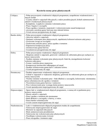 Kryteria oceny prac plastycznych Celujący - Pełne przyswojenie wiadomości objętych programem, uzupełnione wiadomościami z innych źródeł - Czynny udział w zajęciach lekcyjnych, a także pozalekcyjnych, kołach zainteresowań, udział w konkursach plastycznych - Kompletne, wyjątkowo staranne wykonanie pracy - Praca bogata w szczegóły - Praca zgodna z tematem, znajomość i wykorzystywanie zasad kompozycji - używanie szerokiej gamy barwnej oraz odcieni koloru - Uczeń zawsze przygotowany do zajęć Bardzo dobry - Pełne przyswojenie wiadomości objętych programem - Aktywny udział w zajęciach - Staranne wykonanie prac plastycznych, zapełnienie kolorem/walorem całej pracy - Zwrócenie uwagi na szczegóły - Zachowana estetyka pracy, praca zgodna z tematem - Poporawna kompozycja pracy - Zróżnicowana gama barwna - Uczeńzawsze przygotowany do zajęć Dobry - Pełne przyswojenie wiadomości objętych programem - Skupiony udział w zajęciach, gotowość i zdolność do zabierania głosu po zachęcie ze strony nauczyciela - Średnio staranne wykonanie prac plastycznych- brak tła, niezapełnienie kolorem/ walorem całej pracy - Forma i estetyka pracy poprawna - Kompozycja nieznacznie odbiegająca od zasad - Średnio zróżnicowana gama barw i odcienie koloru - Uczeń przygotowany do zajęć Dostateczny - Średnie opanowanie wiadomości objętych programem - Udział w zajęciach w większości skupiony, gotowość do zabierania głosu po zachęcie ze strony nauczyciela - Niezbyt staranne wykonanie prac - brak dbałości o szczegóły, kolorowanie niestaranne; praca schematyczna ale zgodna z tematem - Niezróżnicowana gama barwna i walorowa - Przy wykonywaniu prac wymaga dużej pomocy nauczyciela - Uczeń sporadycznie nieprzygotowany do zajęć Dopuszczający - Spore luki w wiadomościach objętych programem, z szansą ich wypełnienia przy pomocy nauczyciela) - Bierny udział w zajęciach - Prace zgodne z tematem ale niestaranne - Brak dbałości o szczegóły, o barwę, o walor - Praca bardzo schematyczna - Uczeń czasem nieprzygotowany do zajęć Niedostateczny - Luki w wiadomościach objętych programem trudne do uzupełnienia - Notoryczne nieprzygotowanie do zajęć - Bierność na zajęciach lekcyjnych - Brak zainteresowania przedmiotem - Notoryczne nie wykonywanie prac plastycznych - Niechlujne wykonywanie ćwiczeń - Prace niezgodne z tematem zajęć Opracowała: Magdalena Ciepielewska