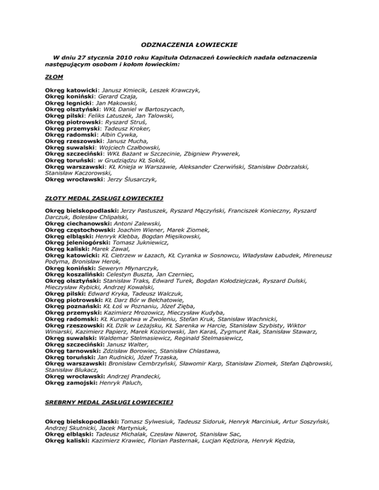 ODZNACZENIA ŁOWIECKIE W dniu 27 stycznia 2010 roku Kapituła Odznaczeń Łowieckich nadała odznaczenia następującym osobom i kołom łowieckim: ZŁOM Okręg katowicki: Janusz Kmiecik, Leszek Krawczyk, Okręg koniński: Gerard Czaja, Okręg legnicki: Jan Makowski, Okręg olsztyński: WKŁ Daniel w Bartoszycach, Okręg pilski: Feliks Latuszek, Jan Talowski, Okręg piotrowski: Ryszard Struś, Okręg przemyski: Tadeusz Kroker, Okręg radomski: Albin Cywka, Okręg rzeszowski: Janusz Mucha, Okręg suwalski: Wojciech Czałbowski, Okręg szczeciński: WKŁ Bażant w Szczecinie, Zbigniew Prywerek, Okręg toruński: w Grudziądzu KŁ Sokół, Okręg warszawski: KŁ Knieja w Warszawie, Aleksander Czerwiński, Stanisław Dobrzalski, Stanisław Kaczorowski, Okręg wrocławski: Jerzy Ślusarczyk, ZŁOTY MEDAL ZASŁUGI ŁOWIECKIEJ Okręg bielskopodlaski: Jerzy Pastuszek, Ryszard Mączyński, Franciszek Konieczny, Ryszard Darczuk, Bolesław Chlipalski, Okręg ciechanowski: Antoni Zalewski, Okręg częstochowski: Joachim Wiener, Marek Ziomek, Okręg elbląski: Henryk Klebba, Bogdan Mięsikowski, Okręg jeleniogórski: Tomasz Jukniewicz, Okręg kaliski: Marek Zawal, Okręg katowicki: KŁ Cietrzew w Łazach, KŁ Cyranka w Sosnowcu, Władysław Łabudek, Mireneusz Podyma, Bronisław Herok, Okręg koniński: Seweryn Młynarczyk, Okręg koszaliński: Celestyn Buszta, Jan Czerniec, Okręg olsztyński: Stanisław Traks, Edward Turek, Bogdan Kołodziejczak, Ryszard Dulski, Mieczysław Rybicki, Andrzej Kowalski, Okręg pilski: Edward Kryka, Tadeusz Walczuk, Okręg piotrowski: KŁ Darz Bór w Bełchatowie, Okręg poznański: KŁ Łoś w Poznaniu, Józef Zięba, Okręg przemyski: Kazimierz Mrozowicz, Mieczysław Kudyba, Okręg radomski: KŁ Kuropatwa w Zwoleniu, Stefan Kruk, Stanisław Wachnicki, Okręg rzeszowski: KŁ Dzik w Leżajsku, KŁ Sarenka w Harcie, Stanisław Szybisty, Wiktor Winiarski, Kazimierz Papierz, Marek Koziorowski, Jan Karaś, Zygmunt Rak, Stanisław Stawarz, Okręg suwalski: Waldemar Stelmasiewicz, Reginald Stelmasiewicz, Okręg szczeciński: Janusz Walter, Okręg tarnowski: Zdzisław Borowiec, Stanisław Chlastawa, Okręg toruński: Jan Rudnicki, Józef Trzaska, Okręg warszawski: Bronisław Cembrzyński, Sławomir Karp, Stanisław Ziomek, Stefan Dąbrowski, Stanisław Blukacz, Okręg wrocławski: Andrzej Prandecki, Okręg zamojski: Henryk Paluch, SREBRNY MEDAL ZASŁUGI ŁOWIECKIEJ Okręg bielskopodlaski: Tomasz Sylwesiuk, Tadeusz Sidoruk, Henryk Marciniuk, Artur Soszyński, Andrzej Skutnicki, Jacek Martyniuk, Okręg elbląski: Tadeusz Michalak, Czesław Nawrot, Stanisław Sac, Okręg kaliski: Kazimierz Krawiec, Florian Pasternak, Lucjan Kędziora, Henryk Kędzia, Henryk Bażant, Okręg katowicki: Józef Gembalczyk, Andrzej Koczor, Adam Nowak, Okręg koszaliński: Tadeusz Fil, Wiesław Małyszko, Tadeusz Wróbel, Józef Wójcik, Okręg legnicki: Jan Fedorczak, Dominik Kopacki, Stanisław Leśniewski, Ryszard Lichocki, Zbigniew Malerowicz, Bolesław Morawski, Józef Zacharski, Okręg olsztyński: Zbigniew Lubowidzki, Mariusz Sztorc, Jan Kornafel, Andrzej Jaźwiński, Wiesław Sender, Zbigniew Wilczyński, Mieczysław Zając, Okręg ostrołęcki: Władysław Dębkowski, Okręg pilski: Zenon Jasiński, Tadeusz Kaźmierski, Bohdan Morik, Piotr Radwański, Okręg piotrowski: Antoni Warcholiński, Okręg płocki: w Płocku KŁ Petroponowa, Jerzy Wiktorski, Okręg przemyski: Stanisław Tkaczyk, Tadeusz Świąder, Franciszek Socha, Jerzy Sobkiewicz, Antoni Pelikan, January Pałys, Zenon Jezierski, Krzysztof Guzowski, Andrzej Fludziński, Tomasz Ogonowski, Okręg radomski: Konrad Dyjas, Witold Furmaniak, Zbigniew Grzybowski, Alojzy Kępa, Dariusz Mężyk, Edward Szewczyk, Witold Warchoł, Jerzy Wilczyński, Karol Wyka, Okręg rzeszowski: Zdzisław Smyrski, Andrzej Rzeczyca, Michał Jaroszewicz, Stanisław Gunia, Tadeusz Kobylarz, Sylwester Bajger, Robert Stachura, Marek Domagała, Krzysztof Kawalec, Jerzy Jaczewski, Józef Wit, Bolesław Mazgaj, Kazimierz Wit, Marian Mirosław, Jan Górny, Izydor Grzybek, Marian Stąpor, Antoni Jonkisz, Andrzej Bełz, Józef Szlachta, Stanisław Baran, Janusz Rak, Leszek Iskrzycki, Okręg siedlecki: Ryszard Sawicki, Okręg szczeciński: Przemysław Gromada, Piotr Kmet, Ryszard Wierzbicki, Okręg tarnowski: Ignacy Mazur, Jacek Świerczek, Marek Temecki, Okręg toruński: Eugeniusz Bińkowski, Marek Główczyński, Józef Janus, Krzysztof Kopczyński, Andrzej Mierzyński, Hubert Mrugała, Krzysztof Pilewski, Marek Wichliński, Okręg warszawski: Wojciech Drożdżyński, Grzegorz Jakubowski, Andrzej Jaroszewski, Dariusz Salamończyk, Jerzy Augustyniak, Okręg wrocławski: Andrzej Cidyło, Witold Komorowski, Andrzej Szambelan, Okręg zamojski: Janusz Borowiec, Stanisław Wrzyszcz, Okręg zielonogórski: Andrzej Szóstak, KŁ Słonka w Zielonej Górze, Andrzej Kudła, Leszek Szewczyk, Jerzy Warszawski, BRĄZOWY MEDAL ZASŁUGI ŁOWIECKIEJ Okręg bielskopodlaski: Leszek Kupidura, Bogusław Żądło, Dariusz Wójtowicz, Eugeniusz Waszczuk, Adam Reducha, Sławomir Rechnio, Janusz Miłosz, Krzysztof Zieliński, Krzysztof Sidor, Piotr Łukaszuk, Stefan Karasiński, Jan Brodacki, Okręg ciechanowski: Paweł Domański, Andrzej Filipski, Mariusz Czarnecki, Jan Zaborowski, Tomasz Rochowicz, Piotr Grzywacz, Stanisław Bukalski, Okręg jelenigórski: Emil Matkowski, Okręg kaliski: Marian Majewski, Andrzej Lubiniecki, Stefan Taczała, Bogdan Stefański, Roman Nowacki, Okręg katowicki: Romuald Mucha, Józef Tomaszek, Jerzy Jóźwiak, Henryk Giemza, Józef Walochnik, Eugeniusz Szmidt, Marek Zimny, Mirosław Góra, Tomasz Związek, Grzegorz Krzisz, Witold Piekarczyk, Kazimierz Rohn, Bolesław Ziemba, Józef Pieczykolan, Okręg koszaliński: Mieczysław Jaćkowski, Wit Lewicki, Edward Szysz, Stanisław Szeremeta, Stanisław Bruzda, Bogusław Gronowski, Artur Gryczyński, Andrzej Kononowicz, Zbigniew Filipiak, Antoni Milewczyk, Edward Kamiński, Ryszard Nowak, Ryszard Bierbasz, Janusz Z