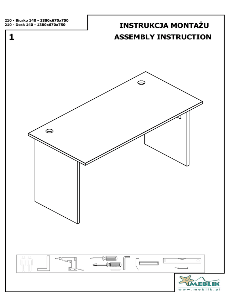 210 - Biurko 140 - 1380x670x750 210 - Desk 140 - 1380x670x750 1 INSTRUKCJA MONTAŻU ASSEMBLY INSTRUCTION 210 - Biurko 140 - 1380x670x750 210 - Desk 140 - 1380x670x750 2 WAŻNE, ZACHOWAĆ DO PÓŹNIEJSZEGO STOSOWANIAUWAŻNIE PRZECZYTAĆ IMPORTANT, SAVE FOR FURTHER USAGE- READ CAREFULLY INSTRUKCJA UŻYTKOWANIA USER’S MANUAL 1. 2. 3. 4. 5. 6. Aby uniknąć niebezpieczeństwa uduszenia, trzymać opakowanie plastikowe w miejscu niedostępnym dla niemowląt i dzieci. To avoid the danger of strangulation, keep the plastic package away from babies and children. Wszystkie połączenia muszą być dobrze dokręcone oraz żaden element łączący nie może być luźny. All connections must be tightened properly and no coupled element can not be loose. Ostrzeżenie: Bądź świadom ryzyka jakie stanowi otwarty ogień oraz inne silne źródła ciepła, takie jak promienniki elektryczne lub gazowe itp. umieszczone w pobliżu szafy. Warning: Be aware of the risk of open fire and other strong sources of heat, like electric or gas radiators etc. located near the wardrobe. Ostrzeżenie: Nie używać szafy, jeżeli jakikolwiek jego element jest uszkodzony, rozdarty lub brakuje elementu, używać wyłącznie elementy dopuszczone przez producenta. Warning: Do not use the wardrobe if any of the elements is damaged, torn or if there is any missing element, use only the elements given by the manufacturer Ostrzeżenie: Obowiązkowo stosować należy pasek przytwierdzający szafę do ściany. Warning: Use the belt to affix the wardrobe to the wall. Wszystkie elementy muszą być utrzymane w czystości. All items must be kept clean. 210 - Biurko 140 - 1380x670x750 210 - Desk 140 - 1380x670x750 3 3 4 5 2 1 Rys. / Fig Sym. / Sign Szt. / Psc. W78 5 W79 2 W57 2 W3 5 W2 5 W4 6 W56 2 W58 1 210 - Biurko 140 - 1380x670x750 210 - Desk 140 - 1380x670x750 A W56 4 < 3 < C W79 W4 B A 2 C B 210 - Biurko 140 - 1380x670x750 210 - Desk 140 - 1380x670x750 5 D W2 W4 E D E 210 - Biurko 140 - 1380x670x750 210 - Desk 140 - 1380x670x750 6 H H 210 - Biurko 140 - 1380x670x750 210 - Desk 140 - 1380x670x750 7 J 1 165° max 2 J 210 - Biurko 140 - 1380x670x750 210 - Desk 140 - 1380x670x750 8 Paczka 1 z 1 / Package 1 of 1 Numer (patrz str. 3) / Ilosc / Quantity Item no. (see p. 3) 1 1 Material i wymiar / Material & diamensions LAM 25 1380 670 25 4 1 OKUCIA/FITTINGS 290 67 28 5 2 LAM 25 725 500 25 3 1 LAM 25 1250 120 25