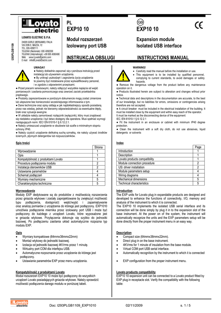 I293PLGB1109 PL EXP10 10 EXP10 10 Moduł rozszerzeń Izolowany port USB Expansion module Isolated USB interface INSTRUKCJA OBSŁUGI INSTRUCTIONS MANUAL UWAGA!! ● NaleŜy dokładnie zapoznać się z poniŜsza instrukcją przed instalacją lub uŜywaniem urządzenia. ● By uniknąć uszkodzęń i zagroŜenia Ŝycia urządzenia te powinny być instalowane przez wykwalifikowany personel, i w zgodzie z odpowienimi przepisami. ● Przed pracami serwisowymi, naleŜy odłączyć wszystkie napięcia od wejść pomiarowych i zasilania pomocniczego oraz zewrzeć zaciski przekładnika prądowego. ● Produkty zaprezentowane w poniŜszym dokumencie mogą zostać zmienione lub ulepszone bez konieczności wcześniejszego informowania o tym. ● Dane techniczne oraz opisy oddają w jak najdokładniejszy sposób posiadaną przez nas wiedzę, jednak nie bierzemy odpowiedzialności za ewentualne błędy, braki oraz sytuacje awaryjne. ● W układzie naleŜy zamontować rozłącznik (wyłącznik), który musi znajdować się niedaleko urządzenia i być łatwo dostępny dla operatora. Musi spełniać wymogi następujących norm: IEC/ EN 61010-1 § 6.12.2.1. ● NaleŜy umieszczać urządzenie w obudowie lub szafie o minimalnym stopniu ochrony IP40. ● NaleŜy czyścić urządzenie delikatną suchą szmatką, nie naleŜy uŜywać środków ściernych, płynnych detergentów lub rozpuszczalników. WARNING! • Carefully read the manual before the installation or use. • This equipment is to be installed by qualified personnel, complying to current standards, to avoid damages or safety hazards. ● Remove the dangerous voltage from the product before any maintenance operation on it. ● Products illustrated herein are subject to alteration and changes without prior notice. ● Technical data and descriptions in the documentation are accurate, to the best of our knowledge, but no liabilities for errors, omissions or contingencies arising therefore are not accepted. ● A circuit breaker must be included in the electrical installation of the building. It must be installed close by the equipment and within easy reach of the operator. It must be marked as the disconnecting device of the equipment: IEC /EN 61010-1 § 6.12.2.1 ● Fit the instrument in an enclosure or cabinet with minimum IP40 degree protection. ● Clean the instrument with a soft dry cloth, do not use abrasives, liquid detergents or solvents Spis treści Index Wprowadzenie Opis Kompatybilność z produktami Lovato Procedura podłączenia modułu Instalacja sterowników USB Ustawianie parametrów Schemat podłączeń Wymiary mechaniczne Charakterystyka techniczna Strona 1 1 1 2 2 4 4 5 5 Page 1 1 1 2 2 4 4 5 5 Introduction Description Lovato products compatibility Module connection procedure US driver installation Module parameters setup Wiring diagrams Mechanical dimensions Technical characteristics Wprowadzenie Moduły EXP dedykowane są do produktów z moŜliwością rozszerzenia przez gniazda wtykowe i zostały zaprojektowane by zwiększyć moŜliwość typu podłączenia, dostępnoćć wejść/wyjść i zapamiętywanie oraz analizę pomiarów z urządzenia do którego jest podłączony. EXP1010 umoŜliwia podłączenie miernika przez izolowany port USB i moŜe być podłączony do kaŜdego z urządzeń Lovato, które wyposaŜone jest w gniazda wtykowe. Przyłączenia dokonuje się szybko do jednostki bazowej. Po podłączeniu zasilania układ automatycznie rozpozna typ modułu EXP. Introduction The EXP units for Lovato plug in expandable products are designed and developed to enhance the functions of connectivity, I/O, memory and analysis of the instrument to which it is connected. The EXP10 10 implements the isolated USB serial interface and its connection will be done simply by plug it in to the expansion slot of the base instrument. At the power on of the system, the instrument will automatically recognize the units and the EXP parameters setup will be done directly from the proper instrument menu in an easy way. Opis • Wymiary kompaktowe (64mmx38mmx22mm) • MontaŜ wtykowy do jednostki bazowej. • Izolacja od jednostki bazowej 4KVrms przez 1 minutę. • Wirtualny port COM dla interfejsu USB. • Automatyczne rozpoznanie przez urządzenie do którego jest podłączony. • Ustawianie parametrów EXP przez menu urządzenia. Description • Compact size (64mmx38mmx22mm). • Direct plug in on the base instrument. • 4KVrms for 1 minute of insulation from the base module. • Virtual COM port USB serial interface. • Automatically recognition by the instrument to which it is connected Kompatybilność z produktami Lovato Moduł rozszerzeń EXP10 10 moŜe być podłączony do wszystkich urządzeń Lovato posiadających gniazda wtykowe. NaleŜy sprawdzić moŜliwość podłączenia danego modułu w poniŜszej tabeli. Lovato products compatibility EXP10 10 expansion unit can be connected to a Lovato product fitted by EXP plug in receptacle slot. Verify the compatibility with the following table: Doc: I293PLGB1109_EXP1010 • EXP configuration from the proper instrument menu. 02/11/2009 s. 1 / 5 EXP 10 10 Jednostka bazowa DMG700 DMG800 Wersja oprogramowania >= 01 >= 01 Procedura podłączenia modułu EXP 10 10 Base device Base device SW Rev. >= 01 >= 01 DMG700 DMG800 Module connection procedure 2 1 CLAC! * 1. Odłączyć niebezpieczne napięcie. 2. NaleŜy zdjąć osłonę zacisków i zaciski przyłączeniowe. 3. Następnie naleŜy zdjąć osłonę otworu montaŜowego w produkcie Lovato, w miejscu gdzie EXP będzie zamontowany. 4. NaleŜy włoŜyć moduł EXP10 10 tak by klips montaŜowy znalazł się w dziurce powyŜej otworu montaŜowego i stanowił oś oparcia podczas wkładania modułu. 5. NaleŜy umieścić moduł EXP w otworze montaŜowym poprzez niewielki ruch. 6. NaleŜy ponownie umieścić osłonę zacisków i zaciski przyłączeniowe. 7. Następnie włączyć zasilanie (jednostka bazowa automatycznie rozpozna podłączony mod