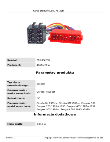 Karta produktu ZRS-AS-23B Symbol: ZRS-AS-23B Producent: 4CARMEDIA Parametry produktu Typ złącza samochodowego: Przeznaczenie marka samochodu: adapter Citroën, Peugeot Rodzaj złącza: ISO Przeznaczenie - Citroën BX 1989->, Citroën XM 1989->, Peugeot 106, model samochodu: Peugeot 205 1983->1996, Peugeot 405 1987->1992, Peugeot 505 1986->, Peugeot 605 1990->1999 Informacje dodatkowe Masa brutto: Strona: 1 0,044 kg http://pl.4carmedia.com/product/4carmedia/adapter/zrs-as-23b