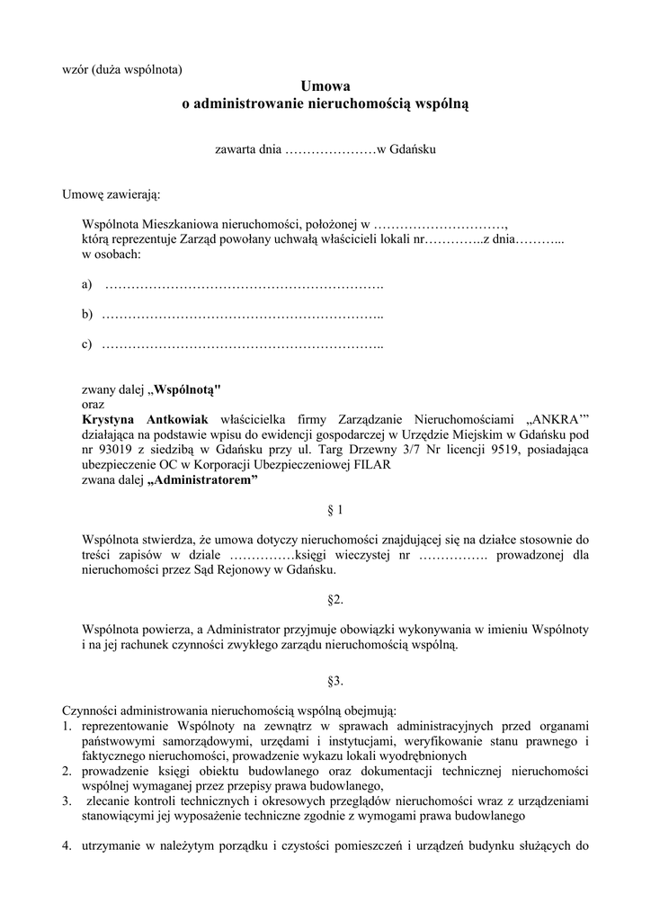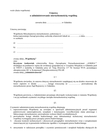 wzór (duża wspólnota) Umowa o administrowanie nieruchomością wspólną zawarta dnia …………………w Gdańsku Umowę zawierają: Wspólnota Mieszkaniowa nieruchomości, położonej w …………………………, którą reprezentuje Zarząd powołany uchwałą właścicieli lokali nr…………..z dnia………... w osobach: a) ………………………………………………………. b) ……………………………………………………….. c) ……………………………………………………….. zwany dalej „Wspólnotą" oraz Krystyna Antkowiak właścicielka firmy Zarządzanie Nieruchomościami „ANKRA’” działająca na podstawie wpisu do ewidencji gospodarczej w Urzędzie Miejskim w Gdańsku pod nr 93019 z siedzibą w Gdańsku przy ul. Targ Drzewny 3/7 Nr licencji 9519, posiadająca ubezpieczenie OC w Korporacji Ubezpieczeniowej FILAR zwana dalej „Administratorem” §1 Wspólnota stwierdza, że umowa dotyczy nieruchomości znajdującej się na działce stosownie do treści zapisów w dziale ……………księgi wieczystej nr ……………. prowadzonej dla nieruchomości przez Sąd Rejonowy w Gdańsku. §2. Wspólnota powierza, a Administrator przyjmuje obowiązki wykonywania w imieniu Wspólnoty i na jej rachunek czynności zwykłego zarządu nieruchomością wspólną. §3. Czynności administrowania nieruchomością wspólną obejmują: 1. reprezentowanie Wspólnoty na zewnątrz w sprawach administracyjnych przed organami państwowymi samorządowymi, urzędami i instytucjami, weryfikowanie stanu prawnego i faktycznego nieruchomości, prowadzenie wykazu lokali wyodrębnionych 2. prowadzenie księgi obiektu budowlanego oraz dokumentacji technicznej nieruchomości wspólnej wymaganej przez przepisy prawa budowlanego, 3. zlecanie kontroli technicznych i okresowych przeglądów nieruchomości wraz z urządzeniami stanowiącymi jej wyposażenie techniczne zgodnie z wymogami prawa budowlanego 4. utrzymanie w należytym porządku i czystości pomieszczeń i urządzeń budynku służących do wspólnego użytku właścicieli lokali (w tym dźwigów osobowych), terenu nieruchomości określonego w § l umowy, chodnika przed nieruchomością i innych terenów, jeżeli obowiązek taki wynika z zawartych umów bądź z postanowień ustaw; do obowiązków Administratora należy zawieranie umów związanych z realizacją tego zadania poprzez angażowanie dozorcy lub wybór innej formy działania, 5. zapewnienie dla nieruchomości wspólnej dostaw energii elektrycznej , energii cieplnej ciepłej i zimnej wody odbioru ścieków komunalnych wywozu nieczystości bytowych i nietypowych. 6. zapewnienie usług konserwacyjno- remontowych budynku, usług konserwacji dźwigów, domofonu. 7. zapewnienie bieżącej konserwacji i bieżących napraw nieruchomości wspólnej, a w szczególności dokonywanie napraw budynku i jego pomieszczeń wspólnych oraz urządzeń technicznych umożliwiających właścicielom lokali korzystanie z oświetlenia, ogrzewania lokalu, ciepłej i zimnej wody, gazu, dźwigów osobowych, i innych urządzeń należących do wyposażenia nieruchomości wspólnej, 8. ubezpieczenie budynku od O.C. i zdarzeń losowych , opłacanie podatków i innych opłat publiczno- prawnych przypadających od nieruchomości wspólnej chyba, że są pokrywane bezpośrednio przez właścicieli poszczególnych lokali 9. zawieranie umów w uzgodnieniu z Zarządem o roboty bądź usługi związane z realizacją zadań wynikających z umowy, kontrola prawidłowości wykonania tych umów oraz ich rozwiązywanie w przypadkach uzasadnionych 10. rozliczanie z właścicielami opłat z tytułu kosztów zarządu nieruchomością wspólną zgodnie z art. 14 w ciągu roku w formie miesięcznych zaliczek określonych uchwałą właścicieli lokali. 11. pobieranie należności z tytułu pożytków i innych przychodów z nieruchomości wspólnej 12. potwierdzanie uprawnień w sprawach meldunkowych w zakresie określonym ustawą o ewidencji – dla właścicieli lokali ( z wyłączeniem gminy) 13. wydawanie poświadczeń bądź zaświadczeń (w stosunku do właścicieli dotyczących między innymi uprawnień do dodatków mieszkaniowych, pomocy społecznej wysokości wpłat na fundusz remontowy itp. 14. prowadzenie księgowości na zasadach ewidencji przychodów i kosztów, zgodnie z Rozporządzeniem Ministra Finansów z dnia 28 sierpnia 2000r. 15. dokonywanie rozliczeń wyłącznie poprzez rachunek bankowy należący do Wspólnoty w tym odrębny dla funduszu remontowego 16. sporządzanie rocznego sprawozdania finansowego wraz z wyciągiem bankowym na dzień sporządzenia sprawozdania finansowego i dostarczenie go Właścicielom na zebraniu wspólnoty. 17. zwoływanie zebrań Wspólnoty w uzgodnieniu z Zarządem raz w roku po zakończeniu roku obrachunkowego, nie później niż. do 31 marca roku następnego (w celu przedłożenia sprawozdania i rozliczenia wydatków wspólnoty ) zgodnie z wymogami ustawy o własności lokali. 18. przygotowywanie rocznego projektu planu gospodarczego (w formie planu rzeczowofinansowego) z wyodrębnieniem funduszu remontowego Wspólnoty (w uzgodnieniu z Zarządem). 19. Administrator zapewnia jeden raz na kwartał spotkanie z Zarządem wspólnoty, na którym przedstawia wyciąg z kont bankowych wspólnoty (z wyłączeniem przypadków zawartych w paragrafie 4) §4 W przypadku wystąpienia zagrożenia dla nieruchomości wspólnej lub jej mieszkańców Wspólnota zobowiązuje Administratora, (w uzgodnieniu z Zarządem wspólnoty) do podjęcia niezbędnych działań finansowanych ze środków zgromadzonych na rachunkach bankowych wspólnoty, mających na celu usunięcie niebezpieczeństwa dla ludzi i mienia, w szczególności zabezpieczenie budynku przed katastrofą budowlaną i innymi następstwami zagrożenia, zaś w przypadku awarii usunięcie jej przyczyn i skutków, szczególnie tych, które uniemożliwiają nieprzerwane korzystanie