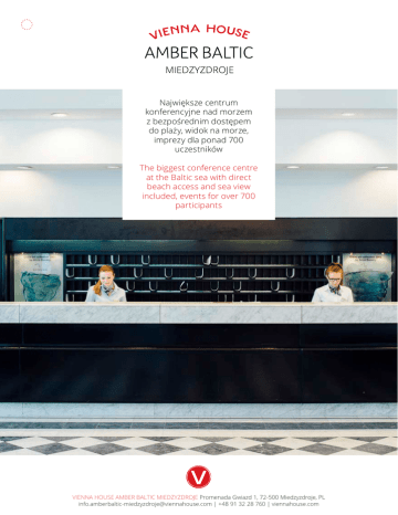 Największe centrum konferencyjne nad morzem z bezpośrednim dostępem do plaży, widok na morze, imprezy dla ponad 700 uczestników The biggest conference centre at the Baltic sea with direct beach access and sea view included, events for over 700 participants VIENNA HOUSE AMBER BALTIC MIEDZYZDROJE Promenada Gwiazd 1, 72-500 Miedzyzdroje, PL [email protected] | +48 91 32 28 760 | viennahouse.com IDEALNE MIEJSCE NA KONFERENCJĘ Po owocnym spotkaniu Twoi współpracownicy i goście całkowicie zapomną o pracy, wypiją orzeźwiającego drinka na tarasie z widokiem na bezkresne morze i pójdą przejść się lub pobiegać po plaży. Centrum konferencyjne ma 6 sal konferencyjnych i może pomieścić do 700 osób. Idealnie nadaje się na organizację zapadających w pamięć seminariów, bankietów, wesel i imprez okolicznościowych. CENTRUM KONFERENCYJNE CONFERENCE CENTRE • 6 sal konferencyjnych do 700 osób • 6 meeting rooms for up to 700 people • 677 m² powierzchni konferencyjnej i eventowej • 677 m² conference & event space • Dream wedding location right on the beach or ball room • Wymarzone miejsce na wesele na plaży lub sali bankietowej • Spacious foyer • Przestronne foyer • Free high-speed WiFi • Bezpłatne szybkie WiFi • 60 parking spaces • 60 miejsc parkingowych TECHNICAL EQUIPMENT WYPOSAŻENIE TECHNICZNE WYPOSAŻENIE: Ekran, flipchart, notatniki, długopisy PRZECHOWALNIA: Możliwa do zaaranżowania SZATNIA: Możliwa do zaaranżowania SPRZĘT: Krzesła, stoły, podest, parkiet (25 m2), możliwość dowolnego zaaranżowania ustawienia zgodnie z oczekiwaniami klienta A CONFERENCE OASIS ON THE AMBER COAST Double the productivity of meetings. Why? Because after a productive meeting, the endless stretch of ocean will entice to switch off, have a refreshing drink on the summer terrace and head down to the beach for a stroll or a jog. The conference centre has 6 conference rooms and can cater for up to 700 people for memorable seminars, banquets, conferences, weddings and private events. EQUIPMENT: Projector screen, flipchart, notepads, pens STORE ROOM: Available upon request CLOAKROOM: Available upon request FURNITURE: Chairs, tables, platform, dance floor (25 m2), can be adjusted to meet client requirements VIENNA HOUSE AMBER BALTIC MIEDZYZDROJE Promenada Gwiazd 1, 72-500 Miedzyzdroje, PL [email protected] | +48 91 32 28 760 | viennahouse.com PODSUMOWANIE OVERVIEW SALA KONFERENCYJNA MEETING ROOMS m2 WYMIARY (m) DIMENSIONS (m) Kalman lub Lehar 88 7,35x12 64 48 Kalman i Lehar 176 14,7x12 140 Offenbach 27 6,4x4,2 - 40 35 55 120 48 65 120 - 11 - - Strauss 44 6,4x6,9 32 24 20 18 33 Casino 250 14,5x18 370 160 - 80 140 Chopin 180 11,8x15,3 140 100 60 80 130 Terrace Beach Bar Night Club Wellness Area Bowling KALMAN LEHAR Brasserie Promenade Lobby JOHANN STAUSS Indoor Swimming Pool Amber Bar OFFENBACH Gourmet Restaurant Chopin Reception Entrance Cloak Room Wiener Cafe Shop Boutique Hairdresser Main Hotel Entrance VIENNA HOUSE AMBER BALTIC MIEDZYZDROJE Promenada Gwiazd 1, 72-500 Miedzyzdroje, PL [email protected] | +48 91 32 28 760 | viennahouse.com CASINO LOKALIZACJA • Centrum wystawiennicze: 100 m • Najbliższy przystanek autobusowy: 700 m • Stacja kolejowa: 1 km • Terminal promowy Świnoujście: 15 km • Lotnisko Szczecin-Goleniów im. NSZZ Solidarność: 55 km LOCATION • Exhibition centre: 100 m • Nearest bus stop: 700 m • Main railway station: 1 km • Świnoujście ferry terminal: 15 km • Szczecin – Goleniow Solidarity Airport: 55 km VIENNA HOUSE AMBER BALTIC MIEDZYZDROJE Promenada Gwiazd 1, 72-500 Miedzyzdroje, PL [email protected] | +48 91 32 28 760 | viennahouse.com