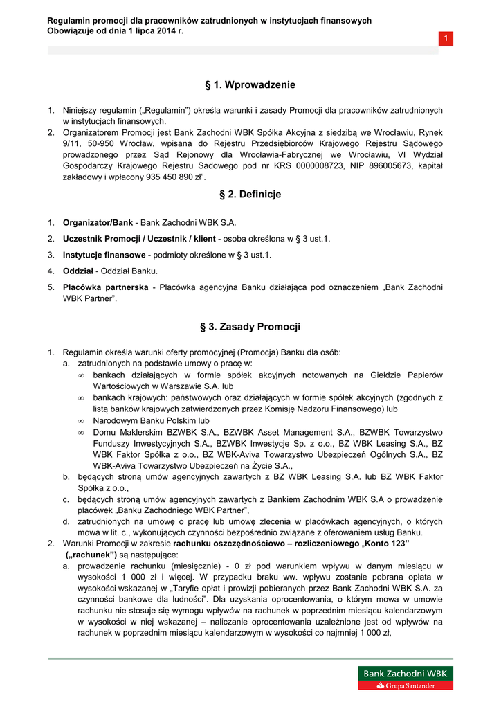 Regulamin promocji dla pracowników zatrudnionych w instytucjach finansowych Obowiązuje od dnia 1 lipca 2014 r. § 1. Wprowadzenie 1. Niniejszy regulamin („Regulamin”) określa warunki i zasady Promocji dla pracowników zatrudnionych w instytucjach finansowych. 2. Organizatorem Promocji jest Bank Zachodni WBK Spółka Akcyjna z siedzibą we Wrocławiu, Rynek 9/11, 50-950 Wrocław, wpisana do Rejestru Przedsiębiorców Krajowego Rejestru Sądowego prowadzonego przez Sąd Rejonowy dla Wrocławia-Fabrycznej we Wrocławiu, VI Wydział Gospodarczy Krajowego Rejestru Sadowego pod nr KRS 0000008723, NIP 896005673, kapitał zakładowy i wpłacony 935 450 890 zł”. § 2. Definicje 1. Organizator/Bank - Bank Zachodni WBK S.A. 2. Uczestnik Promocji / Uczestnik / klient - osoba określona w § 3 ust.1. 3. Instytucje finansowe - podmioty określone w § 3 ust.1. 4. Oddział - Oddział Banku. 5. Placówka partnerska - Placówka agencyjna Banku działająca pod oznaczeniem „Bank Zachodni WBK Partner”. § 3. Zasady Promocji 1. Regulamin określa warunki oferty promocyjnej (Promocja) Banku dla osób: a. zatrudnionych na podstawie umowy o pracę w: • bankach działających w formie spółek akcyjnych notowanych na Giełdzie Papierów Wartościowych w Warszawie S.A. lub • bankach krajowych: państwowych oraz działających w formie spółek akcyjnych (zgodnych z listą banków krajowych zatwierdzonych przez Komisję Nadzoru Finansowego) lub • Narodowym Banku Polskim lub • Domu Maklerskim BZWBK S.A., BZWBK Asset Management S.A., BZWBK Towarzystwo Funduszy Inwestycyjnych S.A., BZWBK Inwestycje Sp. z o.o., BZ WBK Leasing S.A., BZ WBK Faktor Spółka z o.o., BZ WBK-Aviva Towarzystwo Ubezpieczeń Ogólnych S.A., BZ WBK-Aviva Towarzystwo Ubezpieczeń na Życie S.A., b. będących stroną umów agencyjnych zawartych z BZ WBK Leasing S.A. lub BZ WBK Faktor Spółka z o.o., c. będących stroną umów agencyjnych zawartych z Bankiem Zachodnim WBK S.A o prowadzenie placówek „Banku Zachodniego WBK Partner”, d. zatrudnionych na umowę o pracę lub umowę zlecenia w placówkach agencyjnych, o których mowa w lit. c., wykonujących czynności bezpośrednio związane z oferowaniem usług Banku. 2. Warunki Promocji w zakresie rachunku oszczędnościowo – rozliczeniowego „Konto 123” („rachunek”) są następujące: a. prowadzenie rachunku (miesięcznie) - 0 zł pod warunkiem wpływu w danym miesiącu w wysokości 1 000 zł i więcej. W przypadku braku ww. wpływu zostanie pobrana opłata w wysokości wskazanej w „Taryfie opłat i prowizji pobieranych przez Bank Zachodni WBK S.A. za czynności bankowe dla ludności”. Dla uzyskania oprocentowania, o którym mowa w umowie rachunku nie stosuje się wymogu wpływów na rachunek w poprzednim miesiącu kalendarzowym w wysokości w niej wskazanej – naliczanie oprocentowania uzależnione jest od wpływów na rachunek w poprzednim miesiącu kalendarzowym w wysokości co najmniej 1 000 zł, 1 Regulamin promocji dla pracowników zatrudnionych w instytucjach finansowych Obowiązuje od dnia 1 lipca 2014 r. 2 b. Promocja przysługuje na wniosek klienta złożony wraz z otwarciem rachunku w Oddziale, w Placówce Partnerskiej lub w dowolnym momencie obowiązywania umowy rachunku, c. warunkiem skorzystania z Promocji jest akceptacja i podpisanie Regulaminu promocji w Oddziale lub Placówce Partnerskiej wraz z podpisaniem umowy rachunku lub w dowolnym momencie jej obowiązywania, d. z Promocji mogą skorzystać klienci, którzy spełniają kryterium zatrudnienia określone w ust. 1 lit. a., b., c. lub d. Regulaminu, w dniu przystąpienia do Promocji oraz na żądanie Banku wykażą je odpowiednim dokumentem. W przypadku rachunku wspólnego kryterium zatrudnienia powinien spełniać przynajmniej jeden ze współposiadaczy , e. Promocja obowiązuje przez okres obowiązywania umowy rachunku z zastrzeżeniem ust. 12. 3. Warunki Promocji w zakresie „Konta oszczędnościowego” są następujące: a. opłata za transakcje realizowane w usługach BZWBK24 w formie przelewu na rachunek w BZ WBK i na rachunek w innym banku w systemie ELIXIR oraz zlecenia stałego z Konta oszczędnościowego prowadzonego w PLN – 0 zł (opłaty związane z potwierdzeniem operacji smsKodem / tokenem nie są objęte Promocją), b. Promocja przysługuje na wniosek klienta złożony wraz z otwarciem Konta oszczędnościowego w Oddziale, w Placówce Partnerskiej lub w dowolnym momencie obowiązywania umowy Konta oszczędnościowego, c. warunkiem skorzystania z Promocji jest akceptacja i podpisanie Regulaminu promocji w Oddziale lub Placówce Partnerskiej wraz z podpisaniem umowy Konta oszczędnościowego lub w dowolnym momencie jej obowiązywania, d. z Promocji mogą skorzystać klienci, którzy spełniają kryterium zatrudnienia określone w ust. 1 lit. a., b., c. lub d. Regulaminu, w dniu przystąpienia do Promocji oraz na żądanie Banku wykażą je odpowiednim dokumentem. W przypadku Konta oszczędnościowego wspólnego kryterium zatrudnienia powinien spełniać przynajmniej jeden ze współposiadaczy Konta oszczędnościowego, e. Promocja obowiązuje przez okres obowiązywania umowy Konta oszczędnościowego z zastrzeżeniem ust. 12. 4. Warunki Promocji w zakresie kart płatniczych do rachunków są następujące: a. opłata za generowanie zestawienia transakcji dokonanych SuperKartą MasterCard PAYBACK – 0 zł., b. opłata miesięczna za SuperKartę MasterCard PAYBACK – 0 zł., c. wypłata gotówki SuperKartą MasterCard PAYBACK w bankomatach i terminalach innych banków i instytucji w kraju i zagranicą – 0zł., d. opłata za wypłatę gotówki w ramach usługi Cash back SuperKartą MasterCard PAYBACK – 0 zł., e. wyprodukowanie nowej SuperKarty MasterCard PAYBACK w trybie ekspresowym – 0 zł., f. sprawdzenie dostępnych środków lub wygenerowanie miniwyciągu w bankomatach sieci BZWBK24 z wykorzystaniem SuperKarty MasterCard PAYBACK – 0 zł., g. wygenerowanie no