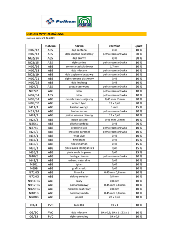 DEKORY WYPRZEDAŻOWE stan na dzień 29.12.2015 nazwa rozmiar N02/12 N02/13 N02/14 N02/15 N02/16 N02/18 N02/19 N02/21 N02/25 N04/2 N07/2 N07/5A N09/5A N09/5B N11/1 N17/2A N24/2 N24/3 N25/1 N27/1 N27/2 N34/1 N35/1 N35/2 N36/1 N36/2 N40/2 N43/1 N501 N69B N71HG N72HG N114HG N117HG N120HG N181B N708B material ABS ABS ABS ABS ABS ABS ABS ABS ABS ABS ABS ABS ABS ABS ABS ABS ABS ABS ABS ABS ABS ABS ABS ABS ABS ABS ABS ABS ABS ABS ABS ABS ABS ABS ABS ABS ABS dąb santana dąb santana rustikalny dąb czarny dąb cortina sonoma czekoladowa dąb mleczny dąb bagienny brązowy dąb cremona piaskowy dąb lindberg grusza czerwona klon klon orzech francuski jasny orzech lyon kasztan wenge limba ciemna jesion werona ciemny jesion cassino oliwka cordoba crossline late crossline caramel wiąz vivo fino brąze fino cynamon pinia avola szampaoska pinia avola brązowa bodega ciemna urbano naturalne tytan grafit credo limonka zielony seledyn szary pomaraoczowy niebieski szafirowy bordowy merlo popiel 0,45 pełna rozmiarówka 0,45 pełna rozmiarówka 1,7 mm pełna rozmiarówka pełna rozmiarówka 0,45 0,45 pełna rozmiarówka pełna rozmiarówka pełna rozmiarówka 0,45 mm 2 mm 19 x 0,45 1 mm pełna rozmiarówka 19 x 0,45 0,45 mm 2 mm 0,45 pełna rozmiarówka pełna rozmiarówka 0,45 0,45 0,45 0,45 0,45 pełna rozmiarówka 0,45 0,45 0,45 0,45 mm 0,8 mm 0,8 mm 0,8 mm 0,45 mm 0,8 mm 0,8 mm 0,45 mm 0,8 mm 28 x 0,45 upust 10 % 20 % 20 % 10 % 10 % 10 % 10 % 10 % 10 % 20 % 10 % 10 % 20 % 20 % 15 % 20 % 10 % 10 % 20 % 10 % 10 % 10 % 15 % 15 % 15 % 15 % 20 % 10 % 10 % 10 % 10 % 10 % 10 % 10 % 10 % 10 % 10 % 01/4 PVC buk 381 19 x 1 10 % 02/5C 02/13 PVC PVC dąb mleczny dąb rustykalny 19 x 0,6; 19 x 1 ; 22 x 1 19 x 0,6 10 % 10 % 03/1 PVC 04/1 05/4 05/5 PVC PVC PVC 07/2 09/4 PVC PVC 09/8 17/1C PVC PVC 17/2 17/2C 24/2 PVC PVC PVC wiśnia (stare wybarwienie) grusza dzika (stare wybarwienie) olcha (stare wybarwienie) olcha górska klon vancouver (stare wybarwienie) orzech ciemny krono orzech california ciemny (stare wybarwienie ) limba limba ciemna (stare wybarwienie) limba ciemna jesion coimbra 29/1 30/1 39/1 52B 63B 67B 01/4 02/5 02/13 PVC PVC PVC PVC PVC PVC PVC PVC PVC malibu (stare wybarwienie) akacja platan monaco ciemny popiel zielony jasny aluminium buk 381 dąb mleczny dąb rustykalny 22 x 0,6; 42 x 2 10 % 22 x 2 22 x 0,6 19 x 1 19 x 0,6; 22 x 0,6; 42 x 2; 28 x 2 19 x 0,6 10 % 10 % 10 % 22 x 0,6; 22 x 1 19 x 1 10 % 10 % 32 x 2 19 x 0,6 19 x 0,6 10 % 10 % 10 % 19 x 0,6 19 x 2 42 x 1 19 x 1 19 x 0,6 19 x 0,6 10 % 10 % 10 % 10 % 10 % 10 % 10 % 10 % 10 % 19 x 0,6; 19 x 1; 22 x 1 19 x 0,6 10 % 10 %