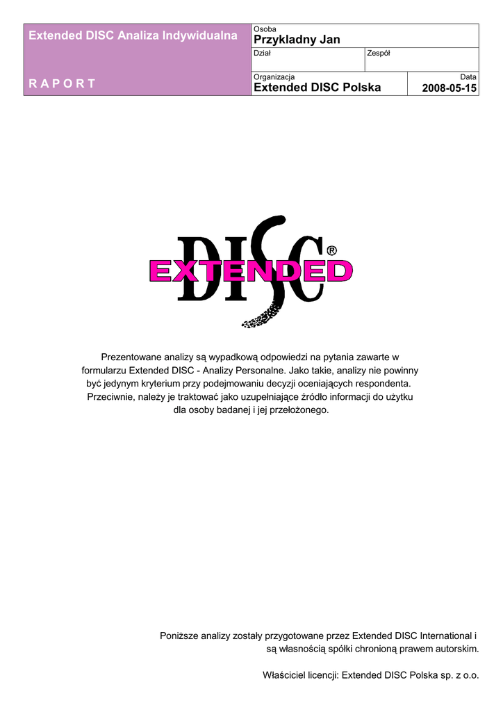 Extended DISC Analiza Indywidualna Osoba Przykladny Jan Dział RAPORT Zespół Organizacja Extended DISC Polska Data 2008-05-15 Prezentowane analizy są wypadkową odpowiedzi na pytania zawarte w formularzu Extended DISC - Analizy Personalne. Jako takie, analizy nie powinny być jedynym kryterium przy podejmowaniu decyzji oceniających respondenta. Przeciwnie, należy je traktować jako uzupełniające źródło informacji do użytku dla osoby badanej i jej przełożonego. Poniższe analizy zostały przygotowane przez Extended DISC International i są własnością spółki chronioną prawem autorskim. Właściciel licencji: Extended DISC Polska sp. z o.o. Extended DISC Analiza Indywidualna Strefy Elastyczności C Przykladny Jan Extended DISC Polska Fakty, zasady, analizy, systemy, krytycyzm, tworzenie, kształtowanie, cele, wyniki, przyśpieszenie 2008-05-15 D Przywiązanie, cierpliwość, stabilność, wszechstronność, dokładność, upór, polecenia, szczegóły Trwałe wartości, decyzje, zmiana, szybkość, aktywność, inspiracja, atmosfera, otwartość, zadowolenie S Stabilność, zaufanie, zaradność, wyczucie, elokwencja, uczestnictwo, koleżeństwo, łatwość kontaktów I Strefy Elastyczności: Strefa aktualna = pozycja przypisana do danego profilu w chwili obecnej Naturalna strefa elastyczności = obszar, w kierunku którego dany profil może przesuwać się samoczynnie Strefa najłatwiejszego rozwoju = obszar, w kierunku którego najłatwiej będzie kształtować dany profil Strefa najtrudniejszego rozwoju = jej kształtowanie wymaga świadomej i ciągłej korekty zachowania -2- © Copyright 1995-2008 – Extended DISC International Właściciel licencji: Extended DISC Polska sp. z o.o. Extended DISC Analiza Indywidualna Osoba Przykladny Jan Organizacja Extended DISC - Profil Extended DISC Polska Profil I - zachowania adaptowane D I Data S 2008-05-15 Profil II - zachowania naturalne C D I S C Strefa Górna Strefa normalna Strefa neutralna Strefa normalna Strefa dolna 100 00 00 30 00 30 00 40 60 00 00 30 00 70 40 00 19 1 0 0 0 6 11 3 Extended DISC - Diament C Odległość Logika D Fakty Poprawność Wyniki Zmiana Jan P Precyzyjność Reguły Wpływ Aktywność Całokształt Gruntowność Ludzie Czynniki pozytywne S Uczynność Koleżeństwo -3- I © Copyright 1995-2008 – Extended DISC International Właściciel licencji: Extended DISC Polska sp. z o.o. Extended DISC Analiza Indywidualna Strona tekstowa Przykladny Jan Extended DISC Polska 2008-05-15 Strona ta zawiera opis, jak osoba o takim stylu zachowania jest zazwyczaj postrzegana przez innych. Przeczytaj ten tekst jako całość i wykorzystaj go do zrozumienia ogólnej charakterystyki tego stylu. Przy rozważaniu poszczególnych zdań, należy wziąć pod uwagę zdolność człowieka do świadomego dostosowywania zachowania. Innymi słowy, podczas gdy tekst opisuje typowe zachowanie osób o tym stylu, respondent z pewnością może modyfikować swoje zachowanie dopasowując się do konkretnej sytuacji lub osoby. Ponadto respondent mógł trwale zmodyfikować swoje zachowanie w niektórych obszarach poprzez nabycie nowych umiejętności. Atrybuty: Nacechowany silną wolą, dokładny, elokwentny, kontroluje, pracowity, zdeterminowany, rzeczowy, zagłębia się w temat, ambitny, niecierpliwy, dociekliwy. perfekcjonista, Czynniki motywujące: Respondent znajduje zadowolenie w planowaniu i tworzeniu. Ponieważ pragnie wykonywać swoje obowiązki jak najlepiej, dlatego chętnie pracuje samodzielnie. Jest szczęśliwy, kiedy inni uważają go za specjalistę i człowieka charakteryzującego się wysokimi umiejętnościami. Lubi nowe wyzwania i możliwości do pogłębiania swojej wiedzy. Stara się unikać: Chociaż wydaje się, że jest osobą pragnącą zachować dystans i niezbyt przystępną, to jednak nie lubi pracować w samotności. Łatwo ogarnia go znudzenie i chce, aby sytuacje zmieniały się szybko. Unika pustych słów – preferuje dyskusje na tematy praktyczne. Chociaż działa w pośpiechu, to jednak nie lubi być zmuszany do podejmowania szybkich decyzji. Idealny przełożony: Mogłoby się wydawać, że osoba taka w ogóle nie wymaga przełożonego. Prawda jest taka, że pracownik taki nie potrzebuje przełożonego, który wymaga jego nieustannej obecności! Przełożony powinien opracowywać ramy działania, wskazywać odpowiednie standarty, wyznaczyć cele, określać prowadzącą do nich drogę, ale potem pracownik powinien mieć prawo do samodzielnego i swobodnego wykonywania zadań. Czasami przełożony powinien zachęcić go do intensywniejszego działania, a także żądać jasnych wyjaśnień. Styl komunikacji: Zazwyczaj uczestnik badania jawi się jako osoba praktyczna, ale czasami komunikuje się w sposób zawiły i skomplikowany. Lubi konfrontować fakty uznawane za prawdziwe ze wszystkich możliwych stron. W tłumie jest raczej cichy niż rozmowny, ale to nie znaczy, że wtedy aktywnie słucha. Osoba taka słucha tylko „rzeczy interesujących”, które prezentowane są w „interesujący sposób”. Niektórzy ludzie myślą o nim, że jest mało przystępny. Sposób podejmowania decyzji: Odczuwa silną potrzebę do podejmowania decyzji, ale jednocześnie musi być stuprocentowo przekonany, co do swojego postępowania. Zbieranie informacji, analizy i rozważania potrafią odpowiednio spowolnić proces decyzyjny. -4- © Copyright 1995-2008 – Extended DISC International Właściciel licencji: Extended DISC Polska sp. z o.o. Extended DISC Analiza Indywidualna Czynniki motywujące Przykladny Jan Extended DISC Polska 2008-05-15 Czynniki motywujące Te elementy zazwyczaj motywują respondenta. Respondent reaguje pozytywnie, jeśli natężenie tych elementów wzrasta w środowisku pracy. • • • • • • • • • • • • Możliwość tworzenia i rozwijania zupełnie nowych rzeczy Nieograniczona ilość możliwości Możliwość projektowania własnego planu działania Podejmowanie po