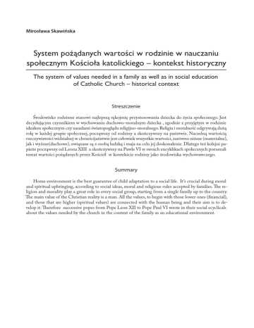 Mirosława Skawińska System pożądanych wartości w rodzinie w nauczaniu społecznym Kościoła katolickiego – kontekst historyczny The system of values needed in a family as well as in social education of Catholic Church – historical context Streszczenie Środowisko rodzinne stanowi najlepszą rękojmię przystosowania dziecka do życia społecznego. Jest decydującym czynnikiem w wychowaniu duchowo-moralnym dziecka , zgodnie z przyjętym w rodzinie ideałem społecznym czy zasadami światopoglądu religijno-moralnego. Religia i moralność odgrywają dużą rolę w każdej grupie społecznej, począwszy od rodziny a skończywszy na państwie. Naczelną wartością rzeczywistości widzialnej w chrześcijaństwie jest człowiek wszystkie wartości, zarówno niższe (materialne), jak i wyższe(duchowe), związane są z osobą ludzką i maja na celu jej doskonalenie. Dlatego też kolejni papieże począwszy od Leona XIII a skończywszy na Pawle VI w swoich encyklikach społecznych poruszali temat wartości pożądanych przez Kościół w kontekście rodziny jako środowiska wychowawczego. Summary Home environment is the best guarantee of child adaptation to a social life. It’s crucial during moral and spiritual upbringing, according to social ideas, moral and religious rules accepted by families. The religion and morality play a great role in every social group, starting from a single family up to the country. The main value of the Christian reality is a man. All the values, to begin with those lower ones (financial), and those that are higher (spiritual values) are connected with the human being and their aim is to develop it. Therefore successive popes from Pope Leon XII to Pope Paul VI wrote in their social ecyclicals about the values needed by the church in the context of the family as an educational environment.