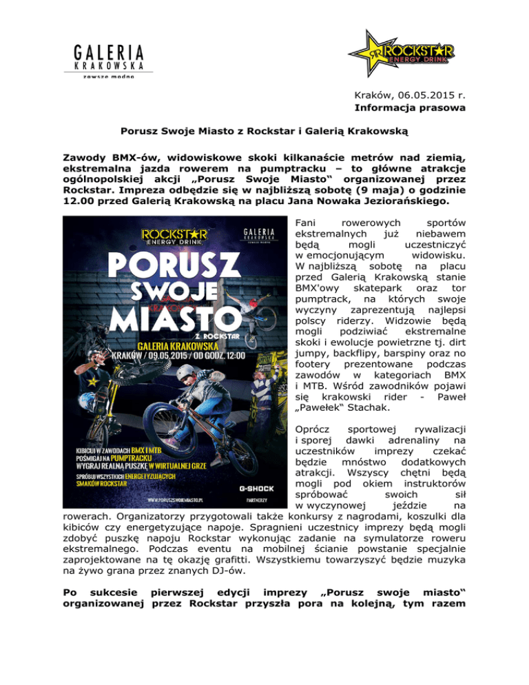 Kraków, 06.05.2015 r. Informacja prasowa Porusz Swoje Miasto z Rockstar i Galerią Krakowską Zawody BMX-ów, widowiskowe skoki kilkanaście metrów nad ziemią, ekstremalna jazda rowerem na pumptracku – to główne atrakcje ogólnopolskiej akcji „Porusz Swoje Miasto“ organizowanej przez Rockstar. Impreza odbędzie się w najbliższą sobotę (9 maja) o godzinie 12.00 przed Galerią Krakowską na placu Jana Nowaka Jeziorańskiego. Fani rowerowych sportów ekstremalnych już niebawem będą mogli uczestniczyć w emocjonującym widowisku. W najbliższą sobotę na placu przed Galerią Krakowską stanie BMX'owy skatepark oraz tor pumptrack, na których swoje wyczyny zaprezentują najlepsi polscy riderzy. Widzowie będą mogli podziwiać ekstremalne skoki i ewolucje powietrzne tj. dirt jumpy, backflipy, barspiny oraz no footery prezentowane podczas zawodów w kategoriach BMX i MTB. Wśród zawodników pojawi się krakowski rider - Paweł „Pawełek“ Stachak. Oprócz sportowej rywalizacji i sporej dawki adrenaliny na uczestników imprezy czekać będzie mnóstwo dodatkowych atrakcji. Wszyscy chętni będą mogli pod okiem instruktorów spróbować swoich sił w wyczynowej jeździe na rowerach. Organizatorzy przygotowali także konkursy z nagrodami, koszulki dla kibiców czy energetyzujące napoje. Spragnieni uczestnicy imprezy będą mogli zdobyć puszkę napoju Rockstar wykonując zadanie na symulatorze roweru ekstremalnego. Podczas eventu na mobilnej ścianie powstanie specjalnie zaprojektowane na tę okazję grafitti. Wszystkiemu towarzyszyć będzie muzyka na żywo grana przez znanych DJ-ów. Po sukcesie pierwszej edycji imprezy „Porusz swoje miasto“ organizowanej przez Rockstar przyszła pora na kolejną, tym razem w Krakowie. Wszyscy chętni wrażeń będą mogli przeżywać sportowe emocje już w sobotę 9 maja o godz. 12:00 przed Galerią Krakowską. iecej informacji udziela: Ryszard ysokiński - Dyrektor Centrum Galerii Krakowskiej, ECE Projektmanagement Polska, tel.: +48 12 428 99 00, e-mail:[email protected]