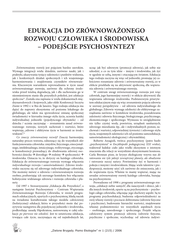 EDUKACJA DO ZRÓWNOWAŻONEGO ROZWOJU CZŁOWIEKA I ŚRODOWISKA – PODEJŚCIE PSYCHOSYNTEZY Zrównoważony rozwój jest pojęciem bardzo szerokim. Wymaga integracji wielu dziedzin, zarówno nauki, jak i praktyki, ukazywania tysięcy zależności i punktów widzenia, jak i konkretnych działań społecznych i ich wzajemnego harmonizowania i znajdowania czynników równoważenia. Kluczowym warunkiem wprowadzania w życie zasad zrównoważonego rozwoju, zarówno dla ochrony środowiska przed totalną degradacją, jak i dla zachowania go w niezmienionym stanie dla przyszłych pokoleń, jest edukacja społeczna1). Została ona zapisana w wielu dokumentach międzynarodowych i krajowych, jako efekt Konferencji Szczytu Ziemi w 1992 r. w Rio de Janeiro. Tego rodzaju edukacja ma dążyć do naprawy ekosystemu od poziomu lokalnego do globalnego, ale także ma spowodować zmianę społecznej świadomości w kierunku innego stylu życia, uczenia każdej indywidualnej jednostki (pojedynczego obywatela) – od dziecka / ucznia zaczynając – zrozumienia zasad zrównoważonego rozwoju, nowych zachowań i wartości, które wspierają „zdrowe i efektywne życie w harmonii ze środowiskiem”.2) Co znaczy zrównoważony rozwój? Znaczy harmonijny, naturalny proces wzrostu, odnoszący się do wszystkich sfer funkcjonowania człowieka: zmysłów, fizycznego, emocjonalnego, intelektualnego, intuicyjnego, wolitywnego, etycznego, w konsekwencji prowadzący do zbudowania zdrowej osobowości dziecka à dorosłego à rodziny à społeczności à środowiska. Oznacza to, że dotyczy on każdego człowieka. Edukacja do zrównoważonego rozwoju wymaga włączenia indywidualnego rozwoju i samoświadomości. Zdrowe środowisko zaczyna się od zdrowego indywidualnego człowieka. Nie możemy mówić o zdrowiu i zrównoważonym rozwoju osobno, pozbawiając ich szerszego kontekstu bez włączania holistycznie widzianego zdrowia i rozwoju człowieka i planety. Od 1997 r. Stowarzyszenie „Edukacja dla Przyszłości”, a następnie Instytut Psychosyntezy – Centrum Wspierania Zrównoważonego Rozwoju Człowieka, w swoich programach edukacyjnych, opartych o psychosyntezę, kładą nacisk na świadome kształtowanie takiego modelu całościowej (holistycznej) edukacji, która w przyszłości może dać pozytywne następstwa dla pojedynczej jednostki i środowiska, podkreślając zasadę Hipokratesa, zastosowaną w całej edukacji: po pierwsze nie szkodzić. Jest to ustawiczna edukacja, trwająca całe życie, zaczynająca się od najmłodszych lat, 28 ucząc jak być zdrowym (promocji zdrowia), jak sobie nie szkodzić, a co za tym idzie – innym i środowisku, jak żyć w zgodzie ze sobą, innymi i otaczającym światem. Edukacja tego rodzaju zaczyna się więc od jednostki, promując jej całościowo rozumiane zdrowie i zrównoważony rozwój, co w efekcie przekłada się na aktywność społeczną, dla wspierania zdrowia i zrównoważonego rozwoju. W centrum uwagi zrównoważonego rozwoju jest więc człowiek, jego harmonijny rozwój i w efekcie aktywność dla wspierania zdrowego środowiska. Podstawowym priorytetem edukacyjnym staje się więc zrozumienie pojęcia zdrowia w szerszej perspektywie – od zdrowia indywidualnego do globalnego. Zdrowie wymaga zdolności do efektywnego zarządzania zarówno w kontekście środowiska, poszukiwania zależności zdrowia fizycznego, biologicznego, psychicznego, ekonomicznego i społecznego. Wymusza to uwzględnienie nie tylko czystej wody, powietrza, urządzeń sanitarnych, zdrowego mieszkania itp., ale i indywidualnych postaw, zachowań i wartości, odpowiedniej żywności i zdrowego stylu życia, wzajemnych zależności ich od poziomu samoedukacji, samoświadomości ekologicznej i obywatelskiej. Roberto Assagioli, twórca psychosyntezy (patrz hasło „psychosynteza” w Encyklopedii pedagogicznej XXI wieku), traktował ludzkie ciało jako wielki ekosystem o istotnym znaczeniu dla relacji ze wszystkimi ekosystemami kosmosu. Carla Brennan pisze, że kryzys ekologiczny wzywa nas do ratowania nie tyle jakiejś zewnętrznej planety, ale obudzenia i ratowania naszej natury. Powinniśmy żyć w harmonii i pokoju z innymi i środowiskiem. Mając wiele talentów i predyspozycji, możemy użyć ich zarówno do zniszczenia, jak i do wspierania życia. Właśnie to mamy wspierać, mając na uwadze zrównoważony rozwój każdego człowieka, bazując na psychosyntezie. Prowadzone od 1998 r. programy zrównoważonego rozwoju, „edukacji siebie samych”, dla nauczycieli i dzieci, jak i dla innych środowisk, oparte są na psychosyntezie – psychologii całego człowieka, włączając jego duchowy aspekt. Są to programy psychoedukacji, budzenia odpowiedzialności za swój własny rozwój i poczucie dobrostanu (zdrowie fizyczne i psychiczne), budowanie hierarchii wartości, znajdowanie własnej podmiotowości we wszystkich aspektach życia – osobistego, zawodowego i społecznego. Projekt włącza całościowy system promocji zdrowia (zdrowie fizyczne, psychiczne i społeczne, wychodząc od zdrowia indywi- „Zielone Brygady. Pismo Ekologów” nr 1 (215) / 2006 dualnego do zdrowych relacji międzyludzkich i zdrowego środowiska). Staje się przez to programem zintegrowanym – właśnie „zrównoważonym”. W ten sposób poprawia jakość życia osobistego, buduje zdrowe relacje, związki, rodziny i zdrowsze społeczeństwo. Podnosi jakość życia poprzez promowanie zdrowego stylu w kontekście ochrony środowiska, postaw i zachowań, systemu wartości i etyki (zachowań proekologicznych). Wspiera budowanie społeczeństwa zrównoważonego rozwoju. Otwiera możliwości przygotowania edukatorów zrównoważonego rozwoju. Świadomość ekologiczna to świadomość szeroko pojętego zdrowia. Jest to stałe równoważenie potrzeb zdrowotnych (w tym niematerialnych) człowieka i zachowania zdrowego środowiska. Do tego celu potrzeba głębokiego zrozumienia zasad zrównoważonego indywid