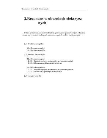 Rezonans w obwodach elektrycznych 2.Rezonans w obwodach elektrycznych Celem ćwiczenia jest doświadczalne sprawdzenie podstawowych właściwości szeregowych i równoległych rezonansowych obwodów elektrycznych. 2.1. Wiadomości ogólne 2.1.1 Rezonans napięć 2.1.2 Rezonans prądów 2.2. Badania laboratoryjne 2.2.1 Rezonans napięć 2.2.1.1 Badanie wpływu pojemności na rezonans napięć. 2.2.1.2 Charakterystyki częstotliwościowe 2.2.2 Rezonans prądów 2.2.2.1 Badanie wpływu pojemności na rezonans prądów 2.2.2.2 Charakterystyki częstotliwościowe 2.3. Uwagi i wnioski Rezonans w obwodach elektrycznych 2.1. Wiadomości ogólne Zjawisko rezonansu występuje w różnych układach fizycznych i pojawia się wtedy, gdy układ jest poddany pobudzeniom okresowym fźr o częstotliwości równej częstotliwości drgań własnych układu fw, czyli fw=fźr. Rys. 2.1. Mechanizm pobudzenia rezonansowego W rezonansie elektrycznym częstotliwość źródła równa jest częstotliwości własnej obwodu, która zależy jedynie od wartości indukcyjności L i pojemności C. Warunkiem koniecznym (ale nie dostatecznym) wystąpienia rezonansu elektrycznego jest to, aby obwód zawierał zarówno kondensatory, jak i cewki. Rozpatrzmy obwód elektryczny przedstawiony na rys.2.2. Rys. 2.2. Odbiornik w obwodzie elektrycznym Symbole u, i oznaczają wartości chwilowe sinusoidalnie zmiennego napięcia na odbiorniku oraz sinusoidalnie zmiennego prądu w odbiorniku. Odbiornik to szeregowe lub równoległe połączenie elementów R, L, C. Stosując prawo Ohma dla wartości skutecznych prądu i napięcia można napisać: dla połączenia szeregowego U = Z = R 2 + X 2 , X = X L − X C (2.1) I dla połączenia równoległego I = Y = G 2 + B2 , B = B C − B L U (2.2) Rezonans w obwodach elektrycznych gdzie: Z- moduł impedancji, Y- moduł admitancji, R - rezystancja, X - reaktancja, G - konduktancja, B - susceptancja. Rezonans można zdefiniować również jako stan obwodu, w którym reaktancja odbiornika lub susceptancja odbiornika są równe zeru. Jeżeli w odbiorniku istnieje szeregowe połączenie elementów R, C, L i jest prawdziwy warunek X=0, to występuje rezonans szeregowy nazywany również rezonansem napięć. Jeżeli w odbiorniku istnieje równoległe połączenie elementów R, C, L i występuje warunek B=0 to odbiornik jest w stanie rezonansu równoległego nazywanego również rezonansem prądów. Rys. 2.3. Trójkąty impedancji: a) ωL > 1 1 ; b) ωL < ωC ωC Z analizy trójkątów rezystancji przedstawionych na rys.2.3 wynika, że dla 1 prawdziwe są zależności: ϕ=0, Z=R, czyli przypadku rezonansu, tzn. ωL = ωC w obwodzie z rezonansem nie ma przesunięcia fazowego między prądem i napięciem. Obwód zachowuje się tak, jakby istniała w nim tylko rezystancja. W stanie rezonansu moc czynna wynosi: P = U ⋅ I ⋅ cos φ = U ⋅ I (2.3) Q = U ⋅ I ⋅ sin φ = 0 (2.4) a moc bierna: gdyż ϕ=0. Oznacza to, że cała energia elektryczna pobrana przez obwód przekształca się w ciepło w jego rezystancji R. Energia bierna przekazywana jest między elementami L i C z pominięciem źródła. Rezonans w obwodach elektrycznych Inna definicja rezonansu elektrycznego podaje, że jest to stan obwodu, w którym występuje całkowita wewnętrzna wymiana energii biernych. 2.1.1. Rezonans napięć Rozpatrzmy obwód składający się z elementów R, L i C połączonych szeregowo - rys. 2.4. Rys. 2.4. Obwód szeregowy R, L, C Moduł impedancji Z w tym obwodzie: Z = R 2 + (X L − X C ) 2 gdzie X L = ωL , X C = (2.1) 1 ωC oraz tgφ = X L − XC R (2.2) Ponieważ przy rezonansie kąt przesunięcia fazowego między prądem i napięciem ϕ=0, to: tgϕ=0, a stąd XL = XC czyli ωL = 1 ωC (2.5) gdzie ω=2πf. Równanie (2.5) pozwala określić warunki, jakie powinny być spełnione, aby w obwodzie z rys.2.4. wystąpił rezonans. W przypadku, gdy obwód zasilany jest ze źródła o stałej częstotliwości f, stan rezonansu można otrzymać regulując wartość indukcyjności L lub pojem- Rezonans w obwodach elektrycznych ności C (w praktyce dostraja się obwód do rezonansu stosując kondensator o regulowanej pojemności). Aby uzyskać rezonans w obwodzie o ustalonych wartościach L i C, należy zastosować źródło napięcia o regulowanej częstotliwości. Częstotliwość, przy której wystąpi rezonans nazywamy częstotliwością rezonansową fr. Wartość częstotliwości fr otrzymamy z równania (2.5) 1 ωr = LC (2.6) lub 1 fr = 2π LC (2.7) Wykres wskazowy obwodu szeregowego w stanie rezonansu przedstawia rys.2.5. Rys. 2.5..Wykres wskazowy szeregowego obwodu szeregowego RLC w stanie rezonansu napięć Należy zauważyć, że w stanie rezonansu szeregowego, czyli rezonansu napięć, występuje równoważenie się napięć na cewce i kondensatorze U L = U C = 0 . Przy pewnych wartościach rezystancji R, indukcyjności L i pojemności C - napięcia UL i UC mogą przybierać stosunkowo duże wartości, mimo że napięcie zasilające obwód U jest stosunkowo małe. Mówimy wówczas, że w obwodzie występują przepięcia. Dla zilustrowania właściwości obwodu rezonansowego wykreśla się charakterystyki częstotliwościowe. Są to charakterystyki przedstawiające zależności prądu I, napięć UL oraz UC od częstotliwości napięcia źródła zasilającego obwód. Charakterystyki częstotliwościowe obwodu rezonansowego otrzymuje się na podstawie poniższych zależności: Rezonans w obwodach elektrycznych I= U R 2 + ( X L − XC ) 2 (2.8) UL = I ⋅ XL (2.9) UC = I ⋅ XC (2.10) Na rysunku 2.6 przedstawiono charakterystyki częstotliwościowe badanych wielkości. rezonans Rys. 2.6. Charakterystyki częstotliwościowe W miarę zwiększania częstotliwości reaktancja indukcyjna XL wzrasta liniowo, zaś reaktancja pojemnościowa XC maleje hiperbolicznie. Przy małych częstotliwościach w obwodzie płynie prąd o małej wartości wyprzedzający napięcie o kąt bliski 90° (obwód ma wtedy charakter 