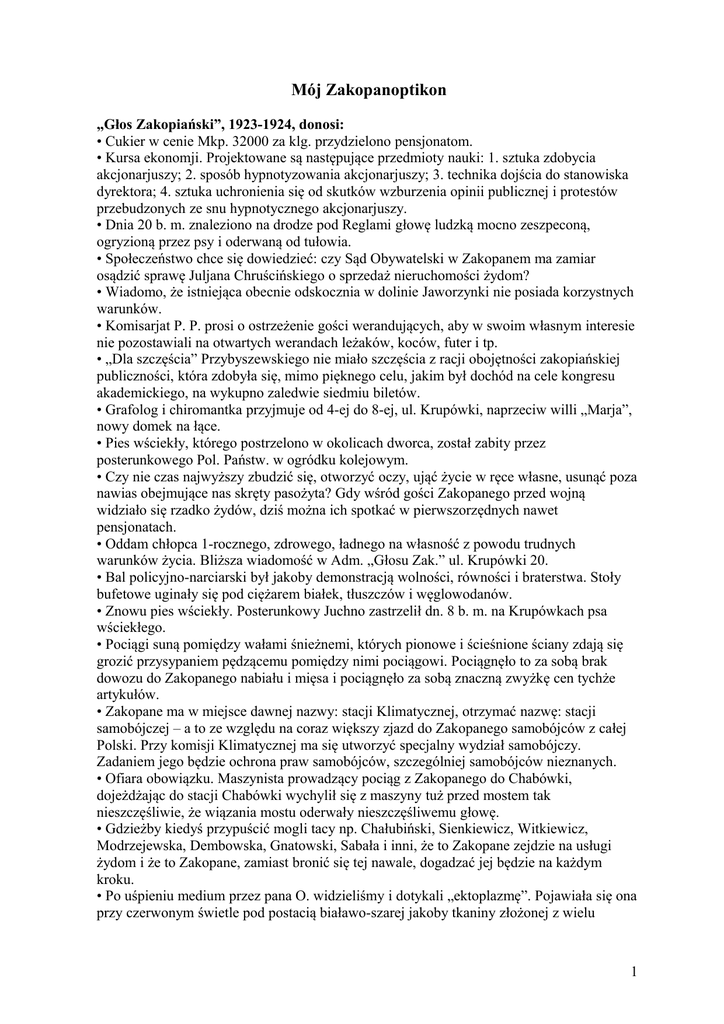 Mój Zakopanoptikon „Głos Zakopiański”, 1923-1924, donosi: • Cukier w cenie Mkp. 32000 za klg. przydzielono pensjonatom. • Kursa ekonomji. Projektowane są następujące przedmioty nauki: 1. sztuka zdobycia akcjonarjuszy; 2. sposób hypnotyzowania akcjonarjuszy; 3. technika dojścia do stanowiska dyrektora; 4. sztuka uchronienia się od skutków wzburzenia opinii publicznej i protestów przebudzonych ze snu hypnotycznego akcjonarjuszy. • Dnia 20 b. m. znaleziono na drodze pod Reglami głowę ludzką mocno zeszpeconą, ogryzioną przez psy i oderwaną od tułowia. • Społeczeństwo chce się dowiedzieć: czy Sąd Obywatelski w Zakopanem ma zamiar osądzić sprawę Juljana Chruścińskiego o sprzedaż nieruchomości żydom? • Wiadomo, że istniejąca obecnie odskocznia w dolinie Jaworzynki nie posiada korzystnych warunków. • Komisarjat P. P. prosi o ostrzeżenie gości werandujących, aby w swoim własnym interesie nie pozostawiali na otwartych werandach leżaków, koców, futer i tp. • „Dla szczęścia” Przybyszewskiego nie miało szczęścia z racji obojętności zakopiańskiej publiczności, która zdobyła się, mimo pięknego celu, jakim był dochód na cele kongresu akademickiego, na wykupno zaledwie siedmiu biletów. • Grafolog i chiromantka przyjmuje od 4-ej do 8-ej, ul. Krupówki, naprzeciw willi „Marja”, nowy domek na łące. • Pies wściekły, którego postrzelono w okolicach dworca, został zabity przez posterunkowego Pol. Państw. w ogródku kolejowym. • Czy nie czas najwyższy zbudzić się, otworzyć oczy, ująć życie w ręce własne, usunąć poza nawias obejmujące nas skręty pasożyta? Gdy wśród gości Zakopanego przed wojną widziało się rzadko żydów, dziś można ich spotkać w pierwszorzędnych nawet pensjonatach. • Oddam chłopca 1-rocznego, zdrowego, ładnego na własność z powodu trudnych warunków życia. Bliższa wiadomość w Adm. „Głosu Zak.” ul. Krupówki 20. • Bal policyjno-narciarski był jakoby demonstracją wolności, równości i braterstwa. Stoły bufetowe uginały się pod ciężarem białek, tłuszczów i węglowodanów. • Znowu pies wściekły. Posterunkowy Juchno zastrzelił dn. 8 b. m. na Krupówkach psa wściekłego. • Pociągi suną pomiędzy wałami śnieżnemi, których pionowe i ścieśnione ściany zdają się grozić przysypaniem pędzącemu pomiędzy nimi pociągowi. Pociągnęło to za sobą brak dowozu do Zakopanego nabiału i mięsa i pociągnęło za sobą znaczną zwyżkę cen tychże artykułów. • Zakopane ma w miejsce dawnej nazwy: stacji Klimatycznej, otrzymać nazwę: stacji samobójczej – a to ze względu na coraz większy zjazd do Zakopanego samobójców z całej Polski. Przy komisji Klimatycznej ma się utworzyć specjalny wydział samobójczy. Zadaniem jego będzie ochrona praw samobójców, szczególniej samobójców nieznanych. • Ofiara obowiązku. Maszynista prowadzący pociąg z Zakopanego do Chabówki, dojeżdżając do stacji Chabówki wychylił się z maszyny tuż przed mostem tak nieszczęśliwie, że wiązania mostu oderwały nieszczęśliwemu głowę. • Gdzieżby kiedyś przypuścić mogli tacy np. Chałubiński, Sienkiewicz, Witkiewicz, Modrzejewska, Dembowska, Gnatowski, Sabała i inni, że to Zakopane zejdzie na usługi żydom i że to Zakopane, zamiast bronić się tej nawale, dogadzać jej będzie na każdym kroku. • Po uśpieniu medium przez pana O. widzieliśmy i dotykali „ektoplazmę”. Pojawiała się ona przy czerwonym świetle pod postacią białawo-szarej jakoby tkaniny złożonej z wielu 1 luźnych warstw pajęczyny. W dotknięciu wydawała się jednym, między nimi i mnie, sucha, innym wilgotna, niektórym ciepława, innym chłodna. • Niebywała ulewa w dniu 31 lipca, trwająca bez przerwy 24 godzin, poczyniła na terenie Zakopanego poważne uszkodzenia. U wylotu ulicy Kościeliskiej przez zabranie brzegu runęła w gruzy murowana budka transformatora elektrycznego, a w sąsiedztwie niej znajdujący się kiosk herbaciarni, grożący zawaleniem się, straż pożarna musiała rozebrać. • Która z Pań pragnie zapoznać samotnego wielkopolanina w Zakopanem? Łaskawą wiadomość proszę pilnie pod A. L. 325 do administracji „”Głosu Zakopiańskiego”. • W piątek 8 b. m. w zapełnionej „dostatecznie” sali „Morskiego Oka” opowiadał nam BoyŻeleński, jak to został literatem, oświetlając swą czcigodną postać ze wszystkich czterech stron. • Pot nóg, pach i rąk usuwa pasta „Fussol” natychmiast! Pod gwarancją nieszkodliwa. Do nabycia w Droguerji Br. Closmanna w Zakopanem. • Pan Prezes Rady Ministrów i minister Skarbu, Dr Władysław Grabski pojechał samochodem do doliny Kościeliskiej, skąd udał się pieszo do Krakowa (tatrzańskiego). P. premjer zamierzał zwiedzić Jaworzynę i Szmeks, co się jednak nie udało z powodu sprzeciwu Straży granicznej czesko-słowackiej, mimo że przepustki graniczne kierownika naszego Rządu były oczywiście „w porządku”. • Zjawiska metapsychiczne. Fluid promieniujący zdolny jest materializować się w rozmaite formy i kształty, co wykazują liczne fotografje fluidyczne. • Przechodząc przez Skibówki (przysiołek Zakopanego) spostrzegłem pewnego razu przed jedną z niezliczonych kwater skautowych tabliczkę tej treści: „Żydom wstęp wzbroniony”. Na moją interpelację i wezwanie, by tabliczkę tę niezwłocznie usunął, gołowąsy „komendant” oświadczył, że nie uczyni tego, ponieważ to zbawiennie i pouczająco wpływa na zawojowaną przez żydów miejscową ludność (drużyna była z Poznańskiego). Dr Marjan Sokołowski. • Francuzi nie tają się z tem, że są narodem wymierającym, nie mają jednak ani ochoty, ani energji do rozmnażania się, nie wahają się w tym celu sprowadzać elementu rozpłodowego z państw sojuszniczych (np. polscy robociarze), a jednak celują w kulcie pierwiastka klitorydyczno-phallicznego, sztuki seksualn