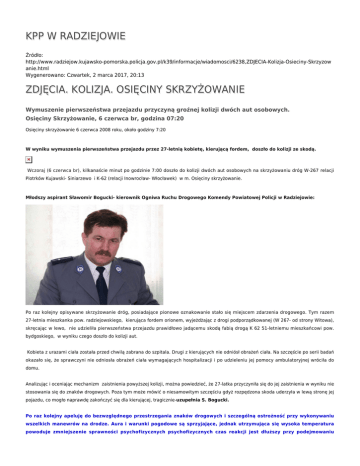 KPP W RADZIEJOWIE Źródło: http://www.radziejow.kujawsko-pomorska.policja.gov.pl/k39/informacje/wiadomosci/6238,ZDJECIA-Kolizja-Osieciny-Skrzyzow anie.html Wygenerowano: Czwartek, 2 marca 2017, 20:13 ZDJĘCIA. KOLIZJA. OSIĘCINY SKRZYŻOWANIE Wymuszenie pierwszeństwa przejazdu przyczyną groźnej kolizji dwóch aut osobowych. Osięciny Skrzyżowanie, 6 czerwca br, godzina 07:20 Osięciny skrzyżowanie 6 czerwca 2008 roku, około godziny 7:20 W wyniku wymuszenia pierwszeństwa przejazdu przez 27-letnią kobietę, kierującą fordem, doszło do kolizji ze skodą. Wczoraj (6 czerwca br), kilkanaście minut po godzinie 7:00 doszło do kolizji dwóch aut osobowych na skrzyżowaniu dróg W-267 relacji Piotrków Kujawski- Siniarzewo i K-62 (relacji Inowrocław- Włocławek) w m. Osięciny skrzyżowanie. Młodszy aspirant Sławomir Bogucki- kierownik Ogniwa Ruchu Drogowego Komendy Powiatowej Policji w Radziejowie: Po raz kolejny opisywane skrzyżowanie dróg, posiadające pionowe oznakowanie stało się miejscem zdarzenia drogowego. Tym razem 27-letnia mieszkanka pow. radziejowskiego, kierująca fordem orionem, wyjeżdżając z drogi podporządkowanej (W 267- od strony Witowa), skręcając w lewo, nie udzieliła pierwszeństwa przejazdu prawidłowo jadącemu skodą fabią drogą K 62 51-letniemu mieszkańcowi pow. bydgoskiego, w wyniku czego doszło do kolizji aut. Kobieta z urazami ciała została przed chwilą zabrana do szpitala. Drugi z kierujących nie odniósł obrażeń ciała. Na szczęście po serii badań okazało się, że sprawczyni nie odniosła obrażeń ciała wymagających hospitalizacji i po udzieleniu jej pomocy ambulatoryjnej wróciła do domu. Analizując i oceniając mechanizm zaistnienia powyższej kolizji, można powiedzieć, że 27-latka przyczyniła się do jej zaistnienia w wyniku nie stosowania się do znaków drogowych. Poza tym może mówić o niesamowitym szczęściu gdyż rozpędzona skoda uderzyła w lewą stronę jej pojazdu, co mogło naprawdę zakończyć się dla kierującej, tragicznie-uzupełnia S. Bogucki. Po raz kolejny apeluję do bezwzględnego przestrzegania znaków drogowych i szczególną ostrożność przy wykonywaniu wszelkich manewrów na drodze. Aura i warunki pogodowe są sprzyjające, jednak utrzymująca się wysoka temperatura powoduje zmniejszenie sprawności psychofizycznych psychofizycznych czas reakcji jest dłuższy przy podejmowaniu poszczególnych manewrów- kończy Kierownik ORD. Kobieta od radziejowskiej drogówki poza punktami karnymi otrzymała 500 złotowy mandat karny za spowodowanie wczorajszego zdarzenia drogowego. Autor: red2.kpra Publikacja: red2.kpra Ocena: 0/5 (0) Tweetnij