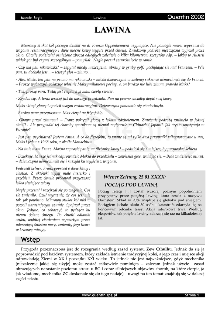 Marcin Segit Lawina Quentin 2002 LAWINA Miarowy stukot kół pociągu działał na dr Franza Oppenheimera usypiająco. Nie pomogła nawet wyprawa do wagonu restauracyjnego i dwie mocne kawy wypite przed chwilą. Znudzony podróżą mężczyzna wyjrzał przez okno. Chwilę podziwiał ośnieżone zbocza odległych zaledwie o kilka kilometrów szczytów Alp. – Jakby w Austrii widok gór był czymś szczególnym – pomyślał. Nagle poczuł szturchnięcie w ramię. - Czy ma pan rękawiczki? – zapytał młody mężczyzna, ubrany w gruby golf, pochylając się nad Franzem. – Wie pan, tu dookoła jest... – ściszył głos – zimno... - Ależ Maks, ten pan na pewno ma rękawiczki – młoda dziewczyna w zielonej sukience uśmiechnęła się do Franza. – Proszę wybaczyć, pokazuję właśnie Maksymilianowi pociąg. A on bardzo nie lubi zimna, prawda Maks? - Tak, proszę pani. Tutaj jest ciepło, a ja mam ciepły sweter. - Zgadza się. A teraz wracaj już do naszego przedziału. Pan na pewno chciałby dopić swą kawę. Maks skinął głową i opuścił wagon restauracyjny. Dziewczyna ponownie się uśmiechnęła. - Bardzo pana przepraszam. Max cierpi na frigofobię. - Obawa przed zimnem? – Franz pokręcił głową z lekkim zdziwieniem. Znużenie podróżą zniknęło w jednej chwili.- Ale przypadki tej choroby spotykane są niemal wyłącznie w Chinach i Japonii. Jak często występują w Europie? - Jest pan psychiatrą? Jestem Anna. A co do figrofobii, to znane są mi tylko dwa przypadki zdiagnozowane u nas, Maks i jeden z 1968 roku, z okolic Monachium. - Na imię mam Frnaz. Można zaprosić panią na filiżankę kawy? – podniósł się z miejsca, by przywołać kelnera. - Dziękuję. Musze jednak odprowadzić Maksa do przedziału – zawiesiła głos, wahając się. – Będę za dziesięć minut. – dziewczyna uśmiechnęła się i ruszyła ku wyjściu z wagonu. Podszedł kelner. Franz poprosił o dwie kawy i ciastka. Z aktówki wyjął małe lusterko i grzebień. Przez chwilę próbował przyczesać lekko siwiejące włosy. Nagle przestał i rozejrzał się po wagonie. Coś się zmieniło. Czuł wyraźnie, że coś jest nie tak, jak powinno. Miarowy stukot kół nikł w powoli narastającym szumie. Spojrzał przez okno. Jedyne, co zobaczył, to pędzącą ku niemu ścianę śniegu. Po chwili odłamki szyby, wybitej ciśnieniem wywartym przez uderzającą śnieżna masę, zmieniły jego twarz w krwawą miazgę. Wiener Zeitung, 25.01.XXXX: POCIĄG POD LAWINĄ Pociąg relacji [...] został wczoraj późnym popołudniem przysypany przez potężną lawinę, która zeszła z masywu Dachstein. Skład w 90% znajduje się głęboko pod śniegiem. Pociągiem jechało około 50 osób – katastrofa zdarzyła się na końcowym odcinku trasy. Akcja ratunkowa trwa. Według ekspertów, tak potężne lawiny zdarzają się raz na kilkadziesiąt lat. Wstęp Przygoda przeznaczona jest do rozegrania według zasad systemu Zew Cthulhu. Jednak da się ją poprowadzić pod każdym systemem, który zakłada istnienie tradycyjnej kolei, a jego czas i miejsce akcji odpowiadają Ziemi w XX i początku XXI wieku. To jednak nie jest najważniejsze, gdyż mechanika (niezależnie jakiej się użyje) może zostać całkowicie pominięta – zalecam jednak użycie zasad obrazujących narastanie poziomu stresu u BG i coraz silniejszych objawów chorób, na które cierpią (a jak wiadomo, mechanika ZC doskonale się do tego nadaje) – uwagi na ten temat znajdują się w dalszej części tekstu. www.quentin.rpg.pl Strona 1 Marcin Segit Quentin 2002 Lawina Scenariusz przeznaczony jest dla 3-4 osób. Gracze wcielają się w postaci cierpiące na zaburzenia psychiczne, które nagle znalazły się w silnie stresującej sytuacji. Pociąg, którym jadą wraz z trójką opiekunów, zostaje zasypany przez lawinę. Pielęgniarze i młoda pani doktor giną, zaś BG zostają zmuszeni stawić czoła katastrofie, własnym lękom i zaburzeniom oraz możliwe, że także zwrócą się przeciwko sobie. Kilka uwag na temat adaptacji scenariusza do innych lat lub realiów podano na końcu. Pociąg Skład, którym jechali BG, znalazł się w wyniku zejścia potężnej lawiny kilka metrów pod śniegiem. Na powierzchni pozostał jedynie zasypany w 1/3 elektrowóz. Natomiast jedenaście wagonów leży przysypanych grubą warstwą śniegu. Decyzja o rozpoczęciu poszukiwań zostanie podjęta w dwie godziny po zejściu lawiny, gdy zaczyna już zapadać zmrok. Pociąg zostanie zlokalizowany godzinę później. Pierwsi ratownicy dotrą do niego w kolejną godzinę, jednak na ciężki sprzęt czekać trzeba będzie jeszcze 2 godziny – do tego czasu zostanie odkopany elektrowóz. Najgłębiej znajduje się ostatni, jedenasty wagon. Leży nad nim 8 metrów śniegu. Wraz z przesuwaniem się w stronę elektrowozu pokrywa śnieżna stopniowo maleje. Od najwyżej położonego końca pierwszego wagonu do powierzchni jest około pół metra śniegu. Poniższa tabela zawiera dane na temat grubości pokrywy śnieżnej nad wagonami, położenia wagonów oraz najważniejsze uwagi co do ich zawartości, licząc od końca pociągu. Grubość śniegu Odchylenie względem pionu 11 8m 0o 10 8–7m 45o w lewo 2 ciała. 9 7–6m 90o w lewo 3 ciała. 8 6–5m 45o w lewo Wyrwany kawałek ściany, wszędzie pełno śniegu. Ciało konduktora. 7 5m 45o w lewo Rozerwany przegub między wagonami. 5m 180 (leży na dachu) Ciemny wagon. Wiszące ciało zaczepione o stolik. 7 ciał na suficie, który teraz jest podłogą. Aktówka dr Franza Oppenheimera z lekami. Jedzenie i napoje (w tym alkohole). Ostre narzędzia kuchenne. 6 ciał, w tym dr Oppenheimer, kelner i barman. Wagon 6 o Uwagi Tu w przedostatnim zaczynają BG. Ich bagaże i ciała opiekunów. 5 ciał. 5 5–6m 0o 4 6–5m 45o w prawo 9 ciał. Dwie osoby ciężko ranne. 3 5–4m 90o w prawo Rozerwany przegub między wagonami. 4 ciała. Jedna żywa osoba z połamanymi nogami. 2 4–3m 0o 1 3 – 0,5 m 45o
