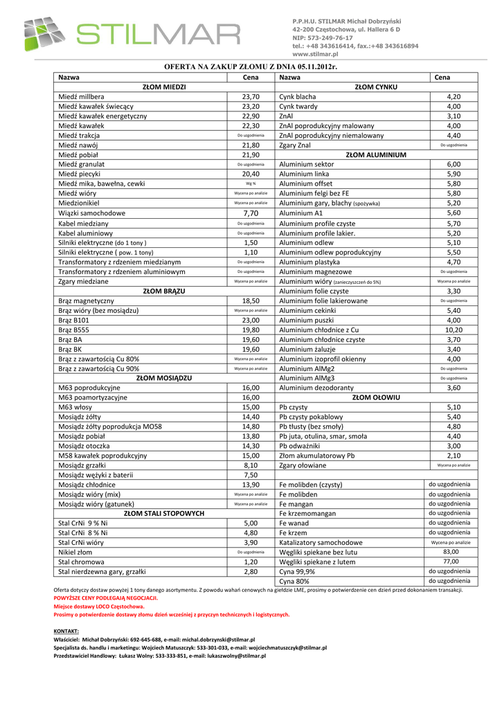 OFERTA NA ZAKUP ZŁOMU Z DNIA 05.11.2012r. Nazwa Cena