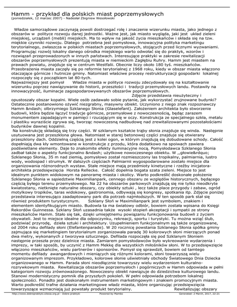 Hamm - przykład dla polskich miast poprzemysłowych (poniedziałek, 12 marzec 2007) - Nadesłał Zbigniew Wesołowski Władze samorządowe zaczynają powoli dostrzegać rolę i znaczenie wizerunku miasta, jako jednego z obszarów w polityce rozwoju danej jednostki. Ważne jest, jak miasto wygląda, jaki jest układ zieleni miejskiej, urządzeń (mebli) miejskich. Ma to wpływ na jakość życia mieszkańców i składa się na tzw. miękkie czynniki rozwoju. Dlatego potrzebna jest pomysłowa, innowacyjna polityka marketingu terytorialnego, zwłaszcza w polskich miastach poprzemysłowych, stojących przed licznymi wyzwaniami. Programując rozwój lokalny danego ośrodka miejskiego warto odwołać się do praktyk, wzorów i rozwiązań przeprowadzonych w innych państwach. Interesujące praktyki w zakresie rewitalizacji obszarów poprzemysłowych prezentują miasta w niemieckim Zagłębiu Ruhry. Hamm jest miastem na prawach powiatu, znajduje się w centrum Westfalii. Obecnie liczy około 180 tyś. mieszkańców. Przeobrażenia miasta zaczęły się po reformie terytorialnej z 1968 roku, kiedy w obszar miasta włączono otaczające górnicze i hutnicze gminy. Natomiast właściwe procesy restrukturyzacji gospodarki lokalnej rozpoczęły się z początkiem lat 80-tych. Najważniejszy jest pomysł Władze miasta w polityce rozwoju zdecydowały się na kształtowanie wizerunku poprzez nawiązywanie do historii, przeszłości i tradycji przemysłowych landu. Postawiły na innowacyjność, iluminacje zagospodarowywanych obszarów poprzemysłowych. Zdjęcie przedstawia nieużyteczny i opustoszały obszar kopalni. Wiele osób zadawało sobie pytanie, jak wykorzystać zrujnowane budynki? Ostatecznie postanowiono ożywić niezgrabny, masywny obiekt. Uczyniono z niego znak rozpoznawczy Hamm – olbrzymiego Szklanego Słonia (Glaselefant). Założeniem architekta było stworzenie budowli, która będzie łączyć tradycje górnicze, przemysłowe z nowoczesnością, będąc zarazem monumentem zapadającym w pamięci i rzucającym się w oczy. Konstrukcja ze specjalnego szkła, metalu i plastiku wyraziście zgrywa się, tworząc nowoczesną nadbudowę nad zrewitalizowanymi pozostałościami budynków dawnej kopalnii. Na konstrukcję składają się trzy części. W szklanym kształcie trąby słonia znajduje się winda. Następnie usytuowana jest przeszklona głowa. Natomiast w starej betonowej części znajduje się otwierany przeszklony dach. Oddzielną częścią jest z kolei ogon, w którym znajdują się dobudowane schody. Całość dopełniają dwa kły wmontowane w konstrukcje z przodu, która dodatkowo na spoiwach zawiera podświetlane elementy. Daje to znakomite efekty iluminacyjne nocą. Pomysłodawca Szklanego Słonia zadbał także o aspekty funkcjonalno – użytkowe nowoczesnego obiektu. W ,,głowie” Szklanego Słonia, 35 m nad ziemią, pomysłowo został rozmieszczony las tropikalny, palmiarnia, lustro wody, wodospad i strumyk. W dalszych częściach Palmiarnii wygospodarowane zostało miejsce dla organizowania różnorodnych wystaw. Stałe miejsce mają przedmioty kinetyczne i rzeźby inicjatoraarchitekta przedsięwzięcia Horsta Rellecke. Całość dopełnia bogata szata zieleni. Miejsce to jest idealnym punktem widokowym na panoramę miasta i okolicy. Warto podkreślić doskonałe położenie Szklanego Słonia w sąsiedztwie Maximilianpark, cennego obszaru ze względów historycznych, będącego częścią byłego terenu przemysłowego. Na 22 ha obszarów parkowych znajdują się nie tylko nieodkryte kwiatostany, nietknięte naturalne obszary, czy obiekty sztuki , lecz także place przygody i zabaw, ogród motylkowy tropików, taras widokowy, gastronomia, odbywają się kongresy, spotkania itp. Zdjęcie poniżej przedstawia interesująco zaadaptowany park dla potrzeb najmłodszych. W ten sposób park stał się również produktem turystycznym. Szklany Słoń w Maximilianpark jest symbolem, znakiem i elementem identyfikującym miasto. Budowla ta ma światowy odbiór, bowiem została wpisana do Księgi Rekordów Guinnessa. Szklany Słoń uzasadnia także wysoki stopień akceptacji i sympatii ze strony mieszkańców Hamm. Stało się tak, dzięki umiejętnemu powiązaniu funkcjonowania budowli z życiem obywateli. Jest to miejsce idealne dla odpoczynku, rekreacji, sportu i turystyki. Tu można wziąć ślub, podziwiać przyrodę, dzieła sztuki i architektury. Uzupełnieniem funkcjonalnym są także organizowane, od 2004 roku defilady słoni (Elefantenparade). W 20 rocznicę powstania Szklanego Słonia spółka gminy zajmująca się marketingiem terytorialnym zorganizowała paradę 30 kolorowych słoni mierzących ponad dwa metry, wykonanych z tworzywa sztucznego. Defilada rozpoczęła się pod Szklanym Słoniem następnie przeszła przez dzielnice miasta. Zamiarem pomysłodawców było wykreowanie wydarzenia i imprezy, w taki sposób, by uczynić z Hamm Mekkę dla wszystkich miłośników słoni. W to przedsięwzięcie włączono mieszkańców, wielu partnerów i sponsorów. Pomysł się sprawdził, bowiem od tamtego momentu defilady awangardowych i mieniących się różnymi kolorami, słoni towarzyszą wielu organizowanym imprezom. Przykładowo, kolorowe słonie uświetniały obchody Światowego Dnia Dziecka organizowanego w Hamm. Parada słoni nieodłącznie towarzyszy wielu wydarzeniom kulturalnorozrywkowym miasta. Rewitalizacja obszarów poprzemysłoch i pogórniczych w Hamm odpowiada w pełni kategoriom rozwoju zrównoważonego. Nowoczesny obiekt nawiązuje do dziedzictwa kulturowego landu. Stanowi modernistyczny pomnik dla przyszłych pokoleń. W pełni odpowiada potrzebom lokalnej społeczności. Ponadto jest doskonałym instrumentem marketingowym i znakiem promocyjnym miasta. Warto podkreślić trafne działania marketingowe władz miasta, które organizując przedsięwzięcia towarzyszące wzmacniają już powstały produkt terytorialny. Rewitalizując obszary http://www.dob