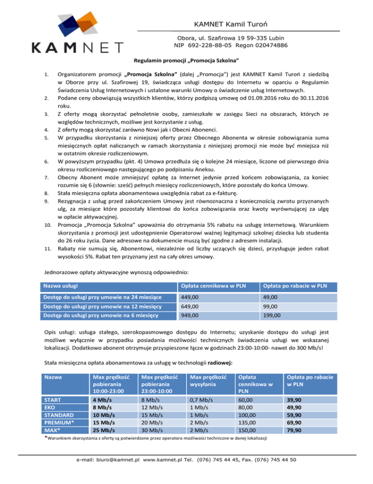 KAMNET Kamil Turoń Obora, ul. Szafirowa 19 59-335 Lubin NIP 692-228-88-05 Regon 020474886 Regulamin promocji „Promocja Szkolna” Organizatorem promocji „Promocja Szkolna” (dalej „Promocja”) jest KAMNET Kamil Turoń z siedzibą w Oborze przy ul. Szafirowej 19, świadcząca usługi dostępu do Internetu w oparciu o Regulamin Świadczenia Usług Internetowych i ustalone warunki Umowy o świadczenie usług Internetowych. 2. Podane ceny obowiązują wszystkich klientów, którzy podpiszą umowę od 01.09.2016 roku do 30.11.2016 roku. 3. Z oferty mogą skorzystać pełnoletnie osoby, zamieszkałe w zasięgu Sieci na obszarach, których ze względów technicznych, możliwe jest korzystanie z usług. 4. Z oferty mogą skorzystać zarówno Nowi jak i Obecni Abonenci. 5. W przypadku skorzystania z niniejszej oferty przez Obecnego Abonenta w okresie zobowiązania suma miesięcznych opłat naliczanych w ramach skorzystania z niniejszej promocji nie może być mniejsza niż w ostatnim okresie rozliczeniowym. 6. W powyższym przypadku (pkt. 4) Umowa przedłuża się o kolejne 24 miesiące, liczone od pierwszego dnia okresu rozliczeniowego następującego po podpisaniu Aneksu. 7. Obecny Abonent może zmniejszyć opłatę za Internet jedynie przed końcem zobowiązania, za koniec rozumie się 6 (słownie: sześć) pełnych miesięcy rozliczeniowych, które pozostały do końca Umowy. 8. Stała miesięczna opłata abonamentowa uwzględnia rabat za e-fakturę. 9. Rezygnacja z usług przed zakończeniem Umowy jest równoznaczna z koniecznością zwrotu przyznanych ulg, za miesiące które pozostały klientowi do końca zobowiązania oraz kwoty wyrównującej za ulgę w opłacie aktywacyjnej. 10. Promocja „Promocja Szkolna” upoważnia do otrzymania 5% rabatu na usługę internetową. Warunkiem skorzystania z promocji jest udostępnienie Operatorowi ważnej legitymacji szkolnej dziecka lub studenta do 26 roku życia. Dane adresowe na dokumencie muszą być zgodne z adresem instalacji. 11. Rabaty nie sumują się, Abonentowi, niezależnie od liczby uczących się dzieci, przysługuje jeden rabat wysokości 5%. Rabat ten przyznany jest na cały okres umowy. 1. Jednorazowe opłaty aktywacyjne wynoszą odpowiednio: Nazwa usługi Opłata cennikowa w PLN Opłata po rabacie w PLN Dostęp do usługi przy umowie na 24 miesiące 449,00 49,00 Dostęp do usługi przy umowie na 12 miesięcy Dostęp do usługi przy umowie na 6 miesięcy 649,00 949,00 99,00 199,00 Opis usługi: usługa stałego, szerokopasmowego dostępu do Internetu; uzyskanie dostępu do usługi jest możliwe wyłącznie w przypadku posiadania możliwości technicznych świadczenia usługi we wskazanej lokalizacji. Dodatkowo abonent otrzymuje przyspieszone łącze w godzinach 23:00-10:00- nawet do 300 Mb/s! Stała miesięczna opłata abonamentowa za usługę w technologii radiowej: Nazwa Max prędkość pobierania 10:00-23:00 Max prędkość pobierania 23:00-10:00 Max prędkość wysyłania Opłata cennikowa w PLN START 4 Mb/s 8 Mb/s 0,7 Mb/s 60,00 EKO 8 Mb/s 12 Mb/s 1 Mb/s 80,00 STANDARD 10 Mb/s 15 Mb/s 1 Mb/s 100,00 PREMIUM* 15 Mb/s 20 Mb/s 2 Mb/s 135,00 MAX* 25 Mb/s 30 Mb/s 2 Mb/s 150,00 *Warunkiem skorzystania z oferty są potwierdzone przez operatora możliwości techniczne w danej lokalizacji Opłata po rabacie w PLN 39,90 49,90 59,90 69,90 79,90 e-mail: [email protected] www.kamnet.pl Tel. (076) 745 44 45, Fax. (076) 745 44 50 Stała miesięczna opłata abonamentowa za usługę w technologii światłowodowej: Nazwa Max prędkość pobierania 10:0023:00 Max prędkość pobierania 23:0010:00 Max prędkość wysyłania Opłata cennikowa w PLN Opłata po rabacie w PLN START 10 Mb/s 20 Mb/s 3 Mb/s 65,00 39,90 EKO 30 Mb/s 60 Mb/s 5 Mb/s 135,00 44,90 STANDARD* 50 Mb/s 100 Mb/s 10 Mb/s 150,00 54,90 PREMIUM* 100 Mb/s 200 Mb/s 15 Mb/s 170,00 64,90 MAX* 150 Mb/s 300 Mb/s 30 Mb/s 190,00 74,90 *Usługa Wi-Fi w cenie pakietu Stała miesięczna opłata abonamentowa za usługę w technologii światłowodowej w zabudowie jednorodzinnej: Nazwa Max prędkość pobierania 10:0023:00 Max prędkość pobierania 23:0010:00 Max prędkość wysyłania Opłata cennikowa w PLN Opłata po rabacie w PLN START 10 Mb/s 20 Mb/s 3 Mb/s 65,00 44,90 EKO 30 Mb/s 60 Mb/s 5 Mb/s 135,00 49,90 STANDARD* 50 Mb/s 100 Mb/s 10 Mb/s 150,00 59,90 PREMIUM* 100 Mb/s 200 Mb/s 15 Mb/s 170,00 69,90 MAX* 150 Mb/s 300 Mb/s 30 Mb/s 190,00 79,90 * Usługa Wi-Fi w cenie pakietu Pozostałe opłaty: Lp. Nazwa usługi Opłata w PLN 1. 2. 3. 4. 5. 6. 7. 8. Opłata miesięczna za fakturę papierową Książeczka abonamentowa (jednorazowo) Opłata miesięczna za stały adres IP Zawieszenie usług na życzenie klienta Instalacja sterowników dla poprawnej pracy usługi Zmiana usługi na wyższą Pierwsza rozpoczęta godzina pracy serwisanta Druga i każda następna godzina pracy serwisanta (rozliczana minutowo) Przeniesienie gniazda w obrębie mieszkania/domu Opłata miesięczna za pomoc informatyka Pisemne wezwanie do zapłaty Miesięczna dzierżawa routera WIFI Opłata za przeniesienie łącza Opata za budowę przyłącza Konfiguracja sprzętu Abonenta Opłata za sprzęt zwrócony po terminie Podwójne wysyłanie Dodatkowe pobieranie + 2 Mb/s Opłata za niezwrócony, uszkodzony sprzęt Zmiana numeru na żądanie Abonenta 4,00 5,00 10,00 50% wysokości miesięcznego abonamentu 30,00 Bezpłatnie 60,00/h 1,00/min 9. 10. 11. 12. 13. 14. 15. 16. 17. 18. 19. 20. Wszystkie ceny zawierają podatek VAT 23% 99,00 5,00 23,00 6,00 149,00 Indywidualnie 50,00 60,00 10,00 8,00 600,00 29,90