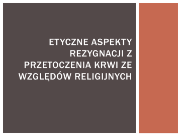 ETYCZNE ASPEKTY REZYGNACJI Z PRZETOCZENIA KRWI ZE WZGLĘDÓW RELIGIJNYCH stanowisko "religijne", będące uzasadnieniem niewyrażenia zgody przez pacjenta na przetoczenie krwi Świadkowie Jehowy: • nie godzą się na przetaczanie krwi pełnej i jej elementów morfotycznych nawet w sytuacji zagrożenia życia • akceptują stosowanie wszystkich składników osocza • zakaz - w 1945 roku Towarzystwo "Strażnica" (The Watchtower Society – TWS) • poglądy niejednorodne i ulegają ewolucji niebezpieczna praktyka odmowy terapii z różnych powodów religijnych • prawie wszystkie sekty religijne • inne grupy wyznaniowe • sekta "kościoła" scjentologicznego – idee zaczerpnięte z religii azjatyckich, magii, medycyny i psychologii • propaguje techniki psychoterapeutyczne • odrzuca podstawy naukowe nowoczesnej psychiatrii • obowiązuje w niej bezwzględny nakaz dochowania tajemnicy • lekarz nie ma zatem szans na poznanie prawdy o chorym rezygnacja z terapii wpisana w historię religii i medycyny narasta szybko od początku XX wieku niepojęte przyzwolenie na krzywdzenie dziecka poprzez zakaz jego leczenia umotywowany religijnie •raport dotyczący śmierci 172 dzieci w USA w 1975–1995 •komitet bioetyczny Amerykańskiej Akademii Pediatrii w 1988 - zobowiązał lekarzy do przeciwdziałania tego rodzaju nadużyciom •apel o zmiany w prawie karnym, bezsilnym dotychczas wobec tego rodzaju przemocy oficjalne dane a rzeczywiste nadużycia wobec chorych dzieci lekarz - przed problemem rozeznania • czy pacjent chce z nim współpracować i czy godzi się na zaproponowaną terapię • czy przyjść choremu z pomocą wbrew jego woli problematykę udzielania przez dawcę zgody i jej formy dyskutuje się do dzisiaj w odniesieniu do transplantacji narządów w przypadku transfuzji krwi - akcentowany jest sprzeciw biorcy • konsekwentna odmowa - może się przyczynić do poważnego pogorszenia stanu zdrowia, a nawet do śmierci konflikt ten w szerszej perspektywie • obowiązku ratowania życia, • godności • autonomii chorego • jego wolności • podmiotowego traktowania go przez lekarza •  aspekt religijny (istotny dla osoby wierzącej) -rozważany tak jak każde inne uzasadnienie odmowy leczenia niosącej niebezpieczeństwo śmierci dokonać rozeznania, czy pacjent •jest w pełni świadomy decyzji •czy podejmuje ją w sposób wolny w rozważaniach medycznych nie ma znaczenia, czy argumentacja religijna uzasadniająca ten sprzeciw jest prawdziwa istotny - silny lęk chorego przed terapią z zastosowaniem krwi lub jej preparatów, powodujący jego determinację •dowodzenie Świadków Jehowy nie znajduje żadnego uzasadnienia w Piśmie Świętym w 1935 r. TWS zakazało profilaktycznego szczepienia dzieci po 20 latach zakaz ten cofnięto jako nieuzasadniony biblijnie w pewnych okolicznościach niewyrażenie zgody na leczenie jest równoznaczne z akceptacją samobójstwa • lekarz ma pełnić rolę biernego obserwatora i urzędowego świadka •  rozterka między wezwaniem do ochrony życia a silną presją moralną ze strony chorego, aby zgodził się na jego śmierć lekarz uroczyście zobowiązał się "służyć życiu i zdrowiu ludzkiemu, według najlepszej wiedzy przeciwdziałać cierpieniu i zapobiegać chorobom, a chorym nieść pomoc bez żadnych różnic, takich jak: rasa, religia, narodowość, poglądy polityczne, stan majątkowy i inne, mając na celu wyłącznie ich dobro i okazując należny im szacunek„ akt ten od strony moralnej obowiązuje nieodwołalnie, nieco inne prawne uregulowania tej kwestii szczególna odpowiedzialność  imperatyw moralny: salus aegroti suprema lex esto niebezpieczne jest dopuszczenie albo niedopuszczenie chorego do zabiegów terapeutycznych, a zwłaszcza ratujących jego życie ze wskazań pozamedycznych świadek Jehowy winien mieć świadomość, że wymuszenie odstąpienia od przetoczenia krwi może być pogwałceniem sumienia lekarskiego postawa chorego i jego najbliższych jest bowiem w wyraźnej opozycji do misji zawodowej lekarza  zachowania będące odstępstwem od złożonego przez niego przyrzeczenia w relacjach pomiędzy lekarzem i pacjentem powinna być zachowana równowaga wzajemnych praw i obowiązków • lekarz nie ma większych uprawnień dotyczących zdrowia i życia niż sam chory. • pacjent nie może wymagać od lekarza traktowania sprzecznego z jego godnością, niezbywalnymi prawami i zasadami sztuki lekarskiej • lekarz powinien czynić przede wszystkim to, co wynika z ogólnych zasad moralnych i zawodowego kodeksu etycznego • nie ciąży na nim obowiązek czynienia czegoś więcej, gdyż zadośćuczynił sprawiedliwości • przekroczenie granicy obowiązku wypełnia miarę miłości i jest realizacją chrześcijańskiej solidarności z chorym • lekarz powinien roztropnie rozeznać prawdziwe dobro chorego i zastosować środki proporcjonalne do niego z poszanowaniem obowiązujących go kanonów leczenia • niebezpieczne zatem jest lekkomyślne spełnianie żądań chorego ze względu na poszanowanie jego autonomii • zawsze obowiązuje bowiem lekarza wierność sumieniu cnota miłości zobowiązuje lekarza do "służby zdrowiu i życiu" oraz do poszanowania jego godności  szacunek dla decyzji chorego o rezygnacji z terapii, a w tym rezygnacji z przetoczenia krwi "Zadaje się więc gwałt osobie ludzkiej i samemu porządkowi ustanowionemu dla ludzi przez Boga, jeśli odmawia się człowiekowi swobodnego, przy zachowaniu sprawiedliwego ładu społecznego, wyznawania religii w społeczeństwie„ (DWR) lekarz nie powinien przetaczać krwi choremu, jeśli nie zgadza się on na ten zabieg z poważnych racji, a taką jest motyw religijny tę decyzję może podjąć wówczas, jeśli spełnione warunki: • chory jest pełnoletni, • świadomy ciążącego na nim obowiązku odpowiedzialności za swoje życie i zdrowie • został poinformowany przez lekarza w sposób wyczerpujący o wszystkich