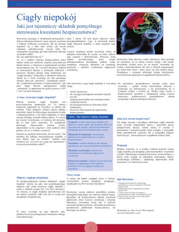 RISKworld RISKworld RISKworld RISKworld RISKworld RISKworld Ciągły niepokój Jaki jest tajemniczy składnik pomyślnego sterowania kwestiami bezpieczeństwa? Kierownicy pracujący w dziedzinach powiązanych z patrz 1 tabelę. Od tych pięciu objawów zależy dużym niebezpieczeństwem często mają do czynienia prawdopodobieństwo tego, że kierownik będzie z trudnym osobistym wyzwaniem: jak nie przestać ciągle odczuwał niepokój, a także natężenie tego niepokoić się o takie duże awarie, jak wyrzut uczucia. substancji radioaktywnych, wyciek nafty lub wykolejenie się pociągu, gdy takie katastrofy zdarzają Uczucie niepokoju przede wszystkim zależy od się bardzo rzadko? podejścia kierownika do ryzyka, na które wpływa Jak „nie zapomnieć bać się”? jego czujność i doświadczenie. Wówczas ocenę powodowanego przez ryzyko Kierownicy będą aktywnie szukać informacji, które pomogą To, że z punktu widzenia bezpieczeństwa pracy stopnia bardzo ważne jest zachować czujność, przyznano już niebezpieczeństwa przesądzają osobiste cechy, im zrozumieć, na co należy zwrócić uwagę i jak usunąć bardzo dawno, a zwłaszcza w organizacjach wysokiej charakteru, zwłaszcza skłonność do niepokoju, przeszkody. Zechcą uczyć się od innych, wymieniać się niezawodności (np.: Nr 1 na liście literatury). Jednym pesymizm i zdolność wyobrażania najgorszych wiedzą i doświadczeniem, tak, aby w rożnych organizacjach nie trzeba było znów i znów uczyć się tych samych lekcji. ze stosowanych obecnie w przemyśle naftowym i scenariuszy. Współpraca i wymiana informacji zastąpi nieużyteczne gazowym określeń takiego stanu duchowego jest powierzchowne spojrzenie na zagadnienia bezpieczeństwa. „ciągły niepokój”. Faktycznie, w literaturze termin ten ukazał się o wiele wcześniej niż inne powiązane terminy, takie jak „baczność”, „niespokojny umysł” lub „wyobraźnia powiązana z bezpieczeństwem”, gdy Gdy kierownicy czują ciągły niepokój w swej pracy, Na prawników przedsiębiorstw również czeka nowe prof. James Reason zaproponował termin mogą: wyzwanie – pomóc swoim kierownikom obcować i „ostrożność” w odniesieniu do ryzyka, jeszcze w 1997 wymieniać się informacjami, a nie przeszkadzać im w r. (Nr 2 na liście literatury). wymianie wiedzy i uczeniu się. Wielką wagę wiedzy o • myśleć elastycznie; bezpieczeństwie systemów i kompetencji uznają wszyscy • nie wyciągać pochopnych wniosków (myśleć kierownicy podstawowych przedsiębiorstw sektora • powoli) A więc, czym jest ciągły niepokój? związanego z dużym niebezpieczeństwem. zachęcać pracowników do wyrażania opinii; Mówiąc prościej, ciągły niepokój jest • wysłuchać innych; przeciwieństwem uspokojenia się. To zdrowe • być przygotowanymi na usłyszenie złych sceptyczne spojrzenie na wszystko, co robimy lub wiadomości; widzimy. Takie podejście zachęca zajrzeć głębiej, • okazywać zobowiązanie do zapewnienia sprawdzać, dążyć do faktycznego zrozumienia ryzyka bezpieczeństwa. i niebezpieczeństwa, a nie tylko zakładania, że skoro systemy działają, wszystko będzie dobrze. To znaczy 1 tabela – Pięć objawów ciągłego niepokoju Jaka jest strona negatywna? nie wierzyć wszystkiemu, co widzimy lub słyszymy, Już znając sytuację i posiadając informacje ciągły niepokój lub co nam mówi statystyka. To umiejętność Czujność: uważna obserwacja najsłabszych może wywołać niepotrzebne obawy i spowolnić proces dostrzegać dopuszczalny poziom ryzyka, objawów ryzyka, takich, jak incydenty, które nie podejmowania decyzji. Jednak należy to oceniać w odpowiednio na nie reagować i stale zadawać sobie spowodowały szkody, naruszenia parametrów technologicznych lub zlokalizowane awarie. porównaniu z konsekwencjami, które nastąpią w przypadku pytanie, czy to, co robimy, wystarczy. braku jakichkolwiek czynności lub w przypadku podjęcia Zmienia się myślenie kierownika. Już nie myśli: „Nie Skłonność do niepokoju: emocjonalna złych decyzji – nieszczęśliwymi wypadkami wielkiej skali. mieliśmy ani jednego nieszczęśliwego wypadku, a skłonność do niepokojenia się o ryzyko i więc dobrze nam się wiedzie”. Zamiast tego bezpieczeństwo. zastanowi się: „Czy jest coś, czego nie zauważamy, i Pesymizm: osobista skłonność do unikania co jeszcze powinniśmy zrobić?”. Wniosek uspokojenia się i do przewidywania problemów. Badania wykazały, że w punktu widzenia kontroli ryzyka Niezbędna wyobraźnia: zdolność do ciągły niepokój jest pożądaną cechą kierowników wszystkich wyobrażania i wizualizacji najgorszych szczebli. Odczuwający niepokój kierownicy tworzą kulturę, w scenariuszy. której czule reagują na najtrudniej postrzegane objawy ewentualnego problemu i podejmują odpowiednie kroki Elastyczne myślenie: zdolność kwestionowania skutecznie i we właściwym czasie. założeń, uwzględniając wiele aspektów problemu i nie wyciągając pochopnych wniosków. Objawy ciągłego niepokoju W przeprowadzonych ostatnio badaniach „ciągły niepokój” określa się jako stan psychologicznego napięcia, gdy osoba przeżywa ciągły niepokój i troskę o kontrolę ryzyka (Nr 3 na liście literatury). To oznacza, że ciągły niepokój spowodowany jest nie samym ryzykiem, tylko tym, jak to ryzyko jest zarządzane i kontrolowane. Nowy świat A zatem, jak będzie wyglądać świat, w którym Spis literatury stworzyliśmy uczucie niepokoju, zastępujące, 1. Managing the unexpected: Assuring high uspokojenie się (Nr 4 na liście literatury)? performance in an age of complexity, Weick and Sutcliffe, 2001. 2. Managing the risks of organisational accidents, Reason, 1997. 3. Chronic unease for safety in managers: a conceptualisation, Fruhen, Flin and McLeod, 2013. 4. Process safety, focusing on what really matters – leadership, Hackitt, 2013. Kierownicy zaczną zadawać pr