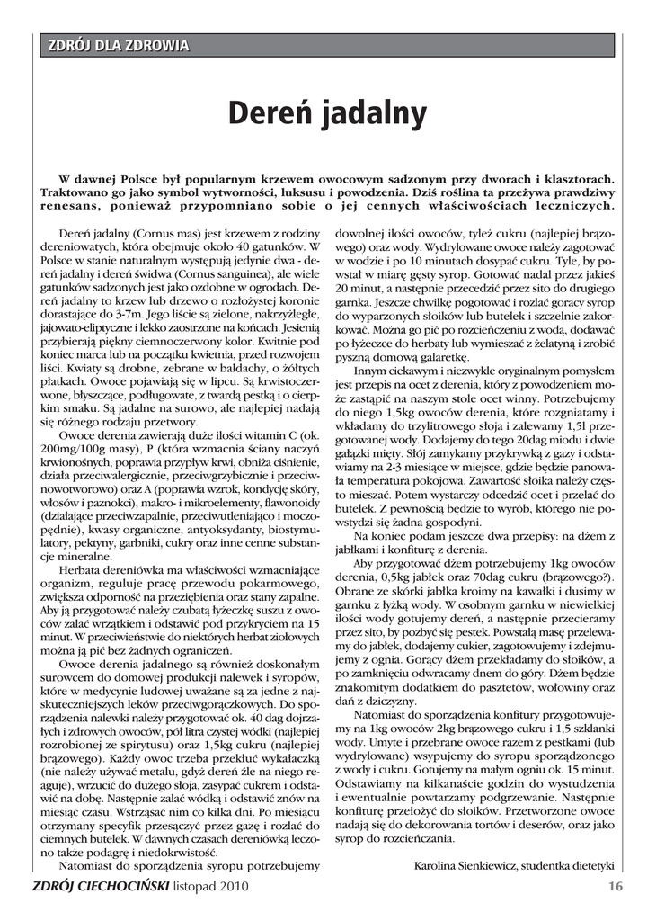 ZDRÓJ DLA ZDROWIA Dereƒ jadalny W dawnej Polsce by∏ popularnym krzewem owocowym sadzonym przy dworach i klasztorach. Traktowano go jako symbol wytwornoÊci, luksusu i powodzenia. DziÊ roÊlina ta prze˝ywa prawdziwy renesans, poniewa˝ przypomniano sobie o jej cennych w∏aÊciwoÊciach leczniczych. Dereƒ jadalny (Cornus mas) jest krzewem z rodziny dereniowatych, która obejmuje oko∏o 40 gatunków. W Polsce w stanie naturalnym wyst´pujà jedynie dwa - dereƒ jadalny i dereƒ Êwidwa (Cornus sanguinea), ale wiele gatunków sadzonych jest jako ozdobne w ogrodach. Dereƒ jadalny to krzew lub drzewo o roz∏o˝ystej koronie dorastajàce do 3-7m. Jego liÊcie sà zielone, nakrzy˝leg∏e, jajowato-eliptyczne i lekko zaostrzone na koƒcach. Jesienià przybierajà pi´kny ciemnoczerwony kolor. Kwitnie pod koniec marca lub na poczàtku kwietnia, przed rozwojem liÊci. Kwiaty sà drobne, zebrane w baldachy, o ˝ó∏tych p∏atkach. Owoce pojawiajà si´ w lipcu. Sà krwistoczerwone, b∏yszczàce, pod∏ugowate, z twardà pestkà i o cierpkim smaku. Sà jadalne na surowo, ale najlepiej nadajà si´ ró˝nego rodzaju przetwory. Owoce derenia zawierajà du˝e iloÊci witamin C (ok. 200mg/100g masy), P (która wzmacnia Êciany naczyƒ krwionoÊnych, poprawia przyp∏yw krwi, obni˝a ciÊnienie, dzia∏a przeciwalergicznie, przeciwgrzybicznie i przeciwnowotworowo) oraz A (poprawia wzrok, kondycj´ skóry, w∏osów i paznokci), makro- i mikroelementy, flawonoidy (dzia∏ajàce przeciwzapalnie, przeciwutleniajàco i moczop´dnie), kwasy organiczne, antyoksydanty, biostymulatory, pektyny, garbniki, cukry oraz inne cenne substancje mineralne. Herbata dereniówka ma w∏aÊciwoÊci wzmacniajàce organizm, reguluje prac´ przewodu pokarmowego, zwi´ksza odpornoÊç na przezi´bienia oraz stany zapalne. Aby jà przygotowaç nale˝y czubatà ∏y˝eczk´ suszu z owoców zalaç wrzàtkiem i odstawiç pod przykryciem na 15 minut. W przeciwieƒstwie do niektórych herbat zio∏owych mo˝na jà piç bez ˝adnych ograniczeƒ. Owoce derenia jadalnego sà równie˝ doskona∏ym surowcem do domowej produkcji nalewek i syropów, które w medycynie ludowej uwa˝ane sà za jedne z najskuteczniejszych leków przeciwgoràczkowych. Do sporzàdzenia nalewki nale˝y przygotowaç ok. 40 dag dojrza∏ych i zdrowych owoców, pó∏ litra czystej wódki (najlepiej rozrobionej ze spirytusu) oraz 1,5kg cukru (najlepiej bràzowego). Ka˝dy owoc trzeba przek∏uç wyka∏aczkà (nie nale˝y u˝ywaç metalu, gdy˝ dereƒ êle na niego reaguje), wrzuciç do du˝ego s∏oja, zasypaç cukrem i odstawiç na dob´. Nast´pnie zalaç wódkà i odstawiç znów na miesiàc czasu. Wstrzàsaç nim co kilka dni. Po miesiàcu otrzymany specyfik przesàczyç przez gaz´ i rozlaç do ciemnych butelek. W dawnych czasach dereniówkà leczono tak˝e podagr´ i niedokrwistoÊç. Natomiast do sporzàdzenia syropu potrzebujemy ZDRÓJ CIECHOCI¡SKI listopad 2010 dowolnej iloÊci owoców, tyle˝ cukru (najlepiej bràzowego) oraz wody. Wydrylowane owoce nale˝y zagotowaç w wodzie i po 10 minutach dosypaç cukru. Tyle, by powsta∏ w miar´ g´sty syrop. Gotowaç nadal przez jakieÊ 20 minut, a nast´pnie przecedziç przez sito do drugiego garnka. Jeszcze chwilk´ pogotowaç i rozlaç goràcy syrop do wyparzonych s∏oików lub butelek i szczelnie zakorkowaç. Mo˝na go piç po rozcieƒczeniu z wodà, dodawaç po ∏y˝eczce do herbaty lub wymieszaç z ˝elatynà i zrobiç pysznà domowà galaretk´. Innym ciekawym i niezwykle oryginalnym pomys∏em jest przepis na ocet z derenia, który z powodzeniem mo˝e zastàpiç na naszym stole ocet winny. Potrzebujemy do niego 1,5kg owoców derenia, które rozgniatamy i wk∏adamy do trzylitrowego s∏oja i zalewamy 1,5l przegotowanej wody. Dodajemy do tego 20dag miodu i dwie ga∏àzki mi´ty. S∏ój zamykamy przykrywkà z gazy i odstawiamy na 2-3 miesiàce w miejsce, gdzie b´dzie panowa∏a temperatura pokojowa. ZawartoÊç s∏oika nale˝y cz´sto mieszaç. Potem wystarczy odcedziç ocet i przelaç do butelek. Z pewnoÊcià b´dzie to wyrób, którego nie powstydzi si´ ˝adna gospodyni. Na koniec podam jeszcze dwa przepisy: na d˝em z jab∏kami i konfitur´ z derenia. Aby przygotowaç d˝em potrzebujemy 1kg owoców derenia, 0,5kg jab∏ek oraz 70dag cukru (bràzowego?). Obrane ze skórki jab∏ka kroimy na kawa∏ki i dusimy w garnku z ∏y˝kà wody. W osobnym garnku w niewielkiej iloÊci wody gotujemy dereƒ, a nast´pnie przecieramy przez sito, by pozbyç si´ pestek. Powsta∏à mas´ przelewamy do jab∏ek, dodajemy cukier, zagotowujemy i zdejmujemy z ognia. Goràcy d˝em przek∏adamy do s∏oików, a po zamkni´ciu odwracamy dnem do góry. D˝em b´dzie znakomitym dodatkiem do pasztetów, wo∏owiny oraz daƒ z dziczyzny. Natomiast do sporzàdzenia konfitury przygotowujemy na 1kg owoców 2kg bràzowego cukru i 1,5 szklanki wody. Umyte i przebrane owoce razem z pestkami (lub wydrylowane) wsypujemy do syropu sporzàdzonego z wody i cukru. Gotujemy na ma∏ym ogniu ok. 15 minut. Odstawiamy na kilkanaÊcie godzin do wystudzenia i ewentualnie powtarzamy podgrzewanie. Nast´pnie konfitur´ prze∏o˝yç do s∏oików. Przetworzone owoce nadajà si´ do dekorowania tortów i deserów, oraz jako syrop do rozcieƒczania. Karolina Sienkiewicz, studentka dietetyki 16