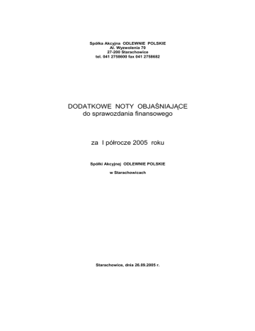 Spółka Akcyjna ODLEWNIE POLSKIE Al. Wyzwolenia 70 27-200 Starachowice tel. 041 2758600 fax 041 2758682 DODATKOWE NOTY OBJAŚNIAJĄCE do sprawozdania finansowego za I półrocze 2005 roku Spółki Akcyjnej ODLEWNIE POLSKIE w Starachowicach Starachowice, dnia 26.09.2005 r. Spółka Akcyjna ODLEWNIE POLSKIE z siedzibą w Starachowicach ZARZĄD SPÓŁKI AKCYJNEJ ODLEWNIE POLSKIE z siedzibą w Starachowicach PREZES ZARZĄDU …………………………………. Zbigniew Ronduda WICEPREZES ZARZĄDU ………………………………….. Leszek Walczyk WICEPREZES ZARZĄDU …………………………………… Ryszard Pisarski Dodatkowe noty objaśniające do sprawozdania finansowego za I półrocze 2005 roku 2 Spółka Akcyjna ODLEWNIE POLSKIE z siedzibą w Starachowicach 1. Instrumenty finansowe Działalność Spółki Akcyjnej Odlewnie Polskie w I półroczu 2005 r. finansowana była głównie przez kredyt bankowy w rachunku bieŜącym zaciągnięty w Banku BPH Spółka Akcyjna z siedzibą w Krakowie Centrum Korporacyjne w Kielcach. Dodatkowym źródłem finansowania były w okresie od stycznia do marca 2005 r. poŜyczki od większościowego właściciela OP INVEST Sp. z o.o. w Starachowicach oraz poŜyczka Wiceprezesa Zarządu P. Leszka Walczyka udzielona Oddziałowi Odlewni Polskich w Wiesbaden. Spółka skorzystała teŜ z kredytu w Volkswagen Bank Polska S.A. z siedzibą w Warszawie na zakup dwu samochodów Passat Limousin. 2. Zobowiązania warunkowe Spółki to: a/ poręczenie kredytu udzielonego przez Bank Przemysłowo-Handlowy PBK S.A. Centrum Korporacyjne w Kielcach Spółce OP INVEST w Starachowicach na wartość 129 tys. PLN b/ poręczenie kredytu udzielonego przez Bank Przemysłowo-Handlowy PBK S.A. Centrum Korporacyjne w Kielcach Spółce IWIT w Starachowicach na wartość 150 tys. PLN c/ poręczenie poŜyczki udzielonej przez Koneckie Stowarzyszenie Wspierania Przedsiębiorczości w Końskich Spółce IWIT w Starachowicach na wartość 120 tys. PLN. 3. Zobowiązania wobec budŜetów miast i gmin z tytułu uzyskania prawa własności budynków i budowli na koniec I półrocza 2005 r. nie wystąpiły i nie figurują w ewidencji pozabilansowej . 4. W I półroczu 2005 roku nie wystąpiły zjawiska: zaniechania produkcji, cykliczności i sezonowości działalności. Nie miały miejsca emisja akcji, wykup i spłata dłuŜnych i kapitałowych papierów wartościowych. Nie wypłacano teŜ w bieŜącym roku dywidendy. Uchwałą Nr 6/2005 Zwyczajnego Walnego Zgromadzenia Akcjonariuszy zysk netto Spółki Akcyjnej Odlewnie Polskie za rok 2004 w całości został przeznaczony na pokrycie strat z lat ubiegłych. 5. W Odlewnie Polskie S.A. nie wystąpił teŜ w I półroczu bieŜącego roku koszt wytworzenia świadczeń na własne potrzeby. 6. Poniesione nakłady inwestycyjne do końca miesiąca czerwca 2005 roku wyniosły 3 669 tys. zł. W kwocie poniesionych nakładów, nakłady na ochronę środowiska naturalnego stanowiły 2 711 tys. zł. Planowane nakłady inwestycyjne w okresie 12 miesięcy po dniu bilansowym szacuje się na wartość 16 275 tys. zł. Z kwoty planowanych nakładów na ochronę środowiska planuje się przeznaczyć 13 732 tys. zł. Przeznaczenie tak wysokiej kwoty na ochronę środowiska ma na celu uzyskanie „Zintegrowanego pozwolenia”, do którego uzyskania zobowiązana jest Spółka na mocy Rozporządzenia Ministra Środowiska z dnia 26.09.2003 r. w sprawie późniejszych terminów do uzyskania pozwolenia zintegrowanego. 7. W okresie od stycznia do czerwca br. nie wystąpiły zmiany w strukturze Spółki w wyniku połączenia jednostek gospodarczych, przejęcia lub sprzedaŜy jednostek, inwestycji długoterminowych, podziału, restrukturyzacji i zaniechania działalności. W wyniku restrukturyzacji majątku związanego z przygotowaniem do realizacji planu inwestycyjnego Spółka zbyła w I półroczu bieŜącego roku część nieprzydatnych obiektów oraz zbędnych maszyn i urządzeń za kwotę 1 648 tys. PLN. W miesiącu czerwcu Spółka ODLEWNIE POLSKIE zakupiła 68 % udziałów w Spółce DKN Info Sp. z o. o. z Dodatkowe noty objaśniające do sprawozdania finansowego za I półrocze 2005 roku 3 Spółka Akcyjna ODLEWNIE POLSKIE z siedzibą w Starachowicach siedzibą w Kielcach za kwotę 130.000 PLN. Spółka DKN Info w oparciu o zawartą z Odlewniami Polskimi umowę z dnia 01.12.2004 r. prowadzi obsługę informatyczną w Odlewnie Polskie S.A. Dane finansowe Spółki DKN Info na dzień 30.06.2005 r. nie zostały objęte konsolidacją na mocy art. 58 ust.1 Ustawy o rachunkowości. 8. Na koniec I półrocza 2005 r. nie toczyły się przed sądami, organami właściwymi dla postępowania arbitraŜowego lub organami administracji publicznej postępowania dot. zobowiązań i naleŜności, których wartość przekraczałaby 10 % kapitałów własnych. 9. ODLEWNIE POLSKIE S.A. w I półroczu 2005 roku nie realizowała wspólnych przedsięwzięć z podmiotami nie wchodzącymi w skład Spółki. Nie zawierała teŜ transakcji nietypowych i nierutynowych z podmiotami powiązanymi. 10. Przeciętne zatrudnienie w roku obrotowym w grupach zawodowych przedstawia się następująco: Pracownicy bezpośrednio produkcyjni Pracownicy pośrednio produkcyjni Stanowiska nierobotnicze (umysłowi) Pozostali 30.06.2005 r. 342 42 92 26 RAZEM 502 30.06.2004 r. 398 49 101 28 576 11. Wynagrodzenie wypłacone Członkom Zarządu za I półrocze 2005 r. wyniosło 673 tys. zł, a Radzie Nadzorczej 62 tys. zł. 12. W Spółce Odlewnie Polskie na koniec miesiąca czerwca 2005 r. wystąpiły naleŜności z tyt. niespłaconych a udzielonych przez Spółkę poŜyczek następującym podmiotom: 1. ALMECO INDUSTRY S.A. w upadłości w SkarŜysku Kamiennej 827 tys.PLN Termin spłaty 30.06.2002r. Oprocentowanie śr.arytm. stawki Wibor z dnia 25 poprzedniego m-ca dla depoz.3M oraz marŜa w wys. 1,5 % w stosunku rocznym 2. Zakład Odlewniczy MISTAL Sp. z o.o. w upadłości w Myszkowie 805 tys
