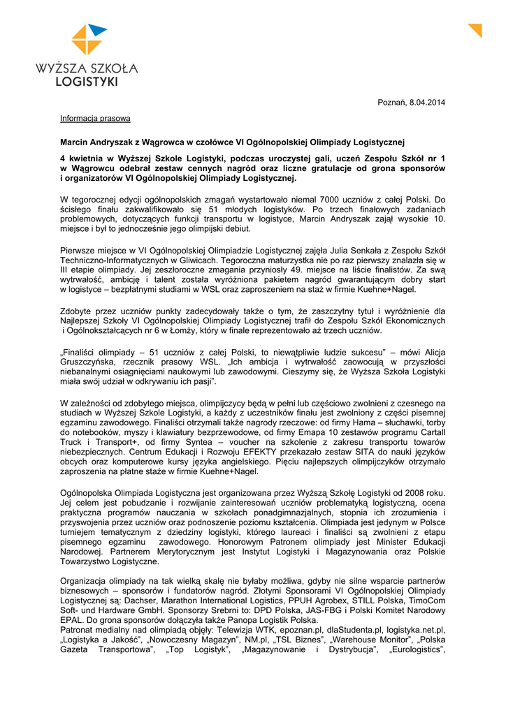 Poznań, 8.04.2014 Informacja prasowa Marcin Andryszak z Wągrowca w czołówce VI Ogólnopolskiej Olimpiady Logistycznej 4 kwietnia w Wyższej Szkole Logistyki, podczas uroczystej gali, uczeń Zespołu Szkół nr 1 w Wągrowcu odebrał zestaw cennych nagród oraz liczne gratulacje od grona sponsorów i organizatorów VI Ogólnopolskiej Olimpiady Logistycznej. W tegorocznej edycji ogólnopolskich zmagań wystartowało niemal 7000 uczniów z całej Polski. Do ścisłego finału zakwalifikowało się 51 młodych logistyków. Po trzech finałowych zadaniach problemowych, dotyczących funkcji transportu w logistyce, Marcin Andryszak zajął wysokie 10. miejsce i był to jednocześnie jego olimpijski debiut. Pierwsze miejsce w VI Ogólnopolskiej Olimpiadzie Logistycznej zajęła Julia Senkała z Zespołu Szkół Techniczno-Informatycznych w Gliwicach. Tegoroczna maturzystka nie po raz pierwszy znalazła się w III etapie olimpiady. Jej zeszłoroczne zmagania przyniosły 49. miejsce na liście finalistów. Za swą wytrwałość, ambicję i talent została wyróżniona pakietem nagród gwarantującym dobry start w logistyce – bezpłatnymi studiami w WSL oraz zaproszeniem na staż w firmie Kuehne+Nagel. Zdobyte przez uczniów punkty zadecydowały także o tym, że zaszczytny tytuł i wyróżnienie dla Najlepszej Szkoły VI Ogólnopolskiej Olimpiady Logistycznej trafił do Zespołu Szkół Ekonomicznych i Ogólnokształcących nr 6 w Łomży, który w finale reprezentowało aż trzech uczniów. „Finaliści olimpiady – 51 uczniów z całej Polski, to niewątpliwie ludzie sukcesu” – mówi Alicja Gruszczyńska, rzecznik prasowy WSL. „Ich ambicja i wytrwałość zaowocują w przyszłości niebanalnymi osiągnięciami naukowymi lub zawodowymi. Cieszymy się, że Wyższa Szkoła Logistyki miała swój udział w odkrywaniu ich pasji”. W zależności od zdobytego miejsca, olimpijczycy będą w pełni lub częściowo zwolnieni z czesnego na studiach w Wyższej Szkole Logistyki, a każdy z uczestników finału jest zwolniony z części pisemnej egzaminu zawodowego. Finaliści otrzymali także nagrody rzeczowe: od firmy Hama – słuchawki, torby do notebooków, myszy i klawiatury bezprzewodowe, od firmy Emapa 10 zestawów programu Cartall Truck i Transport+, od firmy Syntea – voucher na szkolenie z zakresu transportu towarów niebezpiecznych. Centrum Edukacji i Rozwoju EFEKTY przekazało zestaw SITA do nauki języków obcych oraz komputerowe kursy języka angielskiego. Pięciu najlepszych olimpijczyków otrzymało zaproszenia na płatne staże w firmie Kuehne+Nagel. Ogólnopolska Olimpiada Logistyczna jest organizowana przez Wyższą Szkołę Logistyki od 2008 roku. Jej celem jest pobudzanie i rozwijanie zainteresowań uczniów problematyką logistyczną, ocena praktyczna programów nauczania w szkołach ponadgimnazjalnych, stopnia ich zrozumienia i przyswojenia przez uczniów oraz podnoszenie poziomu kształcenia. Olimpiada jest jedynym w Polsce turniejem tematycznym z dziedziny logistyki, którego laureaci i finaliści są zwolnieni z etapu pisemnego egzaminu zawodowego. Honorowym Patronem olimpiady jest Minister Edukacji Narodowej. Partnerem Merytorycznym jest Instytut Logistyki i Magazynowania oraz Polskie Towarzystwo Logistyczne. Organizacja olimpiady na tak wielką skalę nie byłaby możliwa, gdyby nie silne wsparcie partnerów biznesowych – sponsorów i fundatorów nagród. Złotymi Sponsorami VI Ogólnopolskiej Olimpiady Logistycznej są: Dachser, Marathon International Logistics, PPUH Agrobex, STILL Polska, TimoCom Soft- und Hardware GmbH. Sponsorzy Srebrni to: DPD Polska, JAS-FBG i Polski Komitet Narodowy EPAL. Do grona sponsorów dołączyła także Panopa Logistik Polska. Patronat medialny nad olimpiadą objęły: Telewizja WTK, epoznan.pl, dlaStudenta.pl, logistyka.net.pl, „Logistyka a Jakość”, „Nowoczesny Magazyn”, NM.pl, „TSL Biznes”, „Warehouse Monitor”, „Polska Gazeta Transportowa”, „Top Logistyk”, „Magazynowanie i Dystrybucja”, „Eurologistics”, Pracujwlogistyce.pl, Forumtransportu.pl, DobraLogistyka.pl, Spedycje.pl, etransport.pl, LOG24.pl, elogistyka.pl, Kierunki.net, Edukacja.net, Uczelnie.net DODATKOWE INFORMACJE: Alicja Gruszczyńska Rzecznik Prasowy WSL tel. 61 850 47 82 [email protected] 61-755 POZNAŃ, UL. E. ESTKOWSKIEGO 6 NIP 778-13-89-372 Regon 300124247 Bank Zachodni WBK S.A. nr 82 1090 1362 0000 0000 3603 4303 Rektorat tel. 61 850 47 81 Dziekanat tel. 61 850 47 64 Księgowość tel. 61 850 47 79 Kadry tel. 61 850 47 71 fax 61 850 47 89 [email protected] www.wsl.com.pl 61-755 POZNAŃ, UL. E. ESTKOWSKIEGO 6 NIP 778-13-89-372 Regon 300124247 Bank Zachodni WBK S.A. nr 82 1090 1362 0000 0000 3603 4303 Rektorat tel. 61 850 47 81 Dziekanat tel. 61 850 47 64 Księgowość tel. 61 850 47 79 Kadry tel. 61 850 47 71 fax 61 850 47 89 [email protected] www.wsl.com.pl 61-755 POZNAŃ, UL. E. ESTKOWSKIEGO 6 NIP 778-13-89-372 Regon 300124247 Bank Zachodni WBK S.A. nr 82 1090 1362 0000 0000 3603 4303 Rektorat tel. 61 850 47 81 Dziekanat tel. 61 850 47 64 Księgowość tel. 61 850 47 79 Kadry tel. 61 850 47 71 fax 61 850 47 89 [email protected] www.wsl.com.pl 61-755 POZNAŃ, UL. E. ESTKOWSKIEGO 6 NIP 778-13-89-372 Regon 300124247 Bank Zachodni WBK S.A. nr 82 1090 1362 0000 0000 3603 4303 Rektorat tel. 61 850 47 81 Dziekanat tel. 61 850 47 64 Księgowość tel. 61 850 47 79 Kadry tel. 61 850 47 71 fax 61 850 47 89 [email protected] www.wsl.com.pl