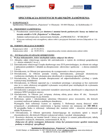 SPECYFIKACJA ISTOTNYCH WARUNKÓW ZAMÓWIENIA I. ZAMAWIAJĄCY Spółdzielnia Mieszkaniowa „Pojezierze” w Olsztynie 10-444 Olsztyn, ul. Kołobrzeska 13 II. PRZEDMIOT ZAMÓWIENIA 1. Przedmiotem zamówienia jest dostawa i montaż ławek parkowych i koszy na śmieci na terenie osiedli w S.M ,,Pojezierze” w Olsztynie. Zadanie realizowane przy zastosowaniu formuły „ZAPROJEKTUJ – WYBUDUJ” 2. Wytyczne realizacji oraz szczegółowy zakres robót z przyjętymi ilościami zawiera Załącznik nr 1 do SIWZ. III. TERMINY REALIZACJI ROBÓT Rozpoczęcie robót - od 01.04.2013r. Zakończenie robót - do 30.09.2013r. - nieprzekraczalny termin zakończenia całości robót. 1. Wykaz dokumentów, które niezbędnie należy załączyć do oferty: 2.1. Aktualny odpis właściwego rejestru lub zaświadczenie o wpisie do ewidencji gospodarczej ( z okresu ostatnich 3 m-cy ). 2.2 Zaświadczenie właściwego Urzędu skarbowego oraz ZUS potwierdzające, że oferent nie zalega z opłacaniem podatków i składek na ubezpieczenie zdrowotne i społeczne – z okresu ostatnich 3 m-cy. 2.3 Oświadczenie, że Oferent jest uprawniony do występowania w obrocie prawnym. 2.4 Oświadczenie, że Oferent posiada wiedzę, doświadczenie, potencjał ekonomiczny i techniczny niezbędny do wykonania prac określonych w niniejszej specyfikacji. 2.5 Oświadczenie, że Oferent posiada ubezpieczenie od odpowiedzialności cywilnej z tytułu wykonywanej działalności 2.6 Oświadczenie, że Oferent zapoznał się z warunkami przetargu i przyjmuje je bez zastrzeżeń oraz że w cenie ofertowej uwzględnił wykonanie wszystkich prac niezbędnych do wykonania przedmiotu zamówienia. 2.7 Oświadczenie o przyjęciu bez zastrzeżeń warunków umownych, określonych w załączonym do niniejsze SIWZ projekcie umowy. 2.8 Oświadczenie, że Oferent jest związany złożoną ofertą przez okres 45 dni, liczonych od dnia wyznaczonego na jej złożenie. 2.9 Referencje, opinie i rekomendacje udzielone Oferentowi przez inwestorów, dla których wcześniej realizował zadania o podobnym charakterze. Wymagana ilość referencji wynosi co najmniej 3. Referencje muszą dotyczyć robót związanych z przedmiotem zamówienia o łącznej wartości nie mniejszej niż 300 000 zł. W przypadku braku w referencji informacji dot. wartości robót – stosowne oświadczenie składa Wykonawca. 2.10 Oświadczenie, iż Oferent upoważnia Zamawiającego do uzyskania opinii u innych zleceniodawców, dla których Oferent wykonywał roboty i uzyskał rekomendacje. 2.12 Kosztorys skrócony na montaż ławek i koszy na śmiecie (z cenami jednostkowymi, tabelą elementów scalonych, obmiarem, zestawieniem R, M, S). Załączone do oferty wymagane dokumenty winny być ponumerowane zgodnie numeracją podaną w niniejszej specyfikacji Spółdzielnia Mieszkaniowa „Pojezierze” w Olsztynie 10-444 Olsztyn, ul. Kołobrzeska 13, NIP 739-020-38-48, e-mail: [email protected], www.smp.olsztyn.pl tel. (089) 537-33-00, fax. (089) 537-33-01 1 WYMAGANIA STAWIANE OFERENTOWI Strona IV. V. SPOSÓB PRZYGOTOWANIA OFERTY 1. Oferta – winna być sporządzona w/g załączonego wzoru oferty (Załączniki Nr 2) - umożliwi to jednolitą ocenę ofert w chwili ich otwarcia. 2. Oferta zawierać musi nazwę oferenta, dokładny jego adres, telefon i fax., kompletny zestaw żądanych dokumentów wymaganych niniejszą specyfikacją. 3. Wartość ofertowa winna uwzględniać koszty kompletnego wykonania – przedmiotu umowy w pkt. II SIWZ, tj. wszystkich prac niezbędnych do prawidłowego wykonania zadania, 4. Oferta winna być spięta i podpisana przez osoby uprawnione do prawnego reprezentowania firmy - zgodnie z aktem rejestracyjnym lub pełnomocnika 5. Oferent ma prawo złożyć tylko jedną ofertę na wybrany zakres robót. 6. Ewentualne poprawki muszą być sygnowane podpisem osoby podpisującej ofertę. 7. Wszelkie koszty związane ze sporządzeniem oferty ponosi oferent niezależnie od wyniku postępowania. 8. Ofertę z ponumerowanymi stronami należy umieścić w trwałym opakowaniu, skutecznie zabezpieczonym przed otwarciem przez osoby nieuprawnione – oznaczonym w następujący sposób: a/ nazwa i adres Zamawiającego b/ nazwa i adres Oferenta c/ „Przetarg na dostawę i montaż ławek parkowych i koszy na śmieci na terenie osiedli w Spółdzielni Mieszkaniowej „Pojezierze” w Olsztynie” z dopiskiem na kopercie: ,,NIE OTWIERAĆ PRZED …………...2013r. – godz. 14.00”. Spółdzielnia Mieszkaniowa „Pojezierze” w Olsztynie 10-444 Olsztyn, ul. Kołobrzeska 13, NIP 739-020-38-48, e-mail: [email protected], www.smp.olsztyn.pl tel. (089) 537-33-00, fax. (089) 537-33-01 Strona - Oferent przystępujący do przetargu jest obowiązany wnieść wadium na dwa dni przed terminem składania ofert, w wysokości 10 000 zł. Kopię wpłaty należy dołączyć do oferty a oryginał okazać w trakcie przetargu. - Wadium może zostać wniesione w następujących formach: a) w gotówce; wadium należy wpłacić przelewem na konto SM Pojezierze w Banku PKO BP S.A. nr 33 1020 3541 0000 5902 0112 7547, b) poręczenie bankowe, c) gwarancje bankowe, d) gwarancje ubezpieczeniowe. Oryginały dokumentów potwierdzających wniesienie wadium muszą być dołączone do oferty. Wadium wniesione w formie innej niż w pieniądzu musi być dokumentem reprezentującym bezwarunkową gwarancję płatną na żądanie Zamawiającego. - Zamawiający dokona zwrotu wadium niezwłocznie (lecz nie później niż w ciągu 14 dni) po wyborze najkorzystniejszej oferty lub unieważnieniu postępowania z wyjątkiem oferenta, którego oferta została wybrana jako najkorzystniejsza. 4. Wadium oferenta, którego oferta została wybrana jako najkorzystniejsza zostanie zwrócone niezwłocznie po zawarciu umowy i wniesieniu zabezpieczenia należytego wykonania umowy. 5. Oferent, którego oferta została wybrana traci wadium na rzecz Zamawiającego w przypadku, gdy: - odmówi podpisania umowy wg wzoru załączonego do ni