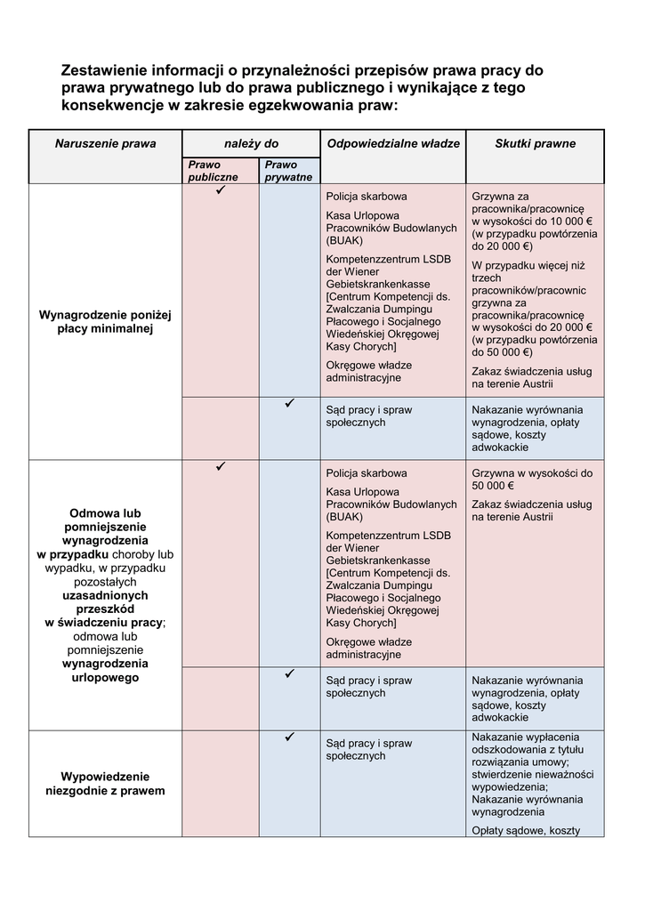 Zestawienie informacji o przynależności przepisów prawa pracy do prawa prywatnego lub do prawa publicznego i wynikające z tego konsekwencje w zakresie egzekwowania praw: Naruszenie prawa należy do Prawo publiczne Odpowiedzialne władze Prawo prywatne Policja skarbowa Kasa Urlopowa Pracowników Budowlanych (BUAK) Kompetenzzentrum LSDB der Wiener Gebietskrankenkasse [Centrum Kompetencji ds. Zwalczania Dumpingu Płacowego i Socjalnego Wiedeńskiej Okręgowej Kasy Chorych] Wynagrodzenie poniżej płacy minimalnej Okręgowe władze administracyjne Odmowa lub pomniejszenie wynagrodzenia w przypadku choroby lub wypadku, w przypadku pozostałych uzasadnionych przeszkód w świadczeniu pracy; odmowa lub pomniejszenie wynagrodzenia urlopowego Grzywna za pracownika/pracownicę w wysokości do 10 000 € (w przypadku powtórzenia do 20 000 €) W przypadku więcej niż trzech pracowników/pracownic grzywna za pracownika/pracownicę w wysokości do 20 000 € (w przypadku powtórzenia do 50 000 €) Zakaz świadczenia usług na terenie Austrii Sąd pracy i spraw społecznych Nakazanie wyrównania wynagrodzenia, opłaty sądowe, koszty adwokackie Policja skarbowa Grzywna w wysokości do 50 000 € Kasa Urlopowa Pracowników Budowlanych (BUAK) Zakaz świadczenia usług na terenie Austrii Kompetenzzentrum LSDB der Wiener Gebietskrankenkasse [Centrum Kompetencji ds. Zwalczania Dumpingu Płacowego i Socjalnego Wiedeńskiej Okręgowej Kasy Chorych] Okręgowe władze administracyjne Wypowiedzenie niezgodnie z prawem Skutki prawne Sąd pracy i spraw społecznych Sąd pracy i spraw społecznych Nakazanie wyrównania wynagrodzenia, opłaty sądowe, koszty adwokackie Nakazanie wypłacenia odszkodowania z tytułu rozwiązania umowy; stwierdzenie nieważności wypowiedzenia; Nakazanie wyrównania wynagrodzenia Opłaty sądowe, koszty adwokackie Przekroczenie maksymalnego czasu pracy Zagrożenie dla bezpieczeństwa lub zdrowia w miejscu pracy Inspekcja pracy Okręgowe władze administracyjne Inspekcja pracy Okręgowe władze administracyjne Zaniechanie zgłoszenia delegacji lub udostępnienia pracownika Centralna placówka koordynująca ds. nielegalnego zatrudnienia (ZKO) Policja skarbowa Grzywna w wysokości do 3600 € Grzywna w wysokości do 16 659 € Grzywna za pracownika/pracownicę w wysokości do 5000 € (w przypadku powtórzenia do 10 000 €) Kasa Urlopowa Pracowników Budowlanych (BUAK) Okręgowe władze administracyjne Braki w dokumentach (kopii zgłoszenia, dokumentu poświadczającego ubezpieczenie społeczne A1, zezwolenia na pracę z kraju delegującego) Policja skarbowa Kasa Urlopowa Pracowników Budowlanych (BUAK) Grzywna za pracownika/pracownicę w wysokości do 5000 € (w przypadku powtórzenia do 10 000 €) Okręgowe władze administracyjne Policja skarbowa Kasa Urlopowa Pracowników Budowlanych (BUAK) Okręgowe władze administracyjne Braki w dokumentach płacowych Grzywna za pracownika/pracownicę w wysokości do 10 000 € (w przypadku powtórzenia do 20 000 €) W przypadku więcej niż trzech pracowników/pracownic grzywna za pracownika/pracownicę w wysokości do 20 000 € (w przypadku powtórzenia do 50 000 €) Zakaz świadczenia usług na terenie Austrii Odmowa wglądu w dokumenty (dokumenty płacowe, kopia zgłoszenia, dokument poświadczający ubezpieczenie społeczne A1) Odmowa lub utrudnianie kontroli płac Policja skarbowa Kasa Urlopowa Pracowników Budowlanych (BUAK) Okręgowe władze administracyjne Policja skarbowa Kasa Urlopowa Grzywna za pracownika/pracownicę w wysokości do 10 000 € (w przypadku powtórzenia do 20 000 €) Zakaz świadczenia usług na terenie Austrii Grzywna w wysokości do 10 000 € (w przypadku Pracowników Budowlanych (BUAK) Okręgowe władze administracyjne powtórzenia do 20 000 €) Zakaz świadczenia usług na terenie Austrii