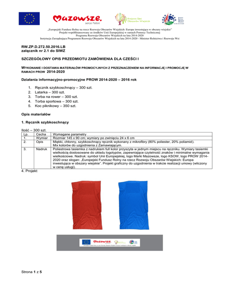 „Europejski Fundusz Rolny na rzecz Rozwoju Obszarów Wiejskich: Europa inwestująca w obszary wiejskie” Projekt współfinansowany ze środków Unii Europejskiej w ramach Pomocy Technicznej Programu Rozwoju Obszarów Wiejskich na lata 2014-2020 Instytucja Zarządzająca Programem Rozwoju Obszarów Wiejskich na lata 2014-2020 - Minister Rolnictwa i Rozwoju Wsi RW.ZP.D.272.50.2016.LB załącznik nr 2.1 do SIWZ SZCZEGÓŁOWY OPIS PRZEDMIOTU ZAMÓWIENIA DLA CZEŚCI I WYKONANIE I DOSTAWA MATERIAŁÓW PROMOCYJNYCH Z PRZEZNACZENIEM NA INFORMACJĘ I PROMOCJĘ W RAMACH PROW 2014-2020 Działania informacyjno-promocyjne PROW 2014-2020 – 2016 rok 1. 2. 3. 4. 5. Ręcznik szybkoschnący – 300 szt. Latarka – 300 szt. Torba na rower – 300 szt. Torba sportowa – 300 szt. Koc piknikowy – 350 szt. Opis materiałów 1. Ręcznik szybkoschnący Ilość – 300 szt. Lp. 1. 2. Cecha Wymiar Opis 3. Nadruk 4. Projekt Strona 1 z 5 Wymagane parametry Rozmiar 145 x 90 cm; wymiary po zwinięciu 24 x 6 cm Miękki, chłonny, szybkoschnący ręcznik wykonany z mikrofibry (80% poliester, 20% poliamid). Mix kolorów do uzgodnienia z Zamawiającym. Poliestrowa tasiemka z nadrukiem full kolor przyszyta w jednym miejscu na ręczniku. Wymiary tasiemki wielkością dostosowane do układu logotypów, zapewniające czytelność znaków i minimalne wymagania wielkościowe. Nadruk: symbol Unii Europejskiej, logo Marki Mazowsze, logo KSOW, logo PROW 20142020 oraz slogan: „Europejski Fundusz Rolny na rzecz Rozwoju Obszarów Wiejskich: Europa inwestująca w obszary wiejskie”. Projekt graficzny do uzgodnienia w trakcie realizacji umowy (wliczony w cenę usługi). RW-D-III.ZP.D.272.50.2016.LB Szczegółowy opis przedmiotu zamówienia zał. 2.1 do SIWZ 2. Latarka Ilość – 300 szt. Lp. 1. 2. 3. Cecha Wymi ar Opis Nadru k Wymagane parametry 204 x 37 x 37 mm Latarka o strumieniu światła 450 lumenów, amerykańska dioda CREE XPG (5 wat) charakteryzująca się wysoką jakością. Funkcja zoom x 2000. 3 tryby świecenia: mocny, optymalny (oszczędzający baterię), migający. 3 baterie R14 (dołączone). Latarka w kolorze czarnym i granatowym – mix kolorów do uzgodnienia z Zamawiającym. Uchwyt z poliestrowej tasiemki z nadrukiem full kolor. Uchwyt do latarki przymocowany na stałe. Wymiary tasiemki: wielkością dostosowane do układu logotypów, zapewniające czytelność znaków i minimalne wymagania wielkościowe. Na pudełku epoksydowa naklejka z nadrukiem full kolor. Nadruk: symbol Unii Europejskiej, logo Marki Mazowsze, logo KSOW, logo PROW 2014-2020 oraz slogan: „Europejski Fundusz Rolny na rzecz Rozwoju Obszarów Wiejskich: Europa inwestująca w obszary wiejskie”. Projekt graficzny do uzgodnienia w trakcie realizacji umowy (wliczony w cenę usługi). 4. Projekt 3. Torba na rower Ilość – 300 szt. Lp. 1. 2. 3. Cecha Wymi ar Opis Nadru k 4. Projekt Strona 2 z 5 Wymagane parametry Wymiary - dwie boczne torby z odblaskami o wymiarach: 28x41x12 cm; jedna górna torba, która ma regulowane paski i może służyć jako plecak: 31x41x12,5 cm. 3-częściowy komplet bagażowy na rower. W zestawie znajdują się 2 boczne torby (sakwy) z odblaskami oraz plecak. Sakwy zapinane na zamki błyskawiczne Plecak wyposażony w paski o regulowanej długości. Dodatkowo w zestawie znajduje się osłona przeciwdeszczowa. Poliestrowa tasiemka z nadrukiem full kolor przyszyta w jednym miejscu na torbie i na plecaku Wymiary tasiemki wielkością dostosowane do układu logotypów, zapewniające czytelność znaków i minimalne wymagania wielkościowe. Nadruk: symbol Unii Europejskiej, logo Marki Mazowsze, logo KSOW, logo PROW 2014-2020 oraz slogan: „Europejski Fundusz Rolny na rzecz Rozwoju Obszarów Wiejskich: Europa inwestująca w obszary wiejskie”. Projekt graficzny do uzgodnienia w trakcie realizacji umowy (wliczony w cenę usługi). RW-D-III.ZP.D.272.50.2016.LB Szczegółowy opis przedmiotu zamówienia zał. 2.1 do SIWZ 4. Torba sportowa Ilość – 300 szt. Lp. 1. 2. 3. Cecha Wymi ar Opis Nadru k 4. Projekt Strona 3 z 5 Wymagane parametry 54 x 29 x 26 cm. Torba sportowa z wieloma przegrodami. Wzmocniony odpinany pasek na ramię. Osobna komora na buty. Nieprzemakalna kieszeń. Wewnętrzna kieszeń na kosztowności. Zewnętrzna kieszeń wykonana z elastycznej siatki. Tylna kieszeń zapinana na zamek. Ochronne bolce u spodu torby. Metalowe oczka wentylacyjne. Miękki uchwyt do noszenia w ręce. Pojemność: 30 litrów. Kolor: mix kolorów do uzgodnienia z Zamawiającym. Poliestrowa tasiemka z nadrukiem full kolor przyszyta w jednym miejscu na pasku na ramię. Wymiary tasiemki wielkością dostosowane do układu logotypów, zapewniające czytelność znaków i minimalne wymagania wielkościowe. Nadruk: symbol Unii Europejskiej, logo Marki Mazowsze, logo KSOW, logo PROW 2014-2020 oraz slogan: „Europejski Fundusz Rolny na rzecz Rozwoju Obszarów Wiejskich: Europa inwestująca w obszary wiejskie”. Projekt graficzny do uzgodnienia w trakcie realizacji umowy (wliczony w cenę usługi). RW-D-III.ZP.D.272.50.2016.LB Szczegółowy opis przedmiotu zamówienia zał. 2.1 do SIWZ 5. Koc piknikowy Ilość – 350 szt. Lp. 1. 2. 3. Cecha Wymi ar Opis Nadru k 4. Projekt Strona 4 z 5 Wymagane parametry 180x150 cm. Koc piknikowy – mix kolorów do uzgodnienia z Zamawiającym. Od spodu podszycie specjalną wodoodporną warstwą PVC, która chroni przed wilgocią i wszelkimi zabrudzeniami. Łatwa w suszeniu i czyszczeniu. Łatwy sposób składania do postaci torby. Uchwyt do noszenia w dłoni. Materiał koca: polar, pianka i folia PVC. Poliestrowa tasiemka z nadrukiem full kolor przyszyta w jednym miejscu. Wymiary tasiemki wielkością dostosowane do układu logotypów, zapewniające czytelność znaków i minimalne wymagania wielkościowe. Nadruk: symbol Unii Europejskiej, logo Marki Mazowsze, logo KSOW, logo PROW 20142020 oraz slogan: „Europejski Fundusz Rolny na rzecz Rozwoju Obszarów Wiejskich: Europa inwestująca w obszary wie