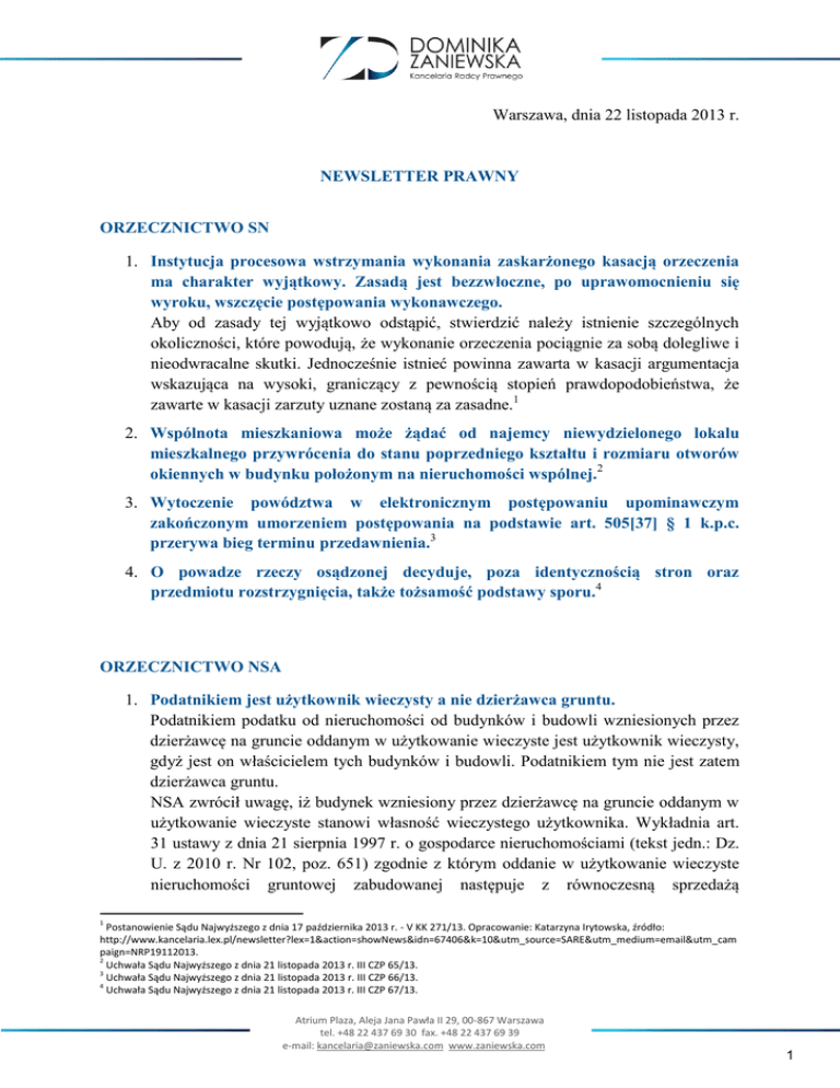 Dominika Zaniewska Kancelaria Radcy Prawnego Warszawa, dnia 22 listopada 2013 r. NEWSLETTER PRAWNY ORZECZNICTWO SN 1. Instytucja procesowa wstrzymania wykonania zaskarżonego kasacją orzeczenia ma charakter wyjątkowy. Zasadą jest bezzwłoczne, po uprawomocnieniu się wyroku, wszczęcie postępowania wykonawczego. Aby od zasady tej wyjątkowo odstąpić, stwierdzić należy istnienie szczególnych okoliczności, które powodują, że wykonanie orzeczenia pociągnie za sobą dolegliwe i nieodwracalne skutki. Jednocześnie istnieć powinna zawarta w kasacji argumentacja wskazująca na wysoki, graniczący z pewnością stopień prawdopodobieństwa, że zawarte w kasacji zarzuty uznane zostaną za zasadne.1 2. Wspólnota mieszkaniowa może żądać od najemcy niewydzielonego lokalu mieszkalnego przywrócenia do stanu poprzedniego kształtu i rozmiaru otworów okiennych w budynku położonym na nieruchomości wspólnej.2 3. Wytoczenie powództwa w elektronicznym postępowaniu upominawczym zakończonym umorzeniem postępowania na podstawie art. 505[37] § 1 k.p.c. przerywa bieg terminu przedawnienia.3 4. O powadze rzeczy osądzonej decyduje, poza identycznością stron oraz przedmiotu rozstrzygnięcia, także tożsamość podstawy sporu.4 ORZECZNICTWO NSA 1. Podatnikiem jest użytkownik wieczysty a nie dzierżawca gruntu. Podatnikiem podatku od nieruchomości od budynków i budowli wzniesionych przez dzierżawcę na gruncie oddanym w użytkowanie wieczyste jest użytkownik wieczysty, gdyż jest on właścicielem tych budynków i budowli. Podatnikiem tym nie jest zatem dzierżawca gruntu. NSA zwrócił uwagę, iż budynek wzniesiony przez dzierżawcę na gruncie oddanym w użytkowanie wieczyste stanowi własność wieczystego użytkownika. Wykładnia art. 31 ustawy z dnia 21 sierpnia 1997 r. o gospodarce nieruchomościami (tekst jedn.: Dz. U. z 2010 r. Nr 102, poz. 651) zgodnie z którym oddanie w użytkowanie wieczyste nieruchomości gruntowej zabudowanej następuje z równoczesną sprzedażą 1 Postanowienie Sądu Najwyższego z dnia 17 października 2013 r. - V KK 271/13. Opracowanie: Katarzyna Irytowska, źródło: http://www.kancelaria.lex.pl/newsletter?lex=1&action=showNews&idn=67406&k=10&utm_source=SARE&utm_medium=email&utm_cam paign=NRP19112013. 2 Uchwała Sądu Najwyższego z dnia 21 listopada 2013 r. III CZP 65/13. 3 Uchwała Sądu Najwyższego z dnia 21 listopada 2013 r. III CZP 66/13. 4 Uchwała Sądu Najwyższego z dnia 21 listopada 2013 r. III CZP 67/13. Atrium Plaza, Aleja Jana Pawła II 29, 00-867 Warszawa tel. +48 22 437 69 30 fax. +48 22 437 69 39 e-mail: [email protected] www.zaniewska.com 1 Dominika Zaniewska Kancelaria Radcy Prawnego położonych na tej nieruchomości budynków i innych urządzeń, oraz art. 235 k.c. przemawia za poglądem, że wszystkie przypadki wzniesienia budynku na gruncie oddanym w użytkowanie wieczyste powinny być w kontekście art. 235 § 1 k.c. oceniane tak, jakby wzniesienia dokonał sam użytkownik wieczysty.5 2. Nie wolno narzucać inwestorom kupna całego terenu inwestycji. Prawo budowlane dopuszcza sytuację, gdy inwestor nie wykupuje całości gruntów pozwalających na realizację pełnego zamierzenia już przy pierwszym etapie budowy orzekł NSA. - Dzięki temu zmniejsza wydatki na prace projektowe. Zdaniem NSA dołączenie do wniosku o pozwolenie na budowę oświadczenia o posiadanym prawie do dysponowania nieruchomością na cele budowlane na pierwszym etapie budowy nie jest konieczne. Ustawodawca celowo wprowadził etapowanie inwestycji, aby nie narażać inwestora na nadmierne ryzyko. Planowanie inwestycji w całości może bowiem stanowić przeszkodę w rozwoju budownictwa podkreślił sędzia Roman Hauser. Inwestor może się więc ograniczyć do przedstawienia własności terenu, na którym bezpośrednio wykonuje budowę. Wykupywanie działek okolicznych nie jest potrzebne, jeśli budowa znajduje się na wstępnym etapie. Celem ustawy było bowiem ułatwienie procesu inwestycyjnego poprzez wprowadzenie etapów.6 ZMIANY W PRAWIE 1. Od 21 listopada br. można korzystać z rozwiązań drugiej ustawy antykryzysowej. Od tego dnia obowiązuje bowiem nowa ustawa o szczególnych rozwiązaniach związanych z ochroną miejsc pracy. Od tej daty pracodawcy będą mogli ubiegać się o: dopłaty do wynagrodzeń pracowników podczas przestoju ekonomicznego, dodatkowe środki na szkolenia oraz na opłacenie składek na ubezpieczenia społeczne pracowników. Nie dotyczy to jednak wszystkich pracodawców, a jedynie tych, którzy wykażą spadek obrotów w ciągu 6 kolejnych miesięcy. dopłaty do wynagrodzeń pracowników podczas przestoju ekonomicznego Z dobrodziejstw ustawy będą mogli skorzystać przedsiębiorcy, u których nastąpił spadek obrotów łącznie nie mniejszy niż 15 proc. w ciągu 6 kolejnych miesięcy w roku. Dofinansowanie do wynagrodzenia pracownika, o które może ubiegać się pracodawca, może wynosić do 1,1 tys. zł. i będzie wypłacane ze środków Funduszu Gwarantowanych Świadczeń Pracowniczych. Takie wsparcie może trwać 5 6 Wyrok NSA z 24 lipca 2013 r., sygn. akt II FSK 937/13. Opublikowano: www.budownictwo.ABC.com.pl. Sygn. akt II OSK 2180/12. Źródło: Katarzyna Żaczkiewicz-Zborska, http://lex.online.wolterskluwer.pl/WKPLOnline/index.rpc?. Atrium Plaza, Aleja Jana Pawła II 29, 00-867 Warszawa tel. +48 22 437 69 30 fax. +48 22 437 69 39 e-mail: [email protected] www.zaniewska.com 2 Dominika Zaniewska Kancelaria Radcy Prawnego maksymalnie 6 miesięcy w okresie 12 miesięcy od dnia podpisania umowy o dofinansowanie. W przypadku przejściowych trudności pracodawca będzie mógł obniżyć wymiar czasu pracy pracownika, nawet do połowy etatu, ale tylko przez maksymalnie 6 miesięcy. Pracownik, któremu obniżono wymiar czasu pracy, ma zagwarantowane co najmniej minimalne wynagrodzenie. Aby wprowadzić te rozwiązania będzie trzeba podpisać układ zbiorowy lub porozumienie ze związkami zawodowymi, a w przypa