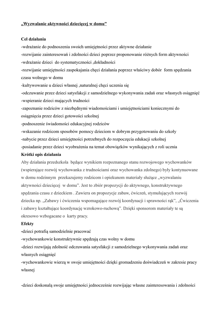 „Wyzwalanie aktywności dziecięcej w domu” Cel działania -wdrażanie do podnoszenia swoich umiejętności przez aktywne działanie -rozwijanie zainteresowań i zdolności dzieci poprzez proponowanie różnych form aktywności -wdrażanie dzieci do systematyczności ,dokładności -rozwijanie umiejętności zaspokajania chęci działania poprzez właściwy dobór form spędzania czasu wolnego w domu -kultywowanie u dzieci własnej ,naturalnej chęci uczenia się -odczuwanie przez dzieci satysfakcji z samodzielnego wykonywania zadań oraz własnych osiągnięć -wspieranie dzieci mających trudności -zapoznanie rodziców z niezbędnymi wiadomościami i umiejętnościami koniecznymi do osiągnięcia przez dzieci gotowości szkolnej -podnoszenie świadomości edukacyjnej rodziców -wskazanie rodzicom sposobów pomocy dzieciom w dobrym przygotowaniu do szkoły -nabycie przez dzieci umiejętności potrzebnych do rozpoczęcia edukacji szkolnej -posiadanie przez dzieci wyobrażenia na temat obowiązków wynikających z roli ucznia Krótki opis działania Aby działania przedszkola będące wynikiem rozpoznanego stanu rozwojowego wychowanków (wspierające rozwój wychowanka z trudnościami oraz wychowanka zdolnego) były kontynuowane w domu rodzinnym przekazujemy rodzicom i opiekunom materiały służące „wyzwalaniu aktywności dziecięcej w domu”. Jest to zbiór propozycji do aktywnego, konstruktywnego spędzania czasu z dzieckiem . Zawiera on propozycje zabaw, ćwiczeń, stymulujących rozwój dziecka np. „Zabawy i ćwiczenia wspomagające rozwój koordynacji i sprawności rąk”, „Ćwiczenia i zabawy kształtujące koordynację wzrokowo-ruchową”. Dzięki sponsorom materiały te są okresowo wzbogacane o karty pracy. Efekty -dzieci potrafią samodzielnie pracować -wychowankowie konstruktywnie spędzają czas wolny w domu -dzieci rozwijają zdolność odczuwania satysfakcji z samodzielnego wykonywania zadań oraz własnych osiągnięć -wychowankowie wierzą w swoje umiejętności dzięki gromadzeniu doświadczeń w zakresie pracy własnej -dzieci doskonalą swoje umiejętności jednocześnie rozwijając własne zainteresowania i zdolności - rodzice uczestniczą w procesie przygotowanie dziecka do rozpoczęcia edukacji szkolnej Rady i przestrogi Zabawy, ćwiczenia i zadania należy dobierać w taki sposób, aby czas pracy nie powodował znużenia dziecka. Należy uświadomić rodzicom, aby zawsze nagradzali zaangażowanie i wysiłek dzieci. Powyższa forma spędzania czasu wolnego jest wybierana przez dzieci nie narzucana przez dorosłego czy obowiązkowa. Rodzic pełni rolę przewodnika, to dzieci wybierają formę aktywności. Zabawy, zadania i ćwiczenia należy dostosować do możliwości dzieci. Sposoby upoważniania - strona internetowa -fora dyskusyjne dyrektorów