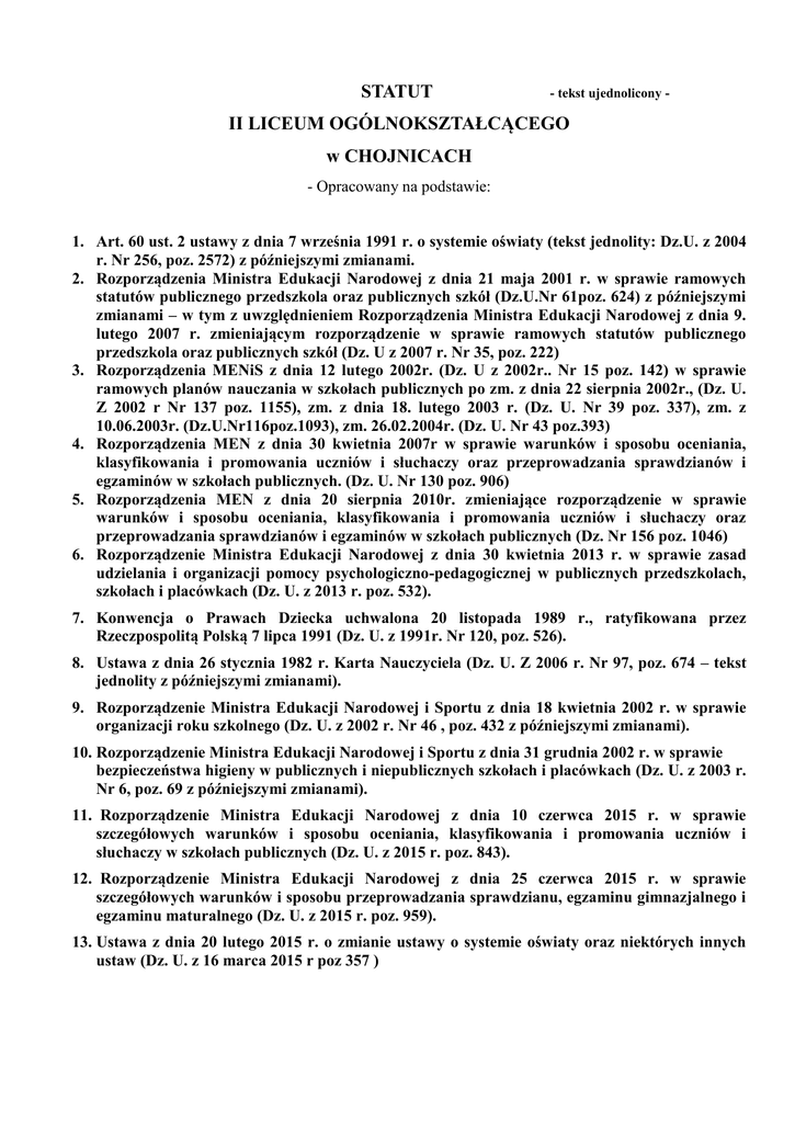STATUT - tekst ujednolicony - II LICEUM OGÓLNOKSZTAŁCĄCEGO w CHOJNICACH - Opracowany na podstawie: 1. Art. 60 ust. 2 ustawy z dnia 7 września 1991 r. o systemie oświaty (tekst jednolity: Dz.U. z 2004 r. Nr 256, poz. 2572) z późniejszymi zmianami. 2. Rozporządzenia Ministra Edukacji Narodowej z dnia 21 maja 2001 r. w sprawie ramowych statutów publicznego przedszkola oraz publicznych szkół (Dz.U.Nr 61poz. 624) z późniejszymi zmianami – w tym z uwzględnieniem Rozporządzenia Ministra Edukacji Narodowej z dnia 9. lutego 2007 r. zmieniającym rozporządzenie w sprawie ramowych statutów publicznego przedszkola oraz publicznych szkół (Dz. U z 2007 r. Nr 35, poz. 222) 3. Rozporządzenia MENiS z dnia 12 lutego 2002r. (Dz. U z 2002r.. Nr 15 poz. 142) w sprawie ramowych planów nauczania w szkołach publicznych po zm. z dnia 22 sierpnia 2002r., (Dz. U. Z 2002 r Nr 137 poz. 1155), zm. z dnia 18. lutego 2003 r. (Dz. U. Nr 39 poz. 337), zm. z 10.06.2003r. (Dz.U.Nr116poz.1093), zm. 26.02.2004r. (Dz. U. Nr 43 poz.393) 4. Rozporządzenia MEN z dnia 30 kwietnia 2007r w sprawie warunków i sposobu oceniania, klasyfikowania i promowania uczniów i słuchaczy oraz przeprowadzania sprawdzianów i egzaminów w szkołach publicznych. (Dz. U. Nr 130 poz. 906) 5. Rozporządzenia MEN z dnia 20 sierpnia 2010r. zmieniające rozporządzenie w sprawie warunków i sposobu oceniania, klasyfikowania i promowania uczniów i słuchaczy oraz przeprowadzania sprawdzianów i egzaminów w szkołach publicznych (Dz. Nr 156 poz. 1046) 6. Rozporządzenie Ministra Edukacji Narodowej z dnia 30 kwietnia 2013 r. w sprawie zasad udzielania i organizacji pomocy psychologiczno-pedagogicznej w publicznych przedszkolach, szkołach i placówkach (Dz. U. z 2013 r. poz. 532). 7. Konwencja o Prawach Dziecka uchwalona 20 listopada 1989 r., ratyfikowana przez Rzeczpospolitą Polską 7 lipca 1991 (Dz. U. z 1991r. Nr 120, poz. 526). 8. Ustawa z dnia 26 stycznia 1982 r. Karta Nauczyciela (Dz. U. Z 2006 r. Nr 97, poz. 674 – tekst jednolity z późniejszymi zmianami). 9. Rozporządzenie Ministra Edukacji Narodowej i Sportu z dnia 18 kwietnia 2002 r. w sprawie organizacji roku szkolnego (Dz. U. z 2002 r. Nr 46 , poz. 432 z późniejszymi zmianami). 10. Rozporządzenie Ministra Edukacji Narodowej i Sportu z dnia 31 grudnia 2002 r. w sprawie bezpieczeństwa higieny w publicznych i niepublicznych szkołach i placówkach (Dz. U. z 2003 r. Nr 6, poz. 69 z późniejszymi zmianami). 11. Rozporządzenie Ministra Edukacji Narodowej z dnia 10 czerwca 2015 r. w sprawie szczegółowych warunków i sposobu oceniania, klasyfikowania i promowania uczniów i słuchaczy w szkołach publicznych (Dz. U. z 2015 r. poz. 843). 12. Rozporządzenie Ministra Edukacji Narodowej z dnia 25 czerwca 2015 r. w sprawie szczegółowych warunków i sposobu przeprowadzania sprawdzianu, egzaminu gimnazjalnego i egzaminu maturalnego (Dz. U. z 2015 r. poz. 959). 13. Ustawa z dnia 20 lutego 2015 r. o zmianie ustawy o systemie oświaty oraz niektórych innych ustaw (Dz. U. z 16 marca 2015 r poz 357 ) NAZWA I TYP SZKOŁY §1 1. Szkoła nosi nazwę: II Liceum Ogólnokształcące im. gen. Władysława Andersa w Chojnicach i posiada własny sztandar. 2. II LO jest szkołą publiczną, organem prowadzącym jest Samorząd Powiatowy, organem sprawującym nadzór pedagogiczny jest Kuratorium Oświaty w Gdańsku. 3. II LO jest szkołą opartą na podbudowie programowej gimnazjum i realizuje trzyletni cykl kształcenia. Szkoła zapewnia realizację programów nauczania objętych planem nauczania. Szkoła przyjmuje na siebie obowiązek rzetelnego kształcenia przynajmniej w ramach obowiązującej podstawy programowej kształcenia ogólnego. 4. II LO umożliwia naukę w klasie o nachyleniu zgodnym z zainteresowaniami ucznia. 5. Zajęcia lekcyjne prowadzone są w systemie dziennym jednozmianowym w godz.8.00 – 14.55. 6. Siedzibą szkoły jest część budynku przy ul. Świętopełka 1, gdzie mieści się 16 sal lekcyjnych, sala do ćwiczeń, pracownia komputerowa, biblioteka połączona z czytelnią multimedialną, gabinet dyrektora szkoły, gabinet wicedyrektora, gabinet pedagoga szkolnego, biuro księgowej, sekretariat, archiwum, pokój nauczycielski, gabinet medycyny szkolnej, pomieszczenia dla pracowników obsługi szkolnej, sklepik szkolny, pokój pracy dla nauczycieli, świetlica. 7. Zajęcia prowadzone są w budynku II LO oraz w budynku Centrum Kształcenia Ustawicznego przy ul. Świętopełka 3, oddalonym od głównej siedziby szkoły o ok. 200 m. Zajęcia z wychowania fizycznego prowadzone są w obiektach sportowych Centrum Park Chojnice położonych przy ul. H. Wagnera w Chojnicach, na stadionie „Kolejarz”, „Chojniczanki” oraz w małej sali w budynku szkoły i na własnym przyszkolnym boisku. 8. Szkoła prowadzi i przechowuje dokumentację zgodnie z obowiązującymi przepisami i własnym regulaminem dokumentowania pracy nauczyciela-stanowiącym odrębny dokument szkolny. 9. Szkoła współpracuje z Chojnickim Centrum Kultury w sprawach związanych z edukacją kulturalną młodzieży i organizacją imprez szkolnych wymagających dużej sali widowiskowej. 10. Szkoła może być sponsorowana przez urzędy, fundacje, stowarzyszenia i osoby prywatne. 11. Szkoła działa na podstawie ustaw i przepisów prawa oświatowego, własnego statutu oraz regulaminów uchwalanych przez różne organa szkoły. W szkole obowiązują wszelkie przepisy prawa dotyczące bezpieczeństwa i higieny pracy w placówkach edukacyjnych. 12. W celu zapewnienia bezpiecznych warunków nauki, wychowania i opieki obejmuje się częściowo budynek szkoły i teren szkolny nadzorem kamer CCTV. Zasady korzystania z monitoringu określa program wychowawczy szkoły. CELE I ZADANIA LICEUM §2 1. Szkoła realizuje cele i zadania wynikające z ustawy o systemie oświaty, przepisów wykonawczych oraz koncepcji pracy szkoły, a w szczególności umożliwia zdobycie wiedzy i umiejętności niezbędnych do uzy