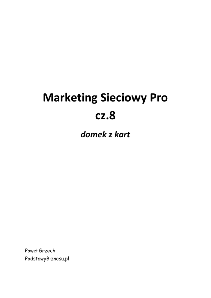 Marketing Sieciowy Pro cz.8 domek z kart Paweł Grzech PodstawyBiznesu.pl UWAGA: Nie masz praw do przedruku i odsprzedaży tego ebooka! Nie możesz także dawać komukolwiek i w jakikolwiek sposób treści tutaj zawartych. Niniejsza publikacja, ani żadna jej część, nie może być kopiowana, reprodukowana, powielana ani odczytywana w środkach publicznego przekazu bez pisemnej zgody Wydawcy. Zabrania się jej publicznego udostępniania w Internecie oraz odsprzedaży. W tym rozdziale zrobimy sobie krótką przerwę. Do tej pory omówiliśmy kilka bardzo ważnych tematów. Dlatego uważam, że teraz przyszedł czas, aby trochę zwolnić i jeszcze raz omówić System Marketingowy. Niestety w większości tych automatycznych systemów, które są obecnie oferowane w różnych formach, zapomina się przeważnie o jednej bardzo istotnej rzeczy. Jak już wspominałem, wydaje się, że w świecie online marketingu pojęcie „sprzedaż” i „sprzedawać” jest odbierane jako brzydkie słowo. W innym wypadku nikt nie pisałby na stronach WWW oraz w reklamach dla w pełni zautomatyzowanych systemów ogłoszeń typu: „Nie jesteś sprzedawcą tylko Liderem”, „Nic nie trzeba sprzedawać”, „Nie musisz odbierać telefonów, aby budować swój biznes, itp. – a przecież sprzedaż to coś pięknego ! Zignorowałbym te głupoty, gdyby nie fakt, że bardzo dużo osób się na to nabiera. Faktem jest, że w dzisiejszych czasach jest dokładnie na odwrót: Interakcja z drugą osobą nie jest tylko ważna, ale jest wręcz niezbędna ! Im bardziej nasz świat jest napędzany przez nowoczesną technologię (zachowujemy się jak zautomatyzowane roboty i jesteśmy otoczeni przez bezosobowe media jak np. Internet), tym bardziej tęsknimy za kontaktem z ludźmi. Szczególnie w dobie Internetu i automatyzacji, ludzie szukają możliwości kontaktu z innymi. Na pewno chcesz kupować od osób, z którymi możesz porozmawiać i którym ufasz – a nie od komputerów lub jakiś systemów. Również Twoi czytelnicy chcą czuć, że podjęli właściwą decyzję. I dlatego szukają wiarygodności – Ekspertów, którym można zaufać i od których można oczekiwać odpowiedzi na pytania. Zapewne już zauważyłeś, że bardzo często pojawia się współczynnik wiarygodności. On jest tak naprawdę jednym z powodów, dlaczego komunikacja osobista jest tak ważna – pomaga przezwyciężyć wątpliwości i wyeliminować strach. Zatem, czy jest to możliwe, aby wybudować dużą organizację bez kontaktu osobistego? Oczywiście, że tak. Dobrze skonstruowany System Marketingowy jest w pełni zdolny przeprowadzić klienta na skali zainteresowania od 1 poziomu do 10 – i to bez osobistego kontaktu z daną osobą. Ale jednej (bardzo ważnej) rzeczy nie uda Ci się w taki sposób zrealizować – Stabilizacji. Na pewnym etapie (obojętnie, czy przed, czy po przystąpieniu danej osoby do Twojego biznesu), musisz się z tą osobą skontaktować, aby zbudować pozytywne relacje. Jeśli przeoczysz ten bardzo ważny aspekt Twojego biznesu, to ludzie zaczną rezygnować ze współpracy z Tobą w bardzo szybkim tempie. Nie masz innego wyjścia. Zresztą sam to przeżyłem i znam ludzi, którzy rezygnują z osobistego kontaktu i dlatego mają cały czas ten sam problem: bardzo dużo osób po prostu rezygnuje. W taki sposób nigdy nie będziesz wstanie zbudować stabilnego biznesu. Biznes budowany bez relacji międzyludzkich, jest niestety jak zamek zbudowany na piasku – pozbawiony solidnych fundamentów. Podobnie jak domek z kart – wystarczy tylko lekki podmuch wiatru i wszystko zostanie zniszczone. Naprawdę chcesz, aby Twój biznes np. po 2 latach ciężkiej pracy rozpadł się na małe kawałki? Tylko dlatego, że nie chciałeś porozmawiać z ludźmi ze struktury? Jeśli chcesz postawić mocne i trwałe fundamenty pod swój biznes, to musisz wykształcić liderów (5 poważnych osób), którzy będą w stosunku do Ciebie lojalni. Ale to osiągniesz tylko i wyłącznie wtedy, gdy będziecie utrzymywać kontakt. Dobry system marketingowy bardzo Ci pomoże, ale nigdy Cię nie zastąpi. Sprawi, że Twoja praca będzie łatwiejsza i przyjemniejsza… poprawi Twoje wyniki, ale nie możesz tylko i wyłącznie na nim polegać. Rozejrzyj się po Internecie. Na pewno znajdziesz niejedną stronę, której właściciel korzysta z całkowicie automatycznego systemu, gdzie nic już nie musisz robić. Super sprawa, nie? Takie osoby wypisują później na swoich stronach takie rzeczy jak: „Zero Sprzedaży!” „Żadnych telefonów!” „Nic nie musisz robić – my się wszystkim zajmiemy!” „Inwestując zaledwie XYZ złotych wybudujesz sobie 6cyfrowy biznes!” „System darmowego zarabiania!” „Biznes w 4 dni!” Pewnego razu jakaś osoba (nazwijmy ją panem X), która dołączyła się właśnie do podobnego biznesu napisała do mojego znajomego, aby pomógł mu stworzyć program do nauki sprzedaży i rozmowy przez telefon. Zapewne domyślasz się już jak duże było zdziwienie mojego kolegi… przecież na stronie pana X wyraźnie pisze, że nie trzeba niczego sprzedawać. Dlatego mój kolega odpisał mu coś takiego: „Jestem trochę zdziwiony… do czego jestem Ci właściwie potrzebny?” Pan X: „No cóż… jeśli nie będziemy budować relacji z naszymi ludźmi, to zaczną niestety masowo rezygnować z biznesu.” Mój kolega: „To jest oczywiste, ale mimo wszystko jestem bardzo zdziwiony: przecież napisałeś na swojej stronie, że nie trzeba z nikim rozmawiać, ponieważ system sam się wszystkim zajmie… chyba, że źle to zrozumiałem?” Pan X: „Daj spokój. Przecież dokładnie wiemy, że to jest tylko taki chwyt marketingowy.” I później opowiedział, że jest świadomy tego, że nie mówi ludziom całej prawdy… ponieważ nie da się zbudować biznesu bez osobistego kontaktu. Oczywiście mój kolega postanowił mu nie pomagać – i bardzo dobrze! Grzecznie mu podziękował i powiedzi