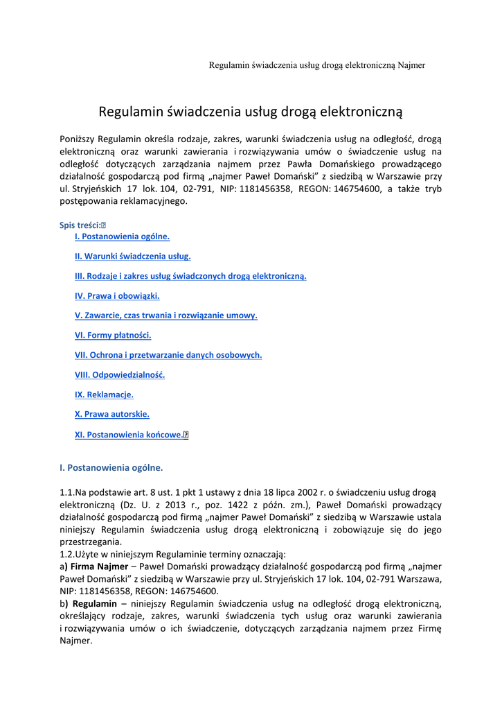 Regulamin świadczenia usług drogą elektroniczną Najmer Regulamin świadczenia usług drogą elektroniczną Poniższy Regulamin określa rodzaje, zakres, warunki świadczenia usług na odległość, drogą elektroniczną oraz warunki zawierania i rozwiązywania umów o świadczenie usług na odległość dotyczących zarządzania najmem przez Pawła Domańskiego prowadzącego działalność gospodarczą pod firmą „najmer Paweł Domański” z siedzibą w Warszawie przy ul. Stryjeńskich 17 lok. 104, 02-791, NIP: 1181456358, REGON: 146754600, a także tryb postępowania reklamacyjnego. I. Postanowienia ogólne. II. Warunki świadczenia usług. III. Rodzaje i zakres usług świadczonych drogą elektroniczną. IV. Prawa i obowiązki. V. Zawarcie, czas trwania i rozwiązanie umowy. VI. Formy płatności. VII. Ochrona i przetwarzanie danych osobowych. VIII. Odpowiedzialność. IX. Reklamacje. X. Prawa autorskie. XI. Postanowienia końcowe. I. Postanowienia ogólne. 1.1.Na podstawie art. 8 ust. 1 pkt 1 ustawy z dnia 18 lipca 2002 r. o świadczeniu usług drogą elektroniczną (Dz. U. z 2013 r., poz. 1422 z późn. zm.), Paweł Domański prowadzący działalność gospodarczą pod firmą „najmer Paweł Domański” z siedzibą w Warszawie ustala niniejszy Regulamin świadczenia usług drogą elektroniczną i zobowiązuje się do jego przestrzegania. 1.2.Użyte w niniejszym Regulaminie terminy oznaczają: a) Firma Najmer – Paweł Domański prowadzący działalność gospodarczą pod firmą „najmer Paweł Domański” z siedzibą w Warszawie przy ul. Stryjeńskich 17 lok. 104, 02-791 Warszawa, NIP: 1181456358, REGON: 146754600. b) Regulamin – niniejszy Regulamin świadczenia usług na odległość drogą elektroniczną, określający rodzaje, zakres, warunki świadczenia tych usług oraz warunki zawierania i rozwiązywania umów o ich świadczenie, dotyczących zarządzania najmem przez Firmę Najmer. Regulamin świadczenia usług drogą elektroniczną Najmer c) Serwis – serwis internetowy dostępny pod adresem URL: http://www.najmer.pl , którego właścicielem, administratorem oraz operatorem jest Firma Najmer. d) Klient/Usługobiorca – każda osoba będąca Konsumentem, która wyraziła zgodę na przetwarzanie danych osobowych przez Firmę Najmer oraz wolę uzyskania informacji na temat oferty Firmy Najmer (zwłaszcza za pośrednictwem formularza kontaktowego dostępnego pod adresem URL: http://www.najmer.pl), a także każda osoba która wyraziła wolę zawarcia lub zawarła Umowę z Firmą Najmer. e) Umowa – umowa o świadczenie usług na odległość dotyczących zarządzania najmem, zawierana na zasadach określonych w niniejszym Regulaminie, pomiędzy Usługobiorcą, a Firmą Najmer, w postaci elektronicznej, przewidziana w dwóch wariantach: „Plan JEDEN LOKAL +” oraz „Plan TRZY LOKALE +”, na czas nieoznaczony. f) Treści – wszelkie pochodzące od Firmy Najmer informacje, dane, treści, elementy, materiały, algorytmy, schematy, utwory, oznaczenia, loga, nazwy, znaki, symbole, opisy i zdjęcia, niezależnie od ich charakteru, formatu i sposobu zapisu lub przedstawienia. g) Usługi Wstępne – usługi świadczone przez Firmę Najmer, związane z procesem zapoznania się z ofertą handlową Firmy Najmer, procesem zawarcia Umowy oraz działaniami prowadzącymi do jej zawarcia. h) Usługi Właściwe – usługi świadczone przez Firmę Najmer na podstawie zawartej przez Firmę Najmer Umowy z Konsumentem w jednym z dwóch wariantów cenowych. i) Kodeks cywilny – Ustawa z dnia 23 kwietnia 1964 r. – Kodeks cywilny. j) Konsument – konsument w rozumieniu art. 22 Kodeksu cywilnego. k)Formularz Kontaktowy – formularz znajdujący się pod adresem URL: http://www.najmer.pl, służący do kontaktowania się z Firmą Najmer, w którym Usługobiorcy Serwisu będący Konsumentami lub działający w imieniu i na rzecz Konsumentów nieodpłatnie zamieszczają niezbędne dane w celu uzyskania oferty Firmy Najmer lub w celu skontaktowania się z Firmą Najmer w innej sprawie. 1.3. Regulamin jest nieodpłatnie udostępniany Usługobiorcom pod adresem URL: http://www.najmer.pl/regulaminy w formie umożliwiającej jego pobranie, utrwalenie oraz wydrukowanie. 1.4.Rozpoczęcie korzystania z usług objętych Regulaminem jest równoznaczne z zapoznaniem się z jego treścią i pełną akceptacją jego warunków. 1.5. Każdy Usługobiorca zobowiązany jest do przestrzegania postanowień Regulaminu od chwili rozpoczęcia korzystania z usług firmy Najmer. 1 II. Warunki świadczenia usług. 2.1.Usługi Wstępne świadczone Usługobiorcy przez Firmę Najmer są bezpłatne. 2.2.Możliwość korzystania z usług, a zwłaszcza z Usług Właściwych świadczonych przez Firmę Najmer posiadają wyłącznie osoby fizyczne spełniające poniższe warunki: a) są Konsumentami, b) posiadają pełną zdolność do czynności prawnych, c) są właścicielami lokalu przeznaczonego do celów mieszkaniowych, posiadają spółdzielcze własnościowe prawo do lokalu mieszkalnego lub inny tytuł do lokalu przeznaczonego do celów mieszkaniowych, uprawniający ich do wynajmowania tegoż lokalu na cele mieszkaniowe. Regulamin świadczenia usług drogą elektroniczną Najmer 2.3.W celu zapewnienia możliwości świadczenia Usług Wstępnych oraz Usług Właściwych przez Firmę Najmer konieczne jest: a) urządzenie końcowe posiadające dostęp do sieci Internet, b) zainstalowana na urządzeniu końcowym aktualna wersja przeglądarki internetowej Google Chrome lub Mozilla Firefox lub Microsoft Edge lub Safari z włączoną funkcją Cookies, c) zainstalowany na urządzeniu końcowym program Acrobat Reader lub inny program obsługujący pliki w formacie PDF, d) posiadanie przez Usługobiorcę konta poczty e-mail oraz numeru telefonu, e) posiadanie przez Usługobiorcę konta w systemie PayPal oraz karty płatniczej. 2.4.W celu zapewnienia możliwości świadczenia Usług Wstępnych oraz Usług Właściwy
