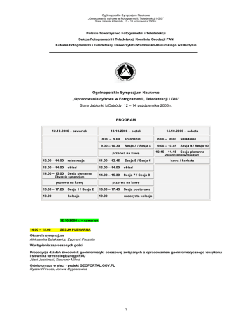 Ogólnopolskie Sympozjum Naukowe „Opracowania cyfrowe w Fotogrametrii, Teledetekcji i GIS” Stare Jabłonki k/Ostródy, 12 – 14 października 2006 r. Polskie Towarzystwo Fotogrametrii i Teledetekcji Sekcja Fotogrametrii i Teledetekcji Komitetu Geodezji PAN Katedra Fotogrametrii i Teledetekcji Uniwersytetu Warmińsko-Mazurskiego w Olsztynie Ogólnopolskie Sympozjum Naukowe „Opracowania cyfrowe w Fotogrametrii, Teledetekcji i GIS” Stare Jabłonki k/Ostródy, 12 – 14 października 2006 r. PROGRAM 12.10.2006 – czwartek 13.10.2006 – piątek 8.00 – 9.00 śniadanie 8.00 – 9.00 śniadanie 9.00 – 10.30 Sesja 3 / Sesja 4 9.00 – 10.45 Sesja 9 / Sesja 10 przerwa na kawę 12.00 – 14.00 rejestracja 11.00 – 12.45 Sesja 5 / Sesja 6 13.00 – 14.00 obiad 13.00 – 14.00 obiad 14.00 – 15.00 Sesja plenarna 14.00 – 15.30 Sesja 7 / Sesja 8 Otwarcie sympozjum 14.10.2006 – sobota przerwa na kawę 10.45 – 11.15 Sesja plenarna Zakończenie sympozjum kawa / herbata przerwa na kawę 15.30 – 17.20 Sesja 1 / Sesja 2 16.00 – 17.45 Sesja posterowa 18.00 kolacja 19.00 uroczysta kolacja 12.10.2006 r. – czwartek 14.00 – 15.00 SESJA PLENARNA Otwarcie sympozjum Aleksandra Bujakiewicz, Zygmunt Paszotta Wystąpienia zaproszonych gości Propozycja działań środowisk geoinformatyki obrazowej związanych z opracowaniem geoinformatycznego leksykonu i słownika terminologicznego PAU Józef Jachimski, Sławomir Mikrut Ortofotomapa w sieci - projekt GEOPORTAL.GOV.PL Ryszard Preuss, Janusz Dygaszewicz 1 Ogólnopolskie Sympozjum Naukowe „Opracowania cyfrowe w Fotogrametrii, Teledetekcji i GIS” Stare Jabłonki k/Ostródy, 12 – 14 października 2006 r. 12.10.2006 r. – czwartek 15.30 – 17.20 SESJA 1 – WYBRANE ROZWIĄZANIA FOTOGRAMETRYCZNE Problem automatycznego pomiaru znaczków tłowych na zdjęciach lotniczych Tomasz Chwastek , Sławomir Mikrut Przedwyrównawcze wykrywanie błędów grubych w pomiarze środków rzutu dla aerotriangulacji Jan Ziobro Skuteczność dodatkowych parametrów wyrównania w aerotriangulacji Jan Ziobro Próba podniesienia wartości informacyjnej cyfrowych ortofotomap Ryszard Preuss, Wiesław Wolniewicz, Sebastian RóŜycki Fotogrametryczne aplikacje z wykorzystaniem przeglądarki internetowej Zygmunt Paszotta Nadzorowana detekcja tras komunikacyjnych z wykorzystaniem metod uczenia maszynowego Krzysztof Krawiec, Ireneusz Wyczałek 15.30 – 17.20 SESJA 2 – LOTNICZY SKANING LASEROWY Kamera cyfrowa Leica ADS40, skaner laserowy Leica ALS50 – doświadczenia produkcyjne Sławomir Boczar, Rafał Dąbrowski, Witold Fedorowicz-Jackowski, Jacek Zych Filtracja danych lotniczego skaningu laserowego z wykorzystaniem wielomianowych powierzchni ruchomych Andrzej Borkowski, Grzegorz Jóźków Wykorzystanie danych lotniczego skaningu laserowego do nadzorowanej klasyfikacji pokrycia terenu dla potrzeb modelowania hydrodynamicznego Przemysław Tymków, Andrzej Borkowski Wykorzystanie danych lotniczego skaningu laserowego jako osnowy geometrycznej dla korekcji obrazów QuickBird Wieslaw Wolniewicz, Marek Zaremba Generowanie NMT i NMPT obszarów z pokrywą roślinną na podstawie danych lidarowych Sławomir Mikrut, Urszula Marmol, Krzysztof Będkowski Skanowanie laserowe jako źródło informacji przestrzennych dotyczących lasów Krzysztof Będkowski, Sławomir Mikrut 13.10.2006 r. – piątek 9.00 – 10.30 SESJA 3 – FOTOGRAMETRIA SATELITARNA (1) Wpływ ilości fotopunktów i dokładności numerycznego modelu wysokościowego na dokładność wysokorozdzielczej ortofotomapy satelitarnej Wojciech Drzewiecki, Ewa Głowienka, Beata Hejmanowska, Marcin DŜugaj, Tomasz Trybuś Wpływ jakości numerycznego modelu terenu na wynik ortorektyfikacji wysokorozdzielczych obrazów satelitarnych IKONOS-2 Piotr WęŜyk, Krystian Pyka, Ireneusz Jędrychowski Orientacja obrazów stereo IKONOS oraz automatyczny pomiar modeli wysokościowych Piotr Koza Wysokorozdzielcze obrazy satelitarne jako źródło opracowania danych wektorowych w standardzie TBD Zdzisław Kurczyński, Wiesław Wolniewicz 9.00 – 10.30 SESJA 4 – FOTOGRAMETRIA BLISKIEGO ZASIĘGU (1) Analiza przydatności algorytmów detekcji krawędzi w zastosowaniach fotogrametrii bliskiego zasięgu Anna Czechowicz, Sławomir Mikrut Zastosowanie metod analizy obrazów w trójwymiarowym pozycjonowaniu ciała pacjenta Robert Koprowski, Regina Tokarczyk, Zygmunt Wróbel Własności wybranych typów sieci neuronowych wykorzystywanych do detekcji połoŜenia oczu pacjenta Robert Koprowski, Zygmunt Wróbel Wykrywanie sygnalizowanych punktów na obrazach cyfrowych bliskiego zasięgu z wykorzystaniem analiz typu GIS Władysław Mierzwa 2 Ogólnopolskie Sympozjum Naukowe „Opracowania cyfrowe w Fotogrametrii, Teledetekcji i GIS” Stare Jabłonki k/Ostródy, 12 – 14 października 2006 r. 13.10.2006 r. – piątek 11.00 – 12.45 SESJA 5 – FOTOGRAMETRIA SATELITARNA (2) Analiza moŜliwości wykorzystania zobrazowań z Cartosat-1 w opracowaniach fotogrametrycznych i kartograficznych Rafał Dąbrowski, Witold Fedorowicz-Jackowski, Michał Kędzierski, Piotr Walczykowski, Jacek Zych Ocena dokładności generowania NMP z wykorzystaniem Cartosat-1 Rafał Dąbrowski, Michał Kędzierski, Sebastian RóŜycki, Piotr Walczykowski,Wiesław Wolniewicz, Jacek Zych Metodyka generowania numerycznego modelu terenu na podstawie rosyjskich stereoskopowych zobrazowań TK-350 Ireneusz Ewiak Ocena dokładności modelu SRTM na obszarze Polski Artur Karol Karwel, Ireneusz Ewiak Interpretacja danych Envisat/ASAR o przemiennej polaryzacji na obszarach zurbanizowanych w kontekście charakterystyki stabilnych rozpraszaczy (Persistent Scatterers) Zbigniew Perski, Gini Ketelaar, Marek Mróz 11.00 – 12.30 SESJA 6 – FOTOGRAMETRIA BLISKIEGO ZASIĘGU (2) Fotogrametryczny pomiar powierzchni przełamań części rzeźb archeologicznych w celu ich wzajemnego dopasowania Aleksandra Bujakiewicz, Michał Kowalczyk, Piotr Podlasiak,Dorota Zawieska, ElŜbieta Andrzejews