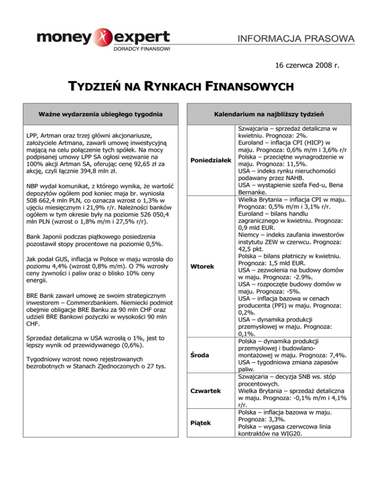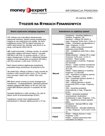 16 czerwca 2008 r. TYDZIEŃ NA RYNKACH FINANSOWYCH Kalendarium na najbliższy tydzień Ważne wydarzenia ubiegłego tygodnia LPP, Artman oraz trzej główni akcjonariusze, założyciele Artmana, zawarli umowę inwestycyjną mającą na celu połączenie tych spółek. Na mocy podpisanej umowy LPP SA ogłosi wezwanie na 100% akcji Artman SA, oferując cenę 92,65 zł za akcję, czyli łącznie 394,8 mln zł. Poniedziałek NBP wydał komunikat, z którego wynika, że wartość depozytów ogółem pod koniec maja br. wyniosła 508 662,4 mln PLN, co oznacza wzrost o 1,3% w ujęciu miesięcznym i 21,9% r/r. Należności banków ogółem w tym okresie były na poziomie 526 050,4 mln PLN (wzrost o 1,8% m/m i 27,5% r/r). Bank Japonii podczas piątkowego posiedzenia pozostawił stopy procentowe na poziomie 0,5%. Jak podał GUS, inflacja w Polsce w maju wzrosła do poziomu 4,4% (wzrost 0,8% m/m). O 7% wzrosły ceny żywności i paliw oraz o blisko 10% ceny energii. Wtorek BRE Bank zawarł umowę ze swoim strategicznym inwestorem – Commerzbankiem. Niemiecki podmiot obejmie obligacje BRE Banku za 90 mln CHF oraz udzieli BRE Bankowi pożyczki w wysokości 90 mln CHF. Sprzedaż detaliczna w USA wzrosłą o 1%, jest to lepszy wynik od przewidywanego (0,6%). Tygodniowy wzrost nowo rejestrowanych bezrobotnych w Stanach Zjednoczonych o 27 tys. Środa Czwartek Piątek Szwajcaria – sprzedaż detaliczna w kwietniu. Prognoza: 2%. Euroland – inflacja CPI (HICP) w maju. Prognoza: 0,6% m/m i 3,6% r/r Polska – przeciętne wynagrodzenie w maju. Prognoza: 11,5%. USA – indeks rynku nieruchomości podawany przez NAHB. USA – wystąpienie szefa Fed-u, Bena Bernanke. Wielka Brytania – inflacja CPI w maju. Prognoza: 0,5% m/m i 3,1% r/r. Euroland – bilans handlu zagranicznego w kwietniu. Prognoza: 0,9 mld EUR. Niemcy – indeks zaufania inwestorów instytutu ZEW w czerwcu. Prognoza: 42,5 pkt. Polska – bilans płatniczy w kwietniu. Prognoza: 1,5 mld EUR. USA – zezwolenia na budowy domów w maju. Prognoza: -2.9%. USA – rozpoczęte budowy domów w maju. Prognoza: -5%. USA – inflacja bazowa w cenach producenta (PPI) w maju. Prognoza: 0,2%. USA – dynamika produkcji przemysłowej w maju. Prognoza: 0,1%. Polska – dynamika produkcji przemysłowej i budowlanomontażowej w maju. Prognoza: 7,4%. USA – tygodniowa zmiana zapasów paliw. Szwajcaria – decyzja SNB ws. stóp procentowych. Wielka Brytania – sprzedaż detaliczna w maju. Prognoza: -0,1% m/m i 4,1% r/r. Polska – inflacja bazowa w maju. Prognoza: 3,3%. Polska – wygasa czerwcowa linia kontraktów na WIG20. Podsumowanie tygodnia – POLSKA Rynek akcji Ubiegły tydzień nie należał do zbyt udanych. Przez pierwsze trzy dni wszystkie indeksy traciły. W poniedziałek WIG20 spadł o blisko 2% do poziomu 2812 pkt. Podobnie jak w przypadku indeksu WIG była to reakcja na dużą, ponad 3-proc. przecenę indeksów z Wall Street. W gronie 20 największych spółek wyróżniło się tylko PGNiG, które zakończyło dzień z ponad dwuprocentowym wzrostem. Tego dnia można było zarobić na akcjach Vistuli (+6,26%), która dostała zielone światło od UOKiK na przejęcie walorów spółki W.Kruk. Wtorkowa sesja zakończyła się jeszcze większymi przecenami. Indeks najmniejszych spółek, sWIG80 zamknął dzień z ponad 3-proc. stratą. Podobne wyniki osiągnęły mWIG40, WIG20 oraz WIG. Gorzej wypadły tylko giełdy w Chinach, Hongkongu, Filipinach i Rumunii. W skali tego miesiąca WIG zniżkował już o 6,5 proc., a WIG20 o 6,3 proc. Te wyniki plasują nas w gronie kilku najsłabszych rynków na świecie. Niechlubnym liderem spadków w gronie blue chipów był Polimexs (-7,19%) oraz Agora (6,64%). W przypadku tej ostatniej spółki inwestorzy źle zareagowali na pomysł przejęcia WSiP-u. Zastanawiające są też blisko 5-proc. spadki Orlenu i KGHM. Wprawdzie mieliśmy niewielką korektę na rynku surowcowym, ale przecież te spółki przygotowują się do wypłaty dywidendy! Środowa sesja także zakończyła się spadkami, choć nie były one już tak silne jak podczas dwóch poprzednich sesji. WIG20 zanotował najniższy poziom od blisko dwóch lat (2672pkt). Dużą przecenę odnotował Getin (-7,02%). Nie lepiej wypadły walory pozostałych banków. Przy obrotach nieznacznie przekraczających 1,2 mld zł indeks WIG spadł o prawie 2%. Według analityków potwierdzają się teorie o nadchodzącej poprawie nastrojów. Bessa z reguły kończy się paniką wynikającą ze zmęczenia długotrwałym trendem spadkowym. Czwartek przyniósł chwilę wytchnienia dla inwestorów. Blisko pięcioprocentowymi wzrostami swoich walorów mogły się pochwalić: Bioton, Cersanit, Lotos i PKN Orlen. Po raz kolejny na minusie zamknęły dzień BZWBK i Pekao. Przy obrotach nieprzekraczających 1 mld zł 189 spółek zyskało, a 128 straciło na wartości. Indeksy warszawskie zakończyły piątek na niewielkich wzrostach. W grupie dwudziestu największych spółek tylko 11 znalazło się na plusie. Liderem wzrostów była TP SA oraz spółki z branży medialnej: TVN (+1,47%) i Agora (+1,43%). Niskie obroty (800 mln zł) sugerują, że nastroje inwestorów nie uległy znacznej poprawie. WIG20 nadal znajduje się poniżej minimum osiągniętego w marcu. Przyszły tydzień może pokazać, w którą stronę będą kierowały się indeksy i czy dobre dni czekają nas jeszcze przed wakacjami. Indeks 13 czerwca 2008 r. 9 czerwca 2008 r. Zmiana tygodniowa [%] WIG 43623,32 45029,57 -3,123 WIG20 2729,32 2812,83 -2,969 TECHWIG 805,65 821 -1,870 sWIG80 11923,27 12298,48 -3,051 mWIG40 2895,25 3017,46 -4,050 WIG20 – 3 miesiące WIG – 5 miesięcy WIG – 3 miesiące Źródło: stooq.pl Podsumowanie tygodnia – ZAGRANICA kraj nazwa 13 czerwca 2008 r. 9 czerwca 2008 r. zmiana tygodniowa [%] USA Dow Jones Industrial 12307,34 12280,32 0,220 USA NASDAQ 2454,50 2459,46 -0,202 USA S&P 500 1360,03 1361,76 -0,127 Niemcy DAX 6765,32 6815,63 -0,738 Wlk. Brytania FTSE 250 9652,29 9741,2