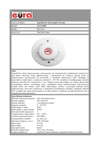 Nazwa produktu: Sygnalizator dymu papierosowego Model: ALG-61B8 Indeks: B83A161 Kod EAN: 5905548273068 Opis: Sygnalizator dymu papierosowego, przeznaczony do monitorowania zamkniętych pomieszczeń pod kątem obecności dymu papierosowego i alarmowania po wykryciu takiego dymu w pomieszczeniu, przeznaczony do stosowania z centralami alarmowymi, które obsługują 4przewodowe czujki dymu z systemem zasilania 9…33V DC, dodatkowo współpracująca centrala alarmowa powinna być wyposażona w tzw. funkcję resetu (pozwalającą na szybkie skasowanie ewentualnego alarmu wywołanego przez sygnalizator dymu papierosowego), foto-optyczny czujnik dymu oraz bardzo czuły układ zapewniający szybką i precyzyjną detekcję dymu papierosowego, może być instalowany w budynkach mieszkalnych, szkołach, szpitalach, biurach oraz wszędzie tam, gdzie przestrzegany jest zakaz palenia. Urządzenie posiada możliwość testu i sygnalizację braku sprawności. Specyfikacja techniczna: Rodzaje wykrywanych gazów: Rodzaj czujnika: Rodzaj zasilania: Napięcie zasilania: Pobór prądu w stanie Pobór prądu w stanie alarmu: Ilość przewodów łączących: Temperaturowy zakres pracy: Czułość wykrywania dymu: Zasięg detekcji czujnika: Wymiary (średnica x wys.): Masa netto: Masa brutto: Typ opakowania: Wymiary opakowania: Funkcje dodatkowe: dym, dym papierosowy foto-optyczny z zewnętrznej centrali 9…33V DC 20μA 30mA 4 0°C...+40°C 0,03 dB/m ok. 20-25 m2 100 x 48 (mm) 0,13 kg 0,19 kg karton 155 x 105 x 50 (mm) możliwość testu urządzenia, sygnalizacja braku sprawności