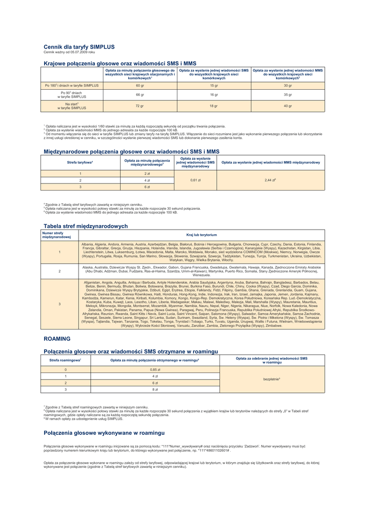 Cennik dla taryfy SIMPLUS Cennik ważny od 05.07.2009 roku Krajowe połączenia głosowe oraz wiadomości SMS i MMS Opłata za minutę połączenia głosowego do wszystkich sieci krajowych stacjonarnych i komórkowych1 Opłata za wysłanie jednej wiadomości SMS do wszystkich krajowych sieci komórkowych Opłata za wysłanie jednej wiadomości MMS do wszystkich krajowych sieci komórkowych2 Po 1803 i dniach w taryfie SIMPLUS 60 gr 15 gr 30 gr Po 903 dniach w taryfie SIMPLUS 66 gr 16 gr 35 gr Na start3 w taryfie SIMPLUS 72 gr 18 gr 40 gr 1 Opłata naliczana jest w wysokości 1/60 stawki za minutę za każdą rozpoczętą sekundę od początku trwania połączenia. Opłata za wysłanie wiadomości MMS do jednego adresata za każde rozpoczęte 100 kB. Od momentu włączenia się do sieci w taryfie SIMPLUS lub zmiany taryfy na taryfę SIMPLUS. Włączenie do sieci rozumiane jest jako wykonanie pierwszego połączenia lub skorzystanie z innej usługi określonej w cenniku, w szczególności wysłanie pierwszej wiadomości SMS lub dokonanie pierwszego zasilenia konta. 2 3 Międzynarodowe połączenia głosowe oraz wiadomości SMS i MMS 4 5 6 Strefa taryfowa4 Opłata za minutę połączenia międzynarodowego5 1 2 zł 2 4 zł 3 6 zł Opłata za wysłanie jednej wiadomości SMS międzynarodowy Opłata za wysłanie jednej wiadomości MMS międzynarodowy 0,61 zł 2,44 zł6 Zgodnie z Tabelą stref taryfowych zawartą w niniejszym cenniku. Opłata naliczana jest w wysokości połowy stawki za minutę za każde rozpoczęte 30 sekund połączenia. Opłata za wysłanie wiadomości MMS do jednego adresata za każde rozpoczęte 100 kB. Tabela stref międzynarodowych Numer strefy międzynarodowej Kraj lub terytorium 1 Albania, Algieria, Andora, Armenia, Austria, Azerbejdżan, Belgia, Białoruś, Bośnia i Hercegowina, Bułgaria, Chorwacja, Cypr, Czechy, Dania, Estonia, Finlandia, Francja, Gibraltar, Grecja, Gruzja, Hiszpania, Holandia, Irlandia, Islandia, Jugosławia (Serbia i Czarnogóra), Kanaryjskie (Wyspy), Kazachstan, Kirgistan, Libia, Liechtenstein, Litwa, Luksemburg, Łotwa, Macedonia, Malta, Maroko, Mołdawia, Monako, sieć wydzielona COMINCOM (Moskwa), Niemcy, Norwegia, Owcze (Wyspy), Portugalia, Rosja, Rumunia, San Marino, Słowacja, Słowenia, Szwajcaria, Szwecja, Tadżykistan, Tunezja, Turcja, Turkmenistan, Ukraina, Uzbekistan, Watykan, Węgry, Wielka Brytania, Włochy. 2 Alaska, Australia, Dziewicze Wyspy St. Zjedn., Ekwador, Gabon, Gujana Francuska, Gwadelupa, Gwatemala, Hawaje, Kanada, Zjednoczone Emiraty Arabskie (Abu Dhabi, Adżman, Dubai, Fudżaira, Ras-al-Haima, Szardża, Umm-al-Kaiwan), Martynika, Puerto Rico, Somalia, Stany Zjednoczone Ameryki Północnej, Wenezuela. 3 Afganistan, Angola, Anguilla, Antiqua i Barbuda, Antyle Holenderskie, Arabia Saudyjska, Argentyna, Aruba, Bahama, Bahrajn, Bangladesz, Barbados, Belau, Belize, Benin, Bermudy, Bhutan, Boliwia, Botswana, Brazylia, Brunei, Burkina Faso, Burundi, Chile, Chiny, Cooka (Wyspy), Czad, Diego Garcia, Dominika, Dominikana, Dziewicze Wyspy Brytyjskie, Dżibuti, Egipt, Erytrea, Etiopia, Falklandy, Fidżi, Filipiny, Gambia, Ghana, Grenada, Grenlandia, Guam, Gujana, Gwinea, Gwinea Bissau, Gwinea Równikowa, Haiti, Honduras, Hong-Kong, Indie, Indonezja, Irak, Iran, Izrael, Jamajka, Japonia, Jemen, Jordania, Kajmany, Kambodża, Kamerun, Katar, Kenia, Kiribati, Kolumbia, Komory, Kongo, Kongo-Rep. Demokratyczna, Korea Południowa, Koreańska Rep. Lud.-Demokratyczna, Kostaryka, Kuba, Kuwejt, Laos, Lesotho, Liban, Liberia, Madagaskar, Makau, Malawi, Malediwy, Malezja, Mali, Marshalla (Wyspy), Mauretania, Mauritius, Meksyk, Mikronezja, Mongolia, Montserrat, Mozambik, Myanmar, Namibia, Nauru, Nepal, Niger, Nigeria, Nikaragua, Niue, Norfolk, Nowa Kaledonia, Nowa Zelandia, Oman, Pakistan, Panama, Papua (Nowa Gwinea), Paragwaj, Peru, Polinezja Francuska, Republika Południowej Afryki, Republika ŚrodkowoAfrykańska, Reunion, Rwanda, Saint Kitts i Nevis, Saint Lucia, Saint Vincent, Saipan, Salomona (Wyspy), Salwador, Samoa Amerykańskie, Samoa Zachodnie, Senegal, Seszele, Sierra Leone, Singapur, Sri Lanka, Sudan, Surinam, Swaziland, Syria, Św. Heleny (Wyspa), Św. Piotra i Mikelona (Wyspy), Św. Tomasza (Wyspa), Tajlandia, Tajwan, Tanzania, Togo, Tokelau, Tonga, Trynidad i Tobago, Turks, Tuvalu, Uganda, Urugwaj, Wallis i Futuna, Wietnam, Wniebowstąpienia (Wyspy), Wybrzeże Kości Słoniowej, Vanuatu, Zanzibar, Zambia, Zielonego Przylądka (Wyspy), Zimbabwe. ROAMING Połączenia głosowe oraz wiadomości SMS otrzymane w roamingu Strefa roamingowa7 Opłata za minutę połączenia otrzymanego w roamingu8 0 0,85 zł 1 4 zł 2 6 zł 3 8 zł Opłata za odebranie jednej wiadomości SMS w roamingu bezpłatnie9 7 Zgodnie z Tabelą stref roamingowych zawartą w niniejszym cenniku. Opłata naliczana jest w wysokości połowy stawki za minutę za każde rozpoczęte 30 sekund połączenia z wyjątkiem krajów lub terytoriów należących do strefy „0” w Tabeli stref roamingowych, gdzie opłaty naliczane są za każdą rozpoczętą sekundę połączenia. 9 W ramach opłaty za udostępnienie usług SIMPLUS. 8 Połączenia głosowe wykonywane w roamingu Połączenia głosowe wykonywane w roamingu inicjowane są za pomocą kodu: *111*Numer_wywoływany# oraz naciśnięciu przycisku ‘Zadzwoń’. Numer wywoływany musi być poprzedzony numerem kierunkowym kraju lub terytorium, do którego wykonywane jest połączenie, np. *111*48601102601# . Opłata za połączenie głosowe wykonane w roamingu zależy od strefy taryfowej, odpowiadającej krajowi lub terytorium, w którym znajduje się Użytkownik oraz strefy taryfowej, do której wykonywane jest połączenie (zgodnie z Tabelą stref taryfowych zawartą w niniejszym cenniku). Opłaty za minutę połączenia wykonanego w roamingu wynoszą:10 Użytkownik dzwoni do strefy roamingowej Użytkownik jest w strefie roamingowej 0 1 2 3 do Polski 1,79 zł 4 zł 6 zł 8 zł 0 1,79 zł 4 zł 6 zł 8 zł 1 4 zł 4 zł 6 